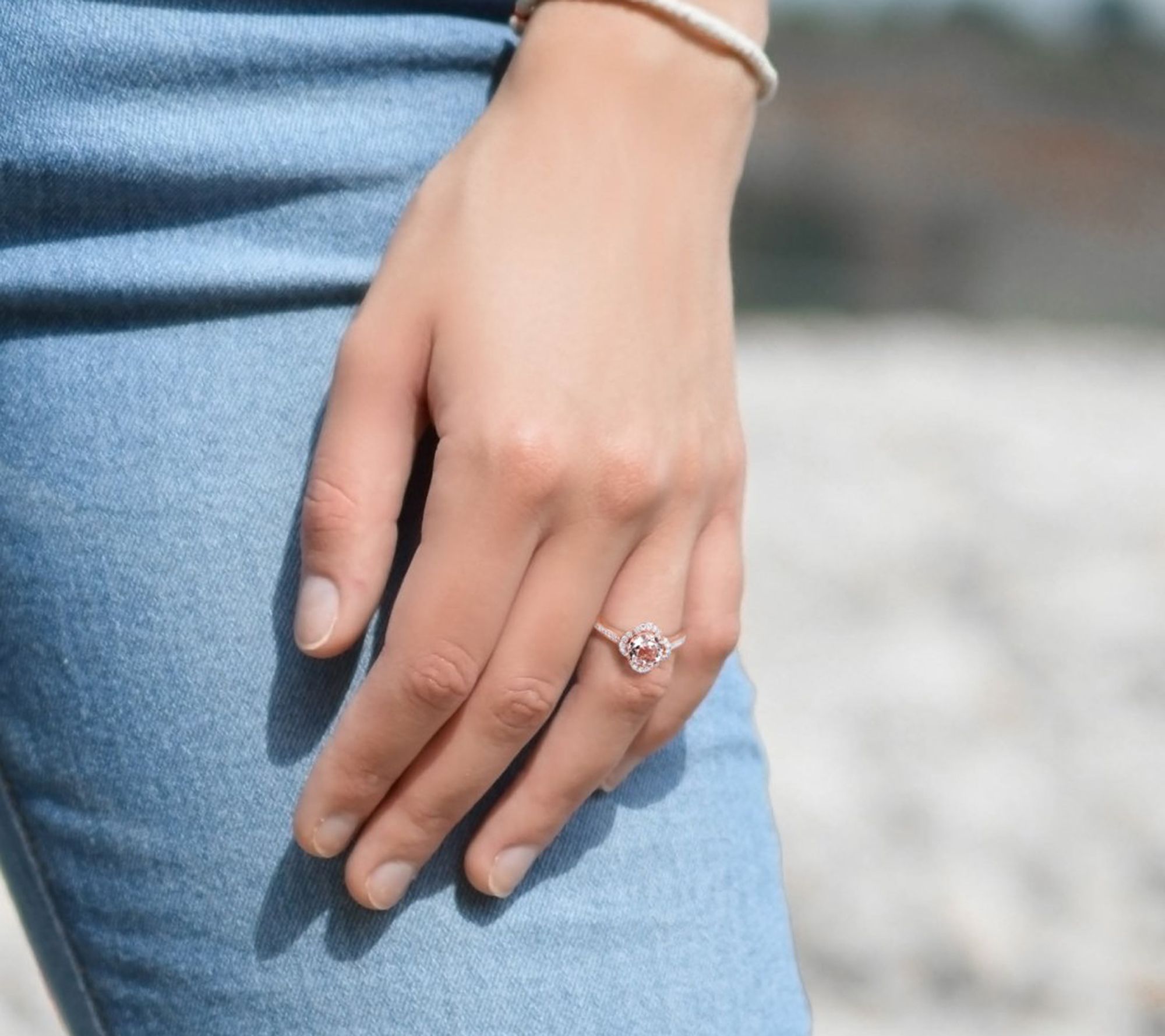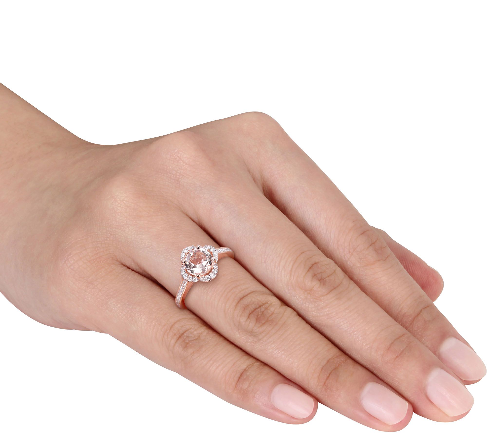 - Engagement ring with round-cut, prong-set morganite center; round, white diamond side gemstones