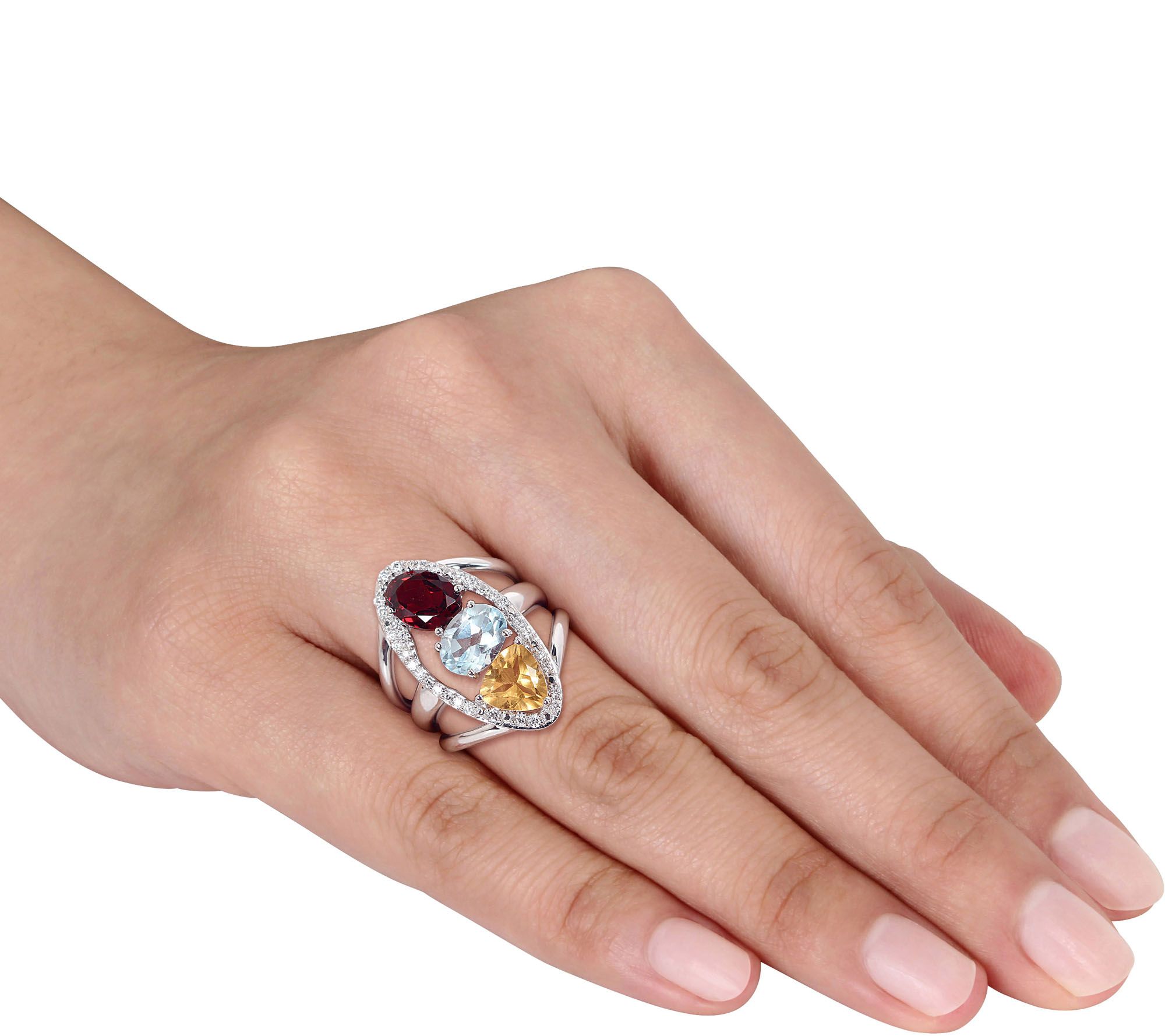 Split shank ring with prong-set oval garnet, trilliant-cut citrine, and oval blue topaz gemstones in vertical center; round diamonds outline the center design