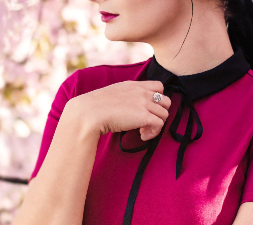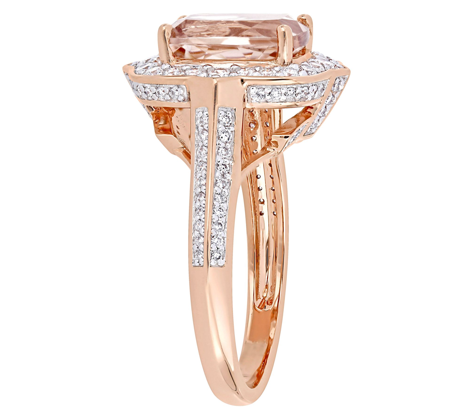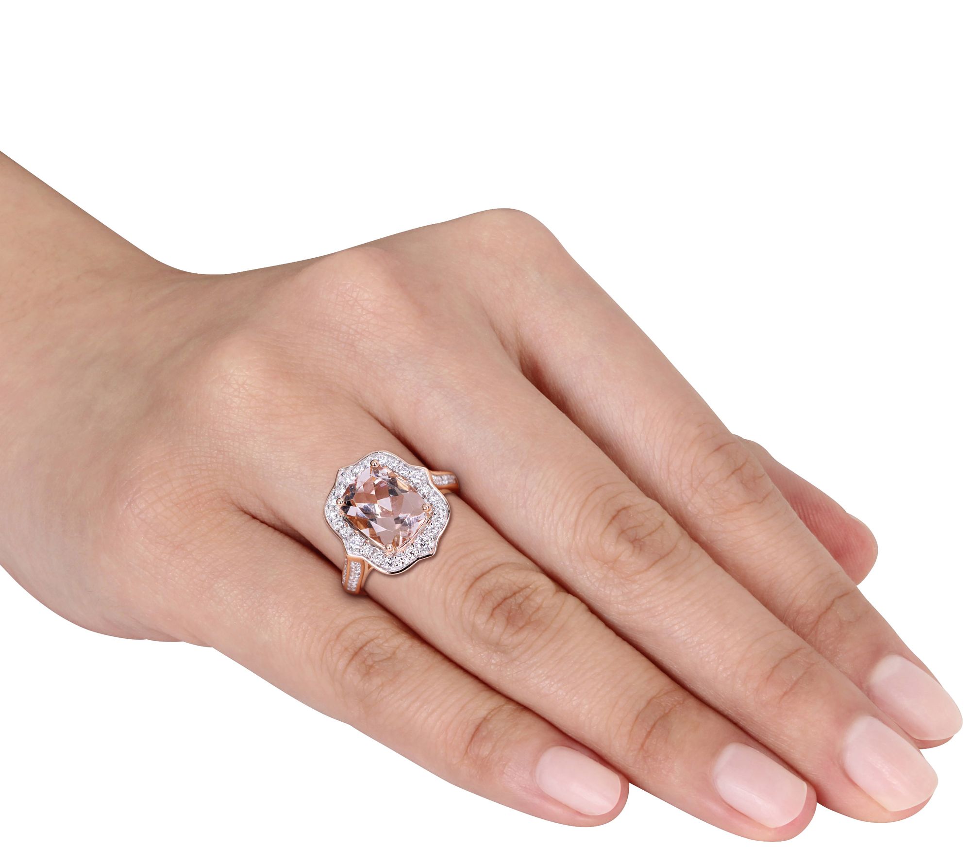 - Cushion-cut, prong-set morganite center with round, white diamond side stones