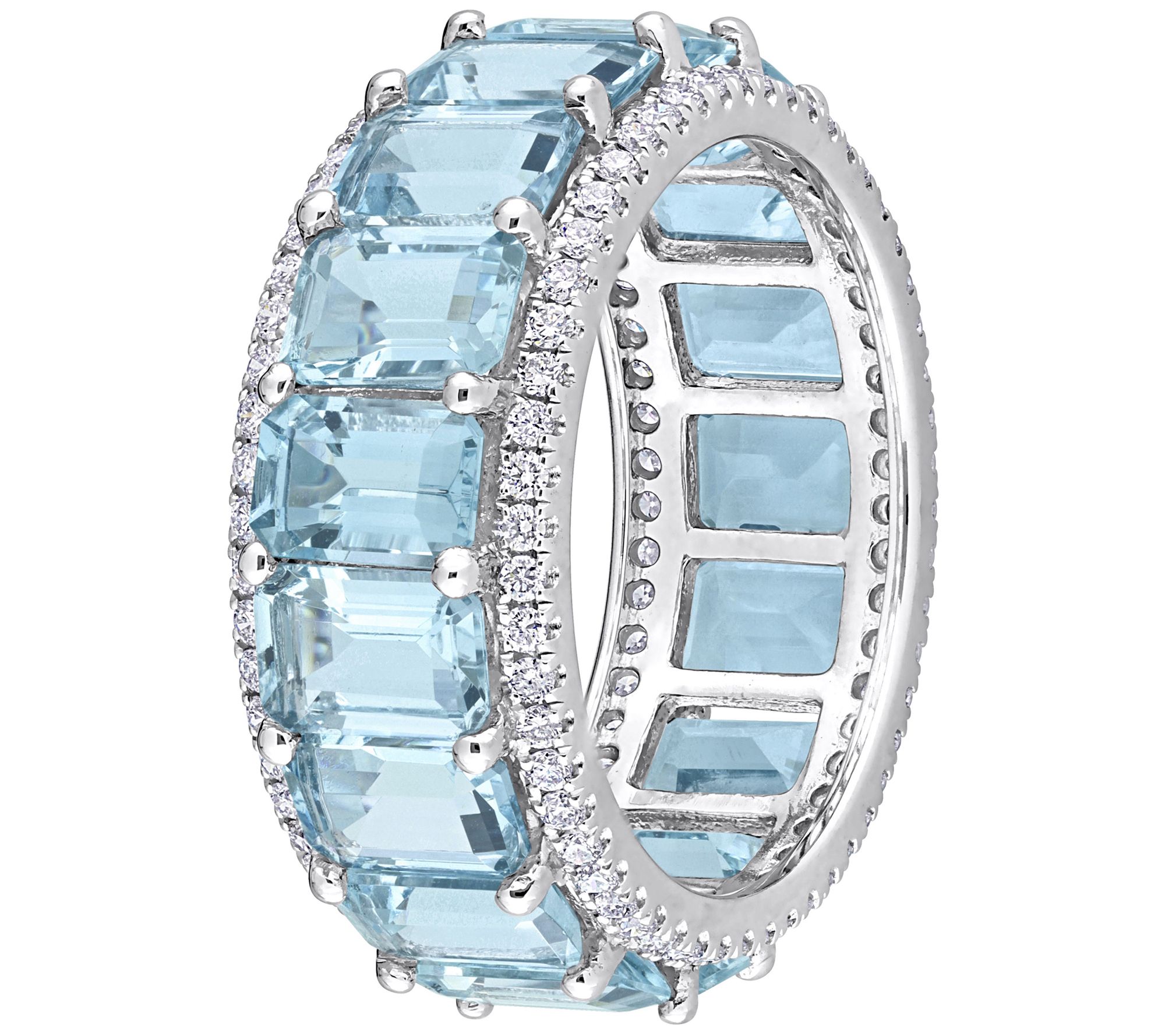 Full eternity design with octagon-cut prong-set aquamarine gemstones; round, prong-set diamonds on sides; polished finish