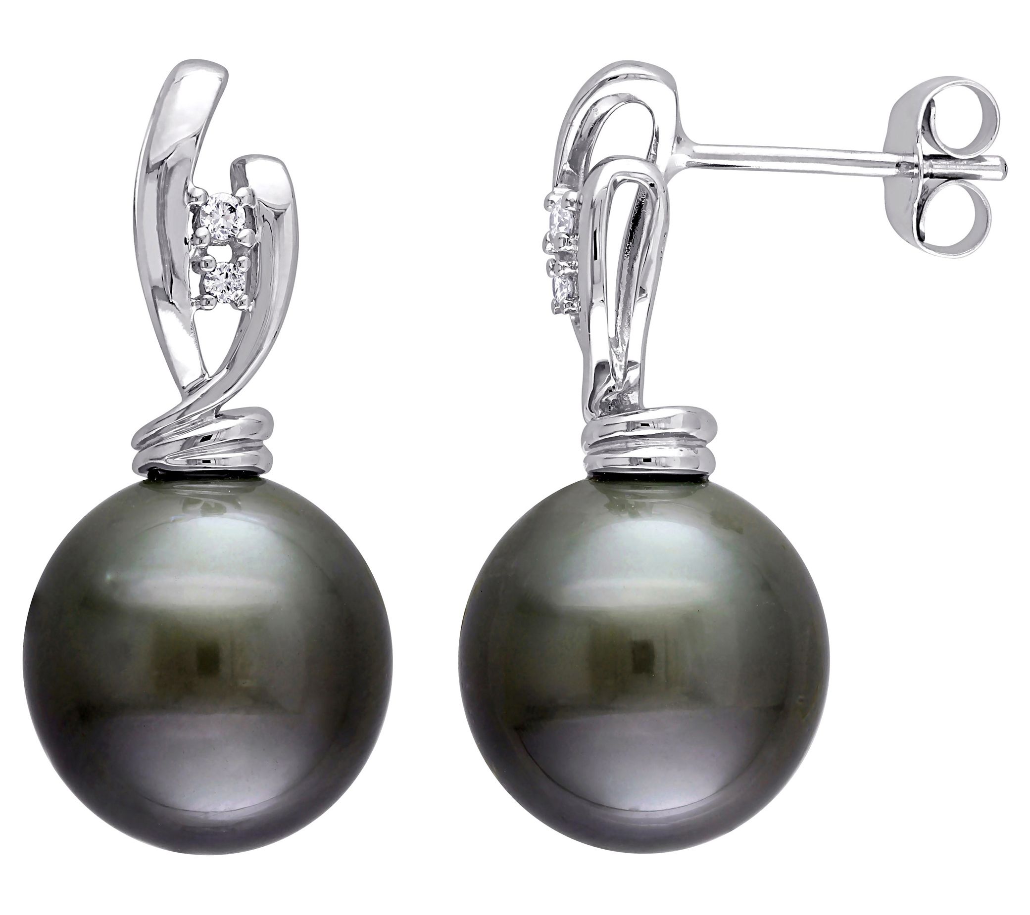 • Round-cut, prong-set diamonds; round, black Tahitian cultured pearls; polished finish