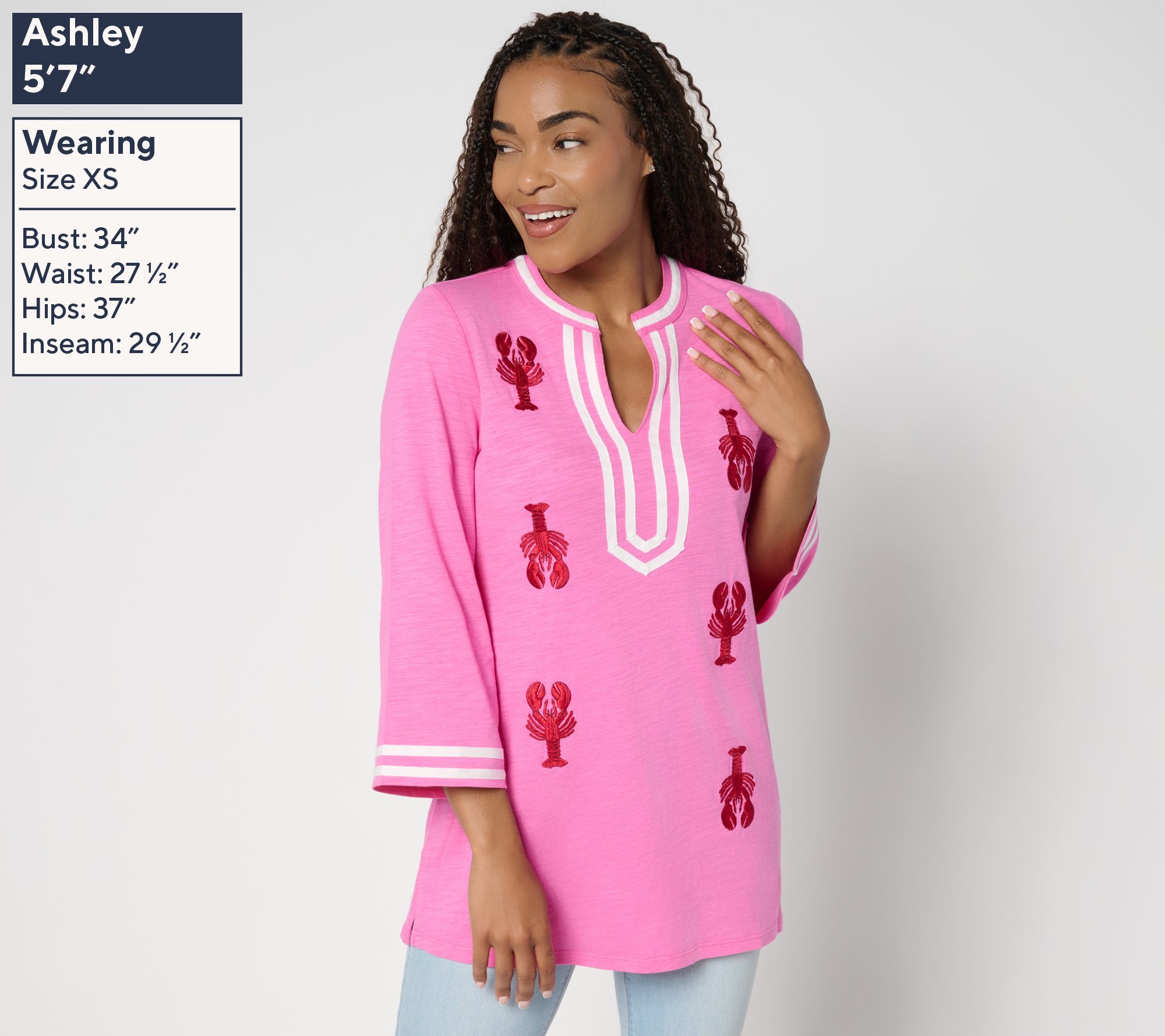 You'll love every moment in this slub-knit top with its embroidered details reminiscent of a beachside breeze. The split-neck design offers a relaxed yet chic touch, making it perfect for coastal outings or simply feeling like you're on vacation. Its side slits lend a playful twist, ideal for pairing with your favorite capris or shorts as you stroll in the sun. From Bellisima by Kim Gravel.
