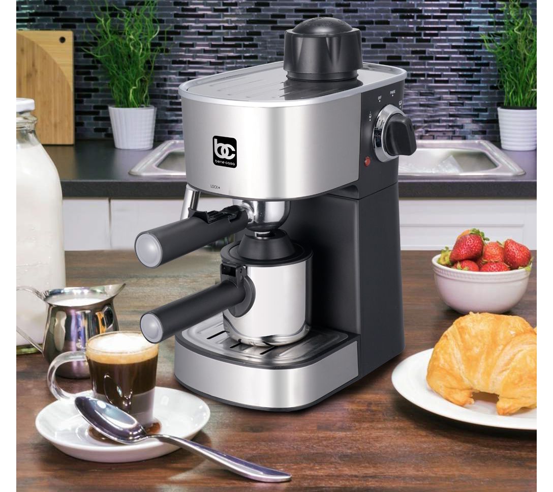With a sleek stainless steel and black finish, this compact 4-cup espresso maker features a simple dial selector to switch between brewing and frothing, a durable carafe, and a removable and washable drip tray that's easy to clean. From Bene Casa.