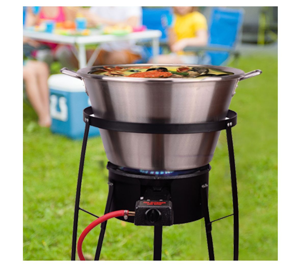 Whether you're enjoying a campsite cookout or a backyard BBQ, this cast iron burner has you covered, with adjustable flame controls for versatile cooking on the move and an included pressure regulator. From Bene Casa.