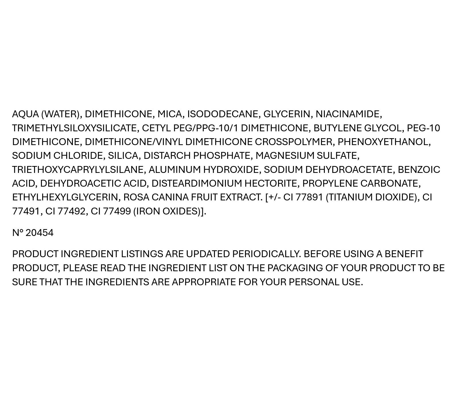 Visibly smooth the appearance of texture and refine the look of pores instantly with this hydrating foundation from Benefit Cosmetics. The POREfessional Blurring & Smoothing Foundation with Niacinamide offers medium weightless coverage with a matte finish. It helps to smooth and blur the look of your skin and improve the look of your pores. Formulated with niacinamide, rose hip extract, and glycerin.
