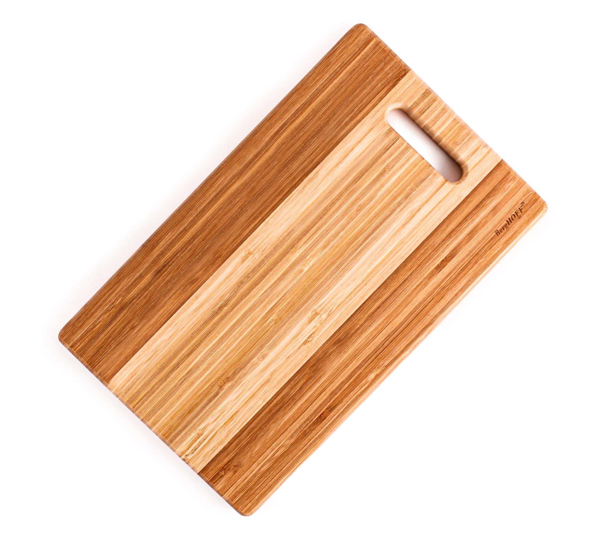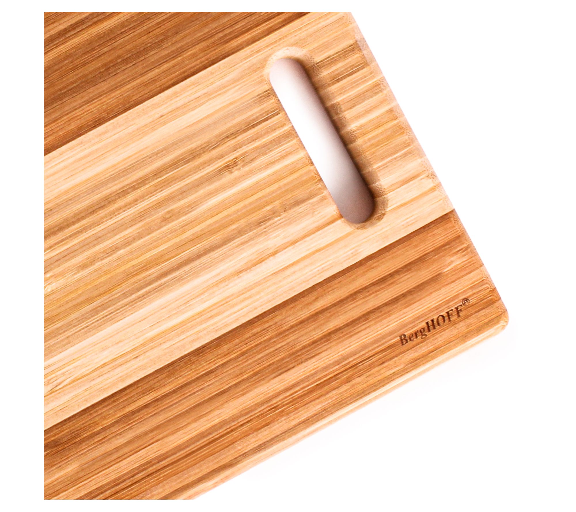 Whether you're slicing veggies for dinner or serving up an array of appetizers, this two-piece bamboo cutting board set from BergHOFF has you covered. Its two-tone design and natural bamboo finish elevate any kitchen setting. With ample space for all your culinary prep and a convenient hanging loop for easy storage, it's both functional and stylish. From BergHOFF.