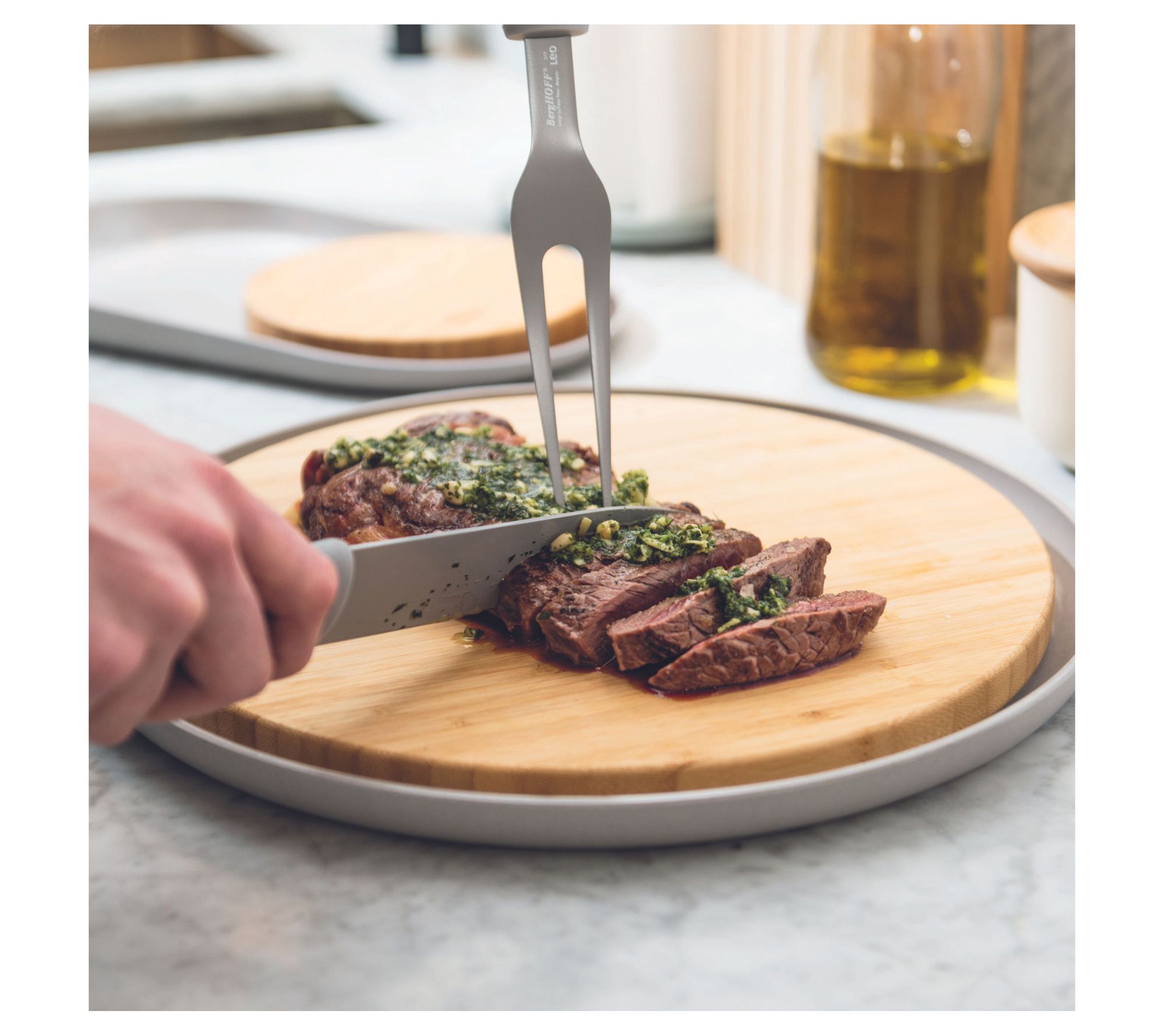 Experience precision with this carving knife designed to glide through your Sunday roasts effortlessly. This knife features a razor-sharp stainless steel blade with a nonstick coating, ensuring that food doesn't cling to the knife. The ergonomic handle provides a comfortable grip for those precise cuts. Complete with a protective sleeve for safety and blade preservation, it's a stylish addition to any kitchen. From BergHOFF.