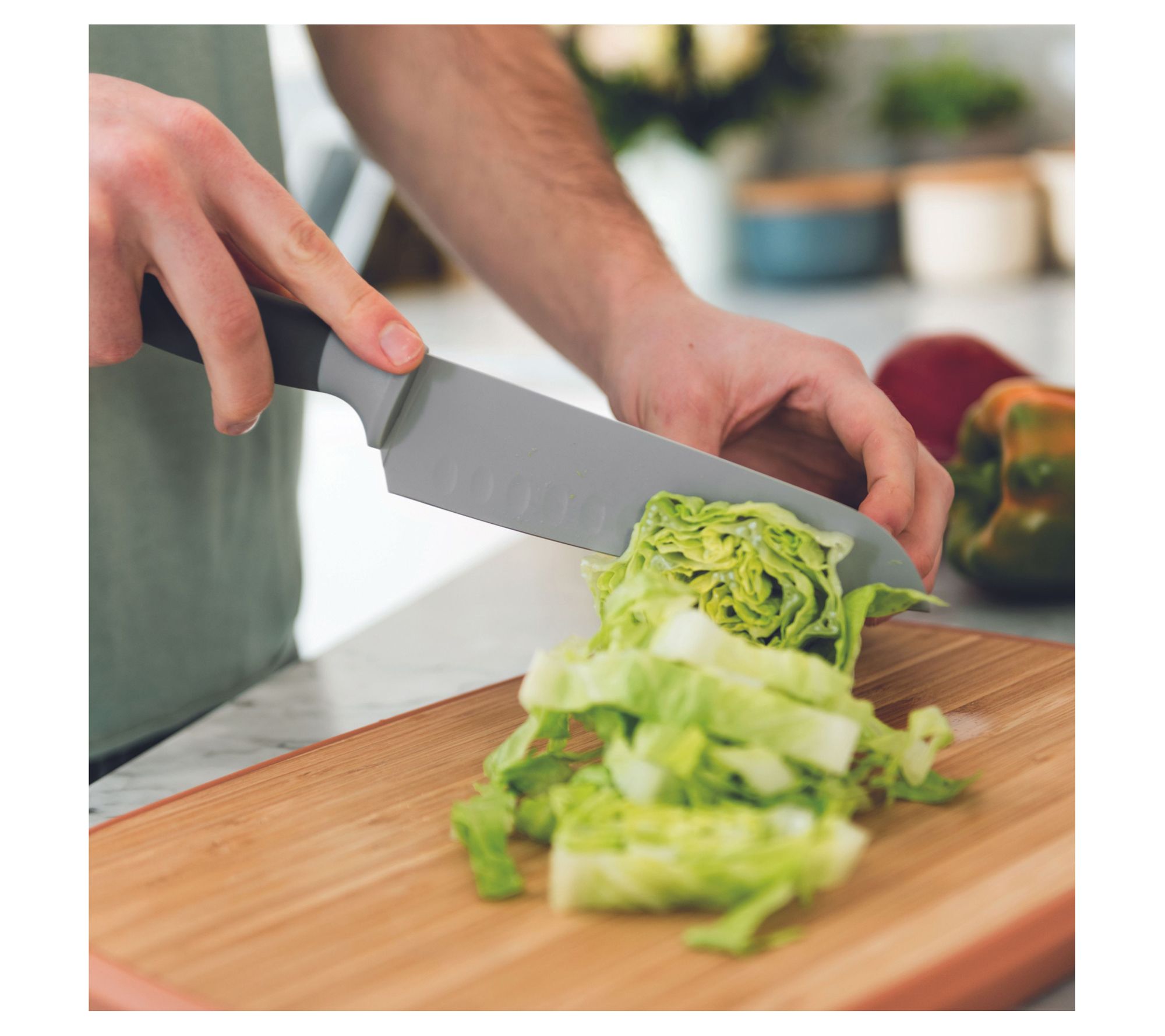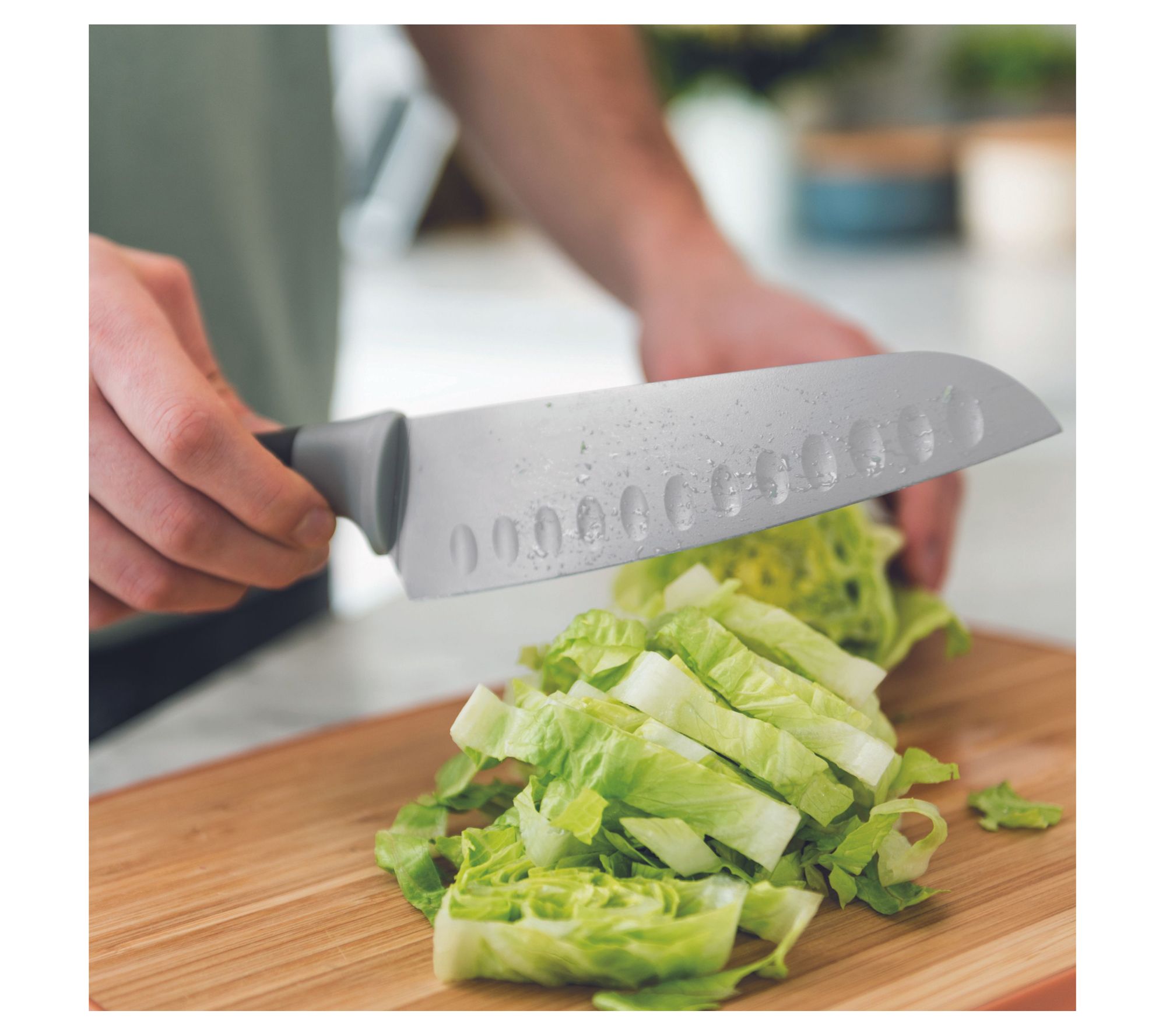 Experience precision cutting with this innovative santoku knife. Its wide blade is perfect for a variety of kitchen tasks, from chopping vegetables to making thin slices for a clean-cut result. The non-stick coating, complemented by little ridges, ensures ingredients won't stick. Crafted with an ergonomically designed soft-touch handle, this knife is easy to grip and enhances your cooking efficiency. From BergHOFF.