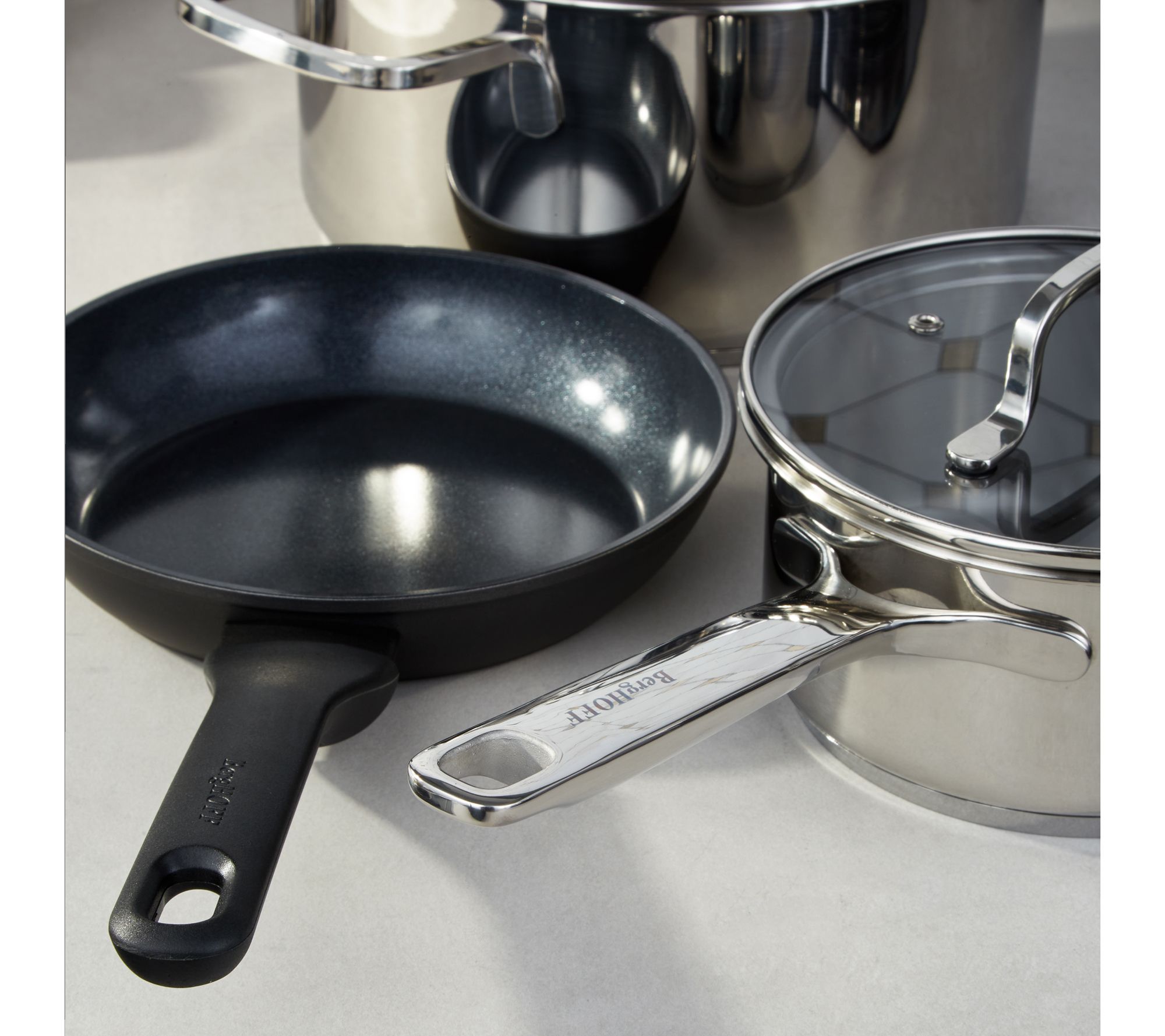 Includes 1.6-qt 6.5" saucepan, 3.2-qt 8" stockpot, 6.6-qt 10" stockpot, 9.5" fry pan, 8" nonstick fry pan, 9.5" nonstick grill pan, and three glass lids