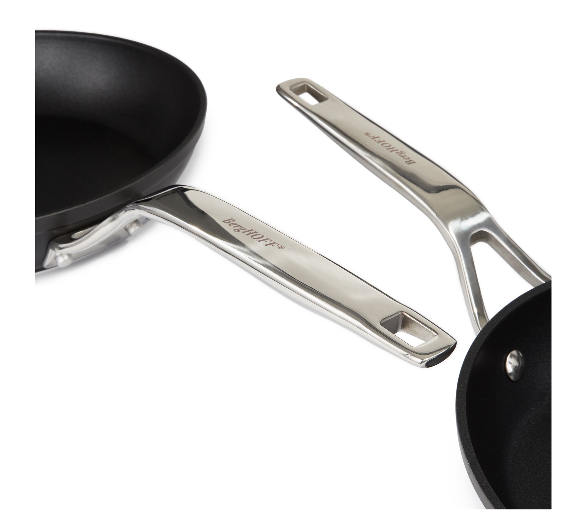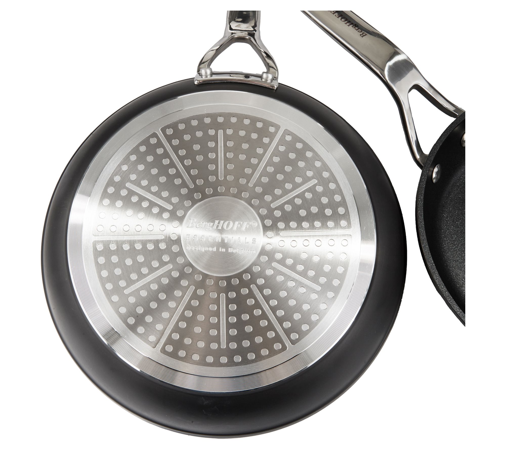 Elevate your culinary creations with the BergHOFF Essentials 10-pc Non-stick Hard Anodized Cookware Set, designed to combine exceptional functionality with bold aesthetics. Experience the joy of cooking with a set that features BergHOFF's FernoGreen nonstick coating, ensuring healthier cooking without the need for oil and effortless cleaning. Constructed from hard-anodized aluminum, this set guarantees rapid and even heat distribution, enhancing your cooking efficiency. The polished stainless steel handles offer a secure grip, while the glass lids equipped with steam vents allow for convenient monitoring of your dishes. Perfect for a variety of cooking surfaces including induction, and oven-safe up to 450F, this cookware set is a versatile addition to any kitchen. From BergHOFF.