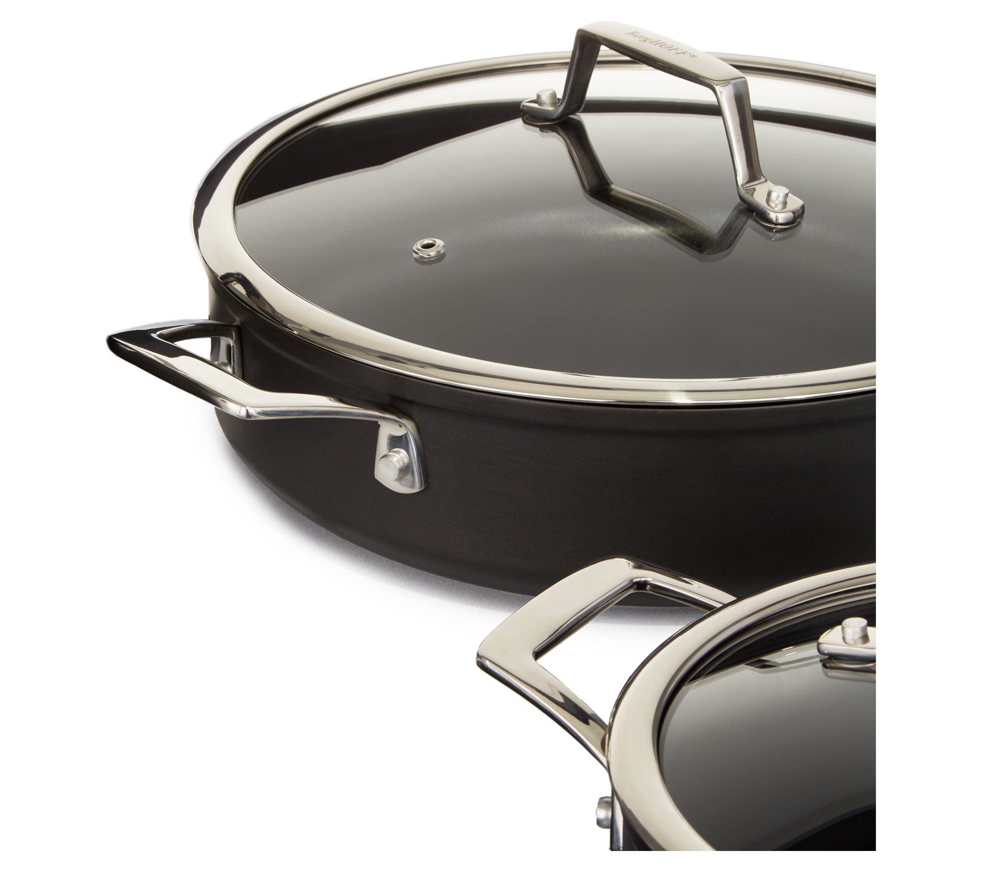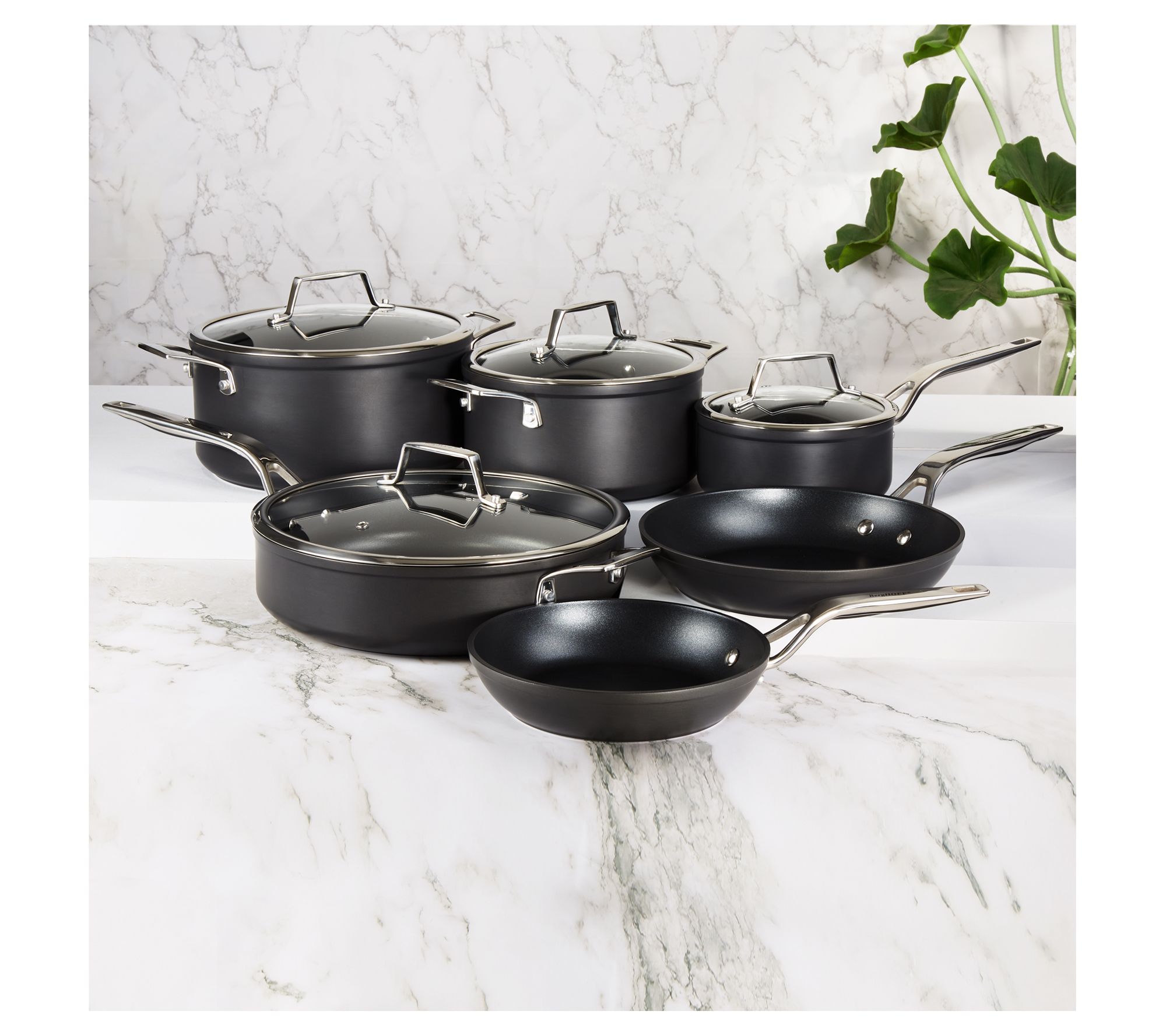 Includes 8" frying pan, 10" frying pan, 6.25" saucepan, 3.3-qt stockpot, 5.3-qt stockpot, 11" deep skillet, and four glass lids