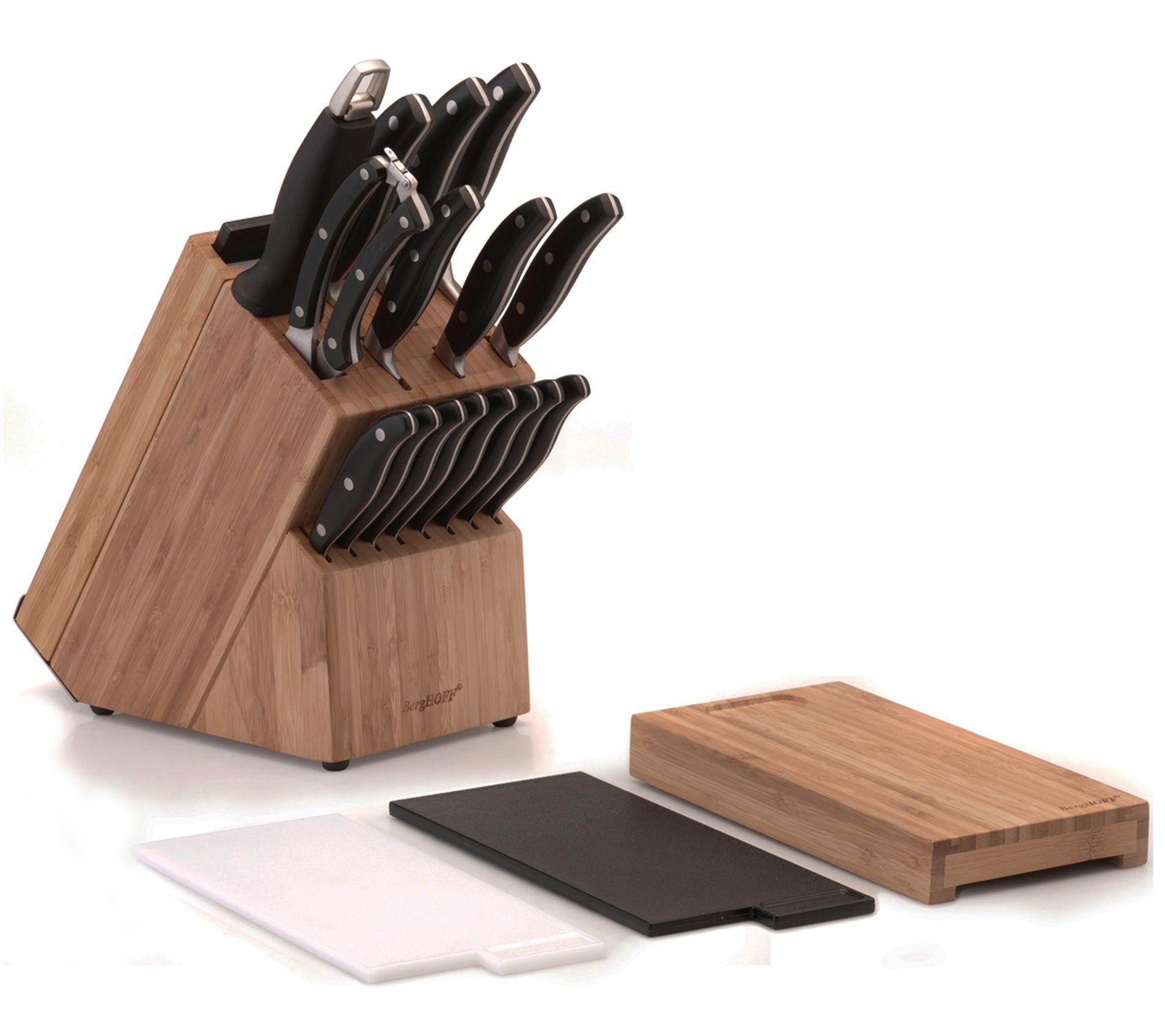 Cover your basics (and enjoy some nice little bonus items too) with this 20-piece knife block featuring an assortment of versatile prep knives, eight steak knives, sharpening steel, and three cutting boards. From BergHOFF.