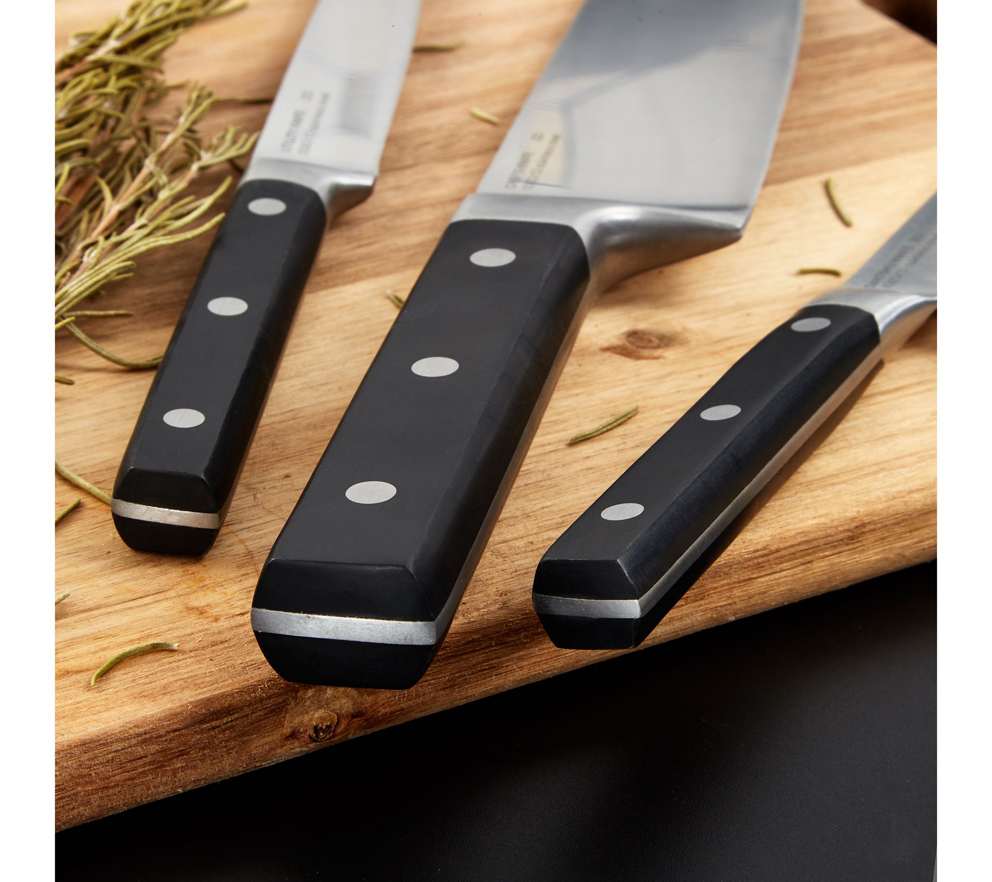 • Includes 8" Chef's Knife, 8" Bread Knife, 8" Carving Knife, 7" Santoku Knife, 10" Poultry Shears, 5" Utility Knife, 3.5" Paring Knife
