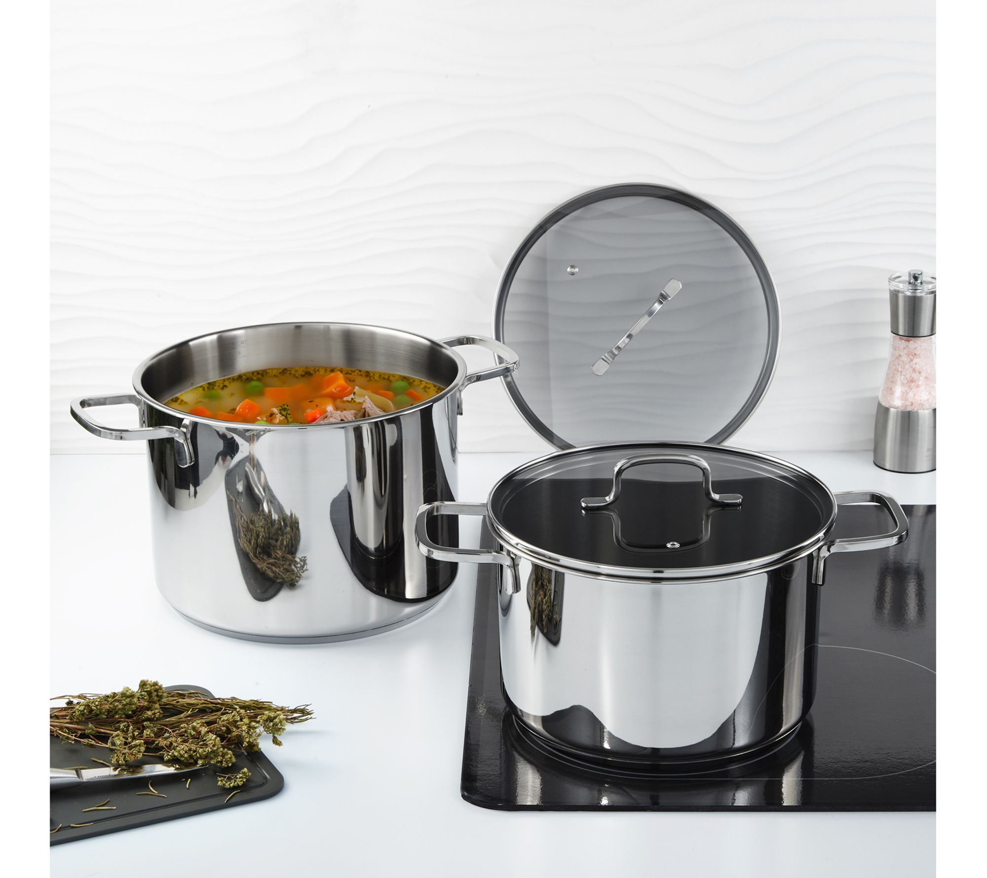 • Includes 9.5" stockpot (7 qt.), 10.25" stockpot (10.6 qt.), 2x glass lids