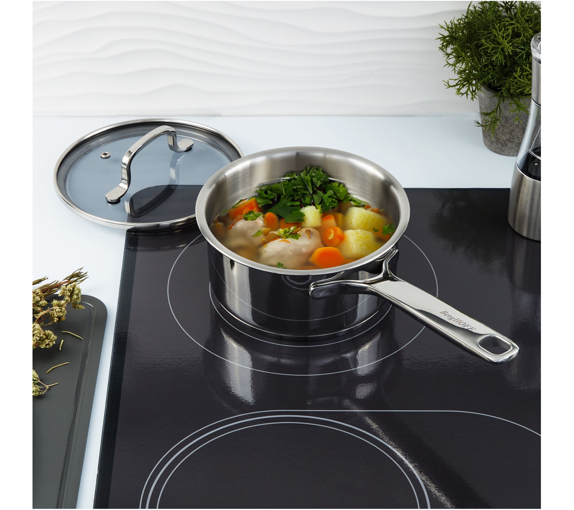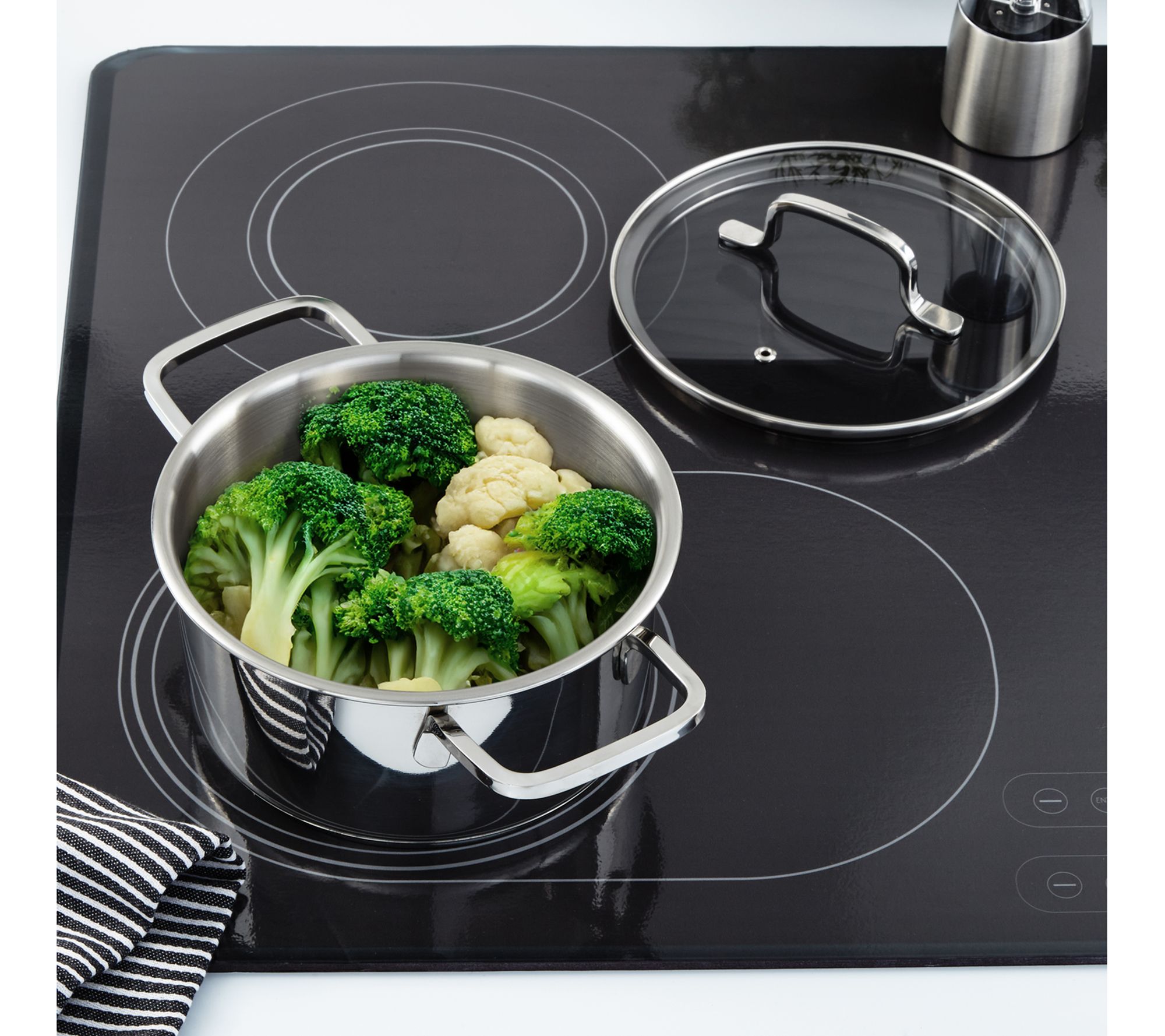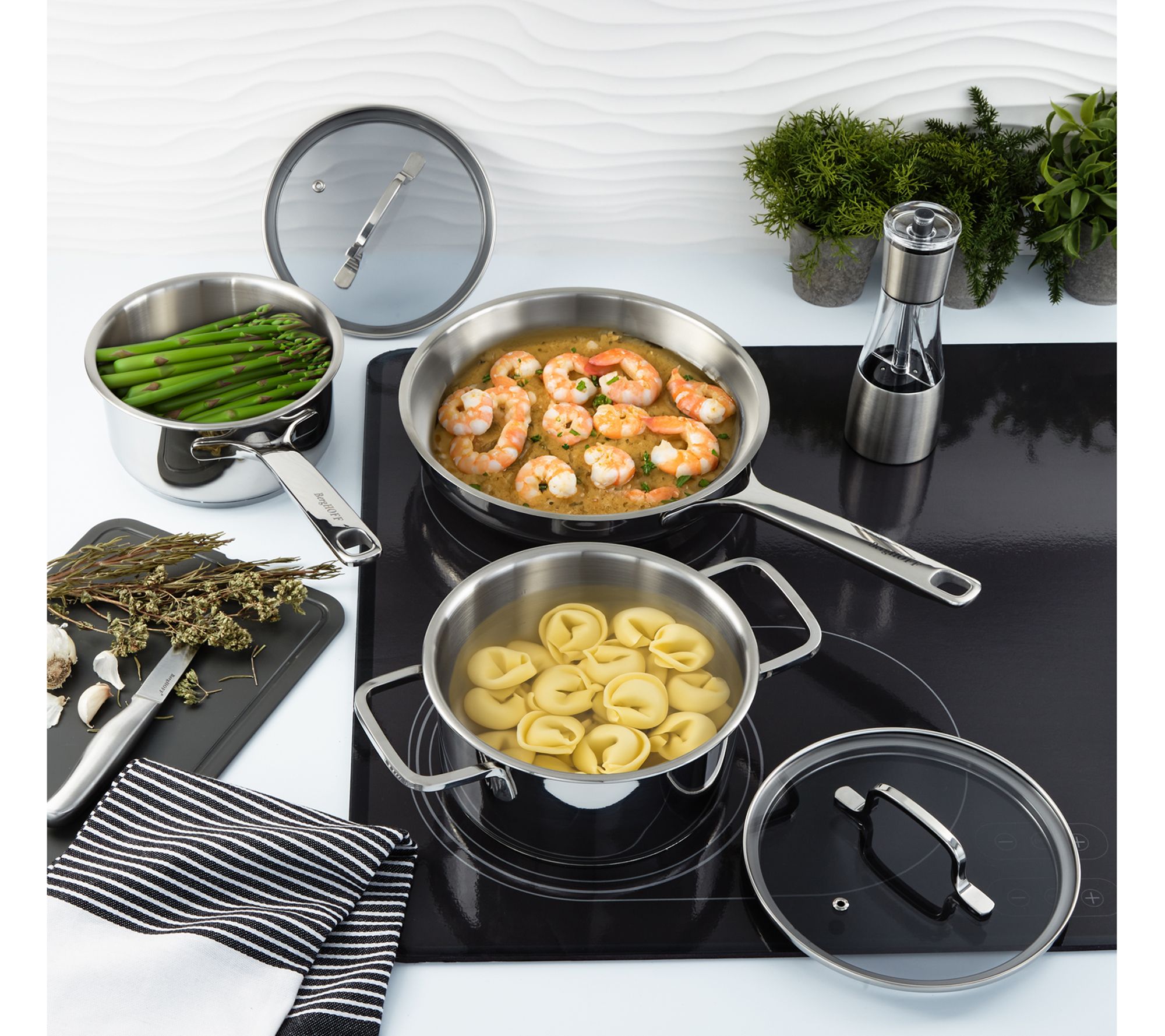 • Includes 6.5" saucepan (1.6 qt), 7.25" stockpot (2.2 qt), 9.5" fry pan (2.3 qt), and two glass lids