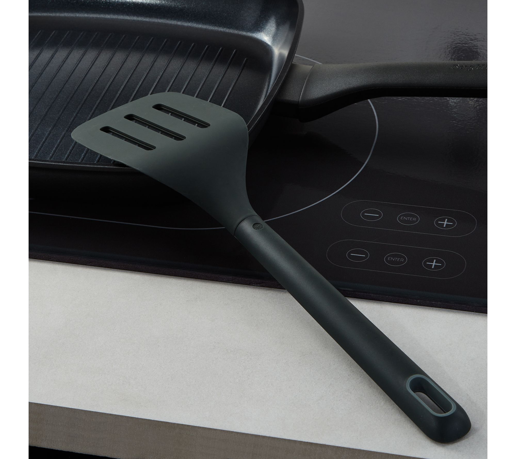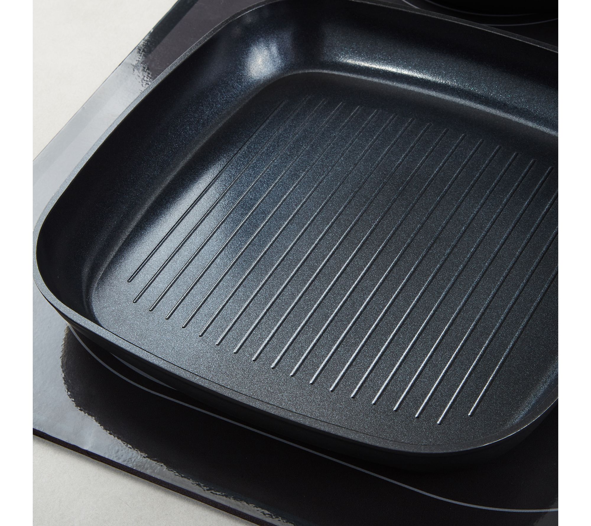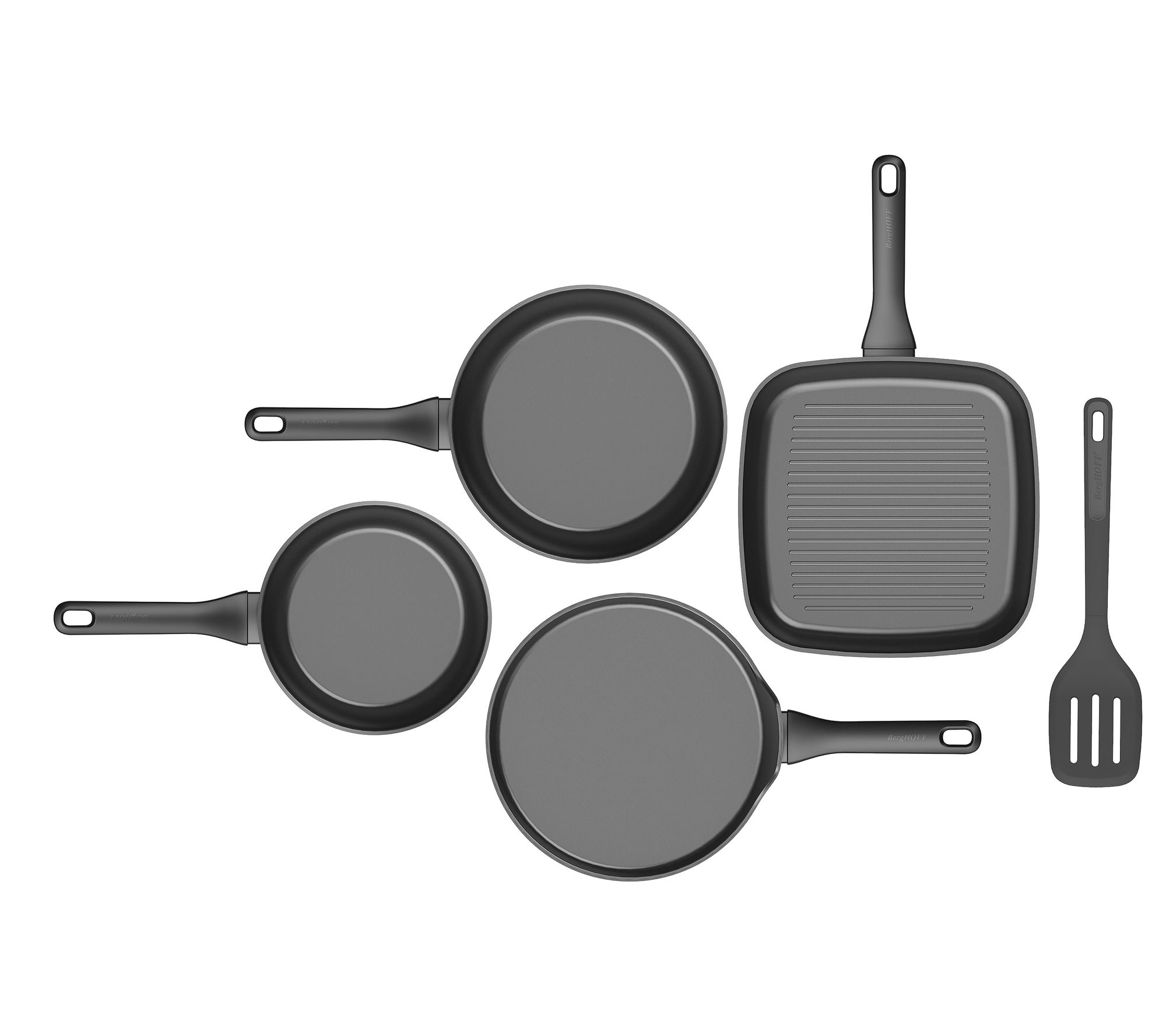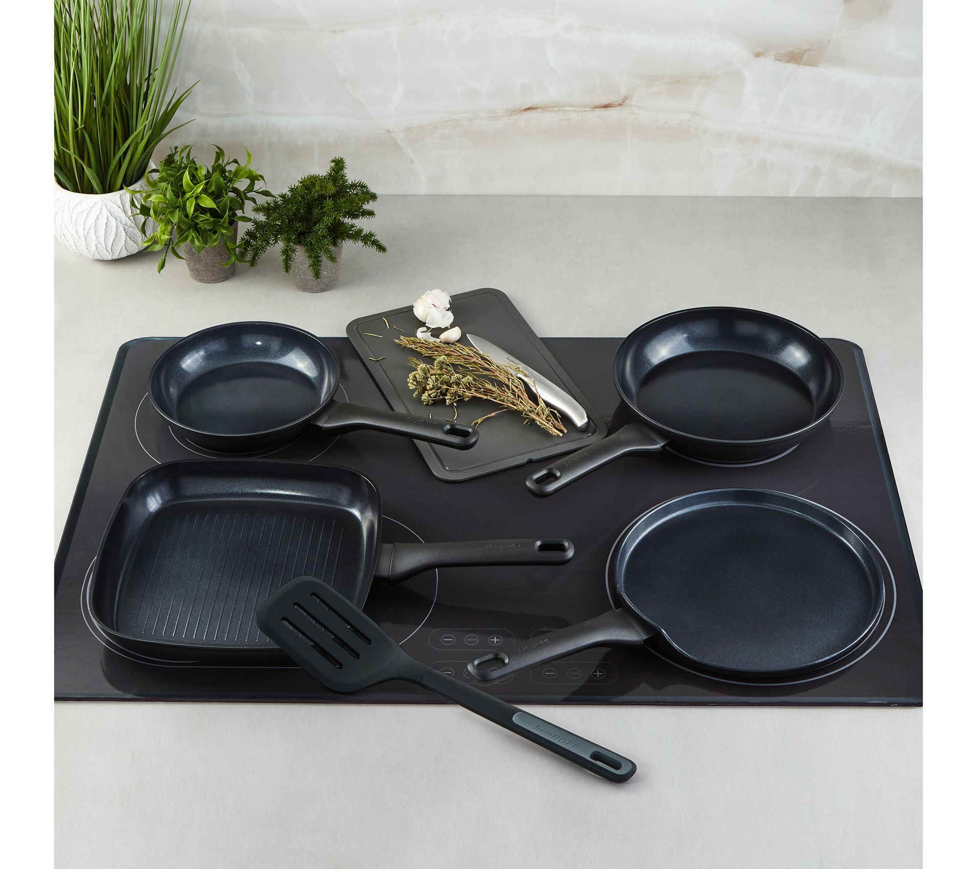 • Includes 8" fry pan, 9.5" fry pan, 10.25" grill pan, 10" pancake pan, and slotted turner