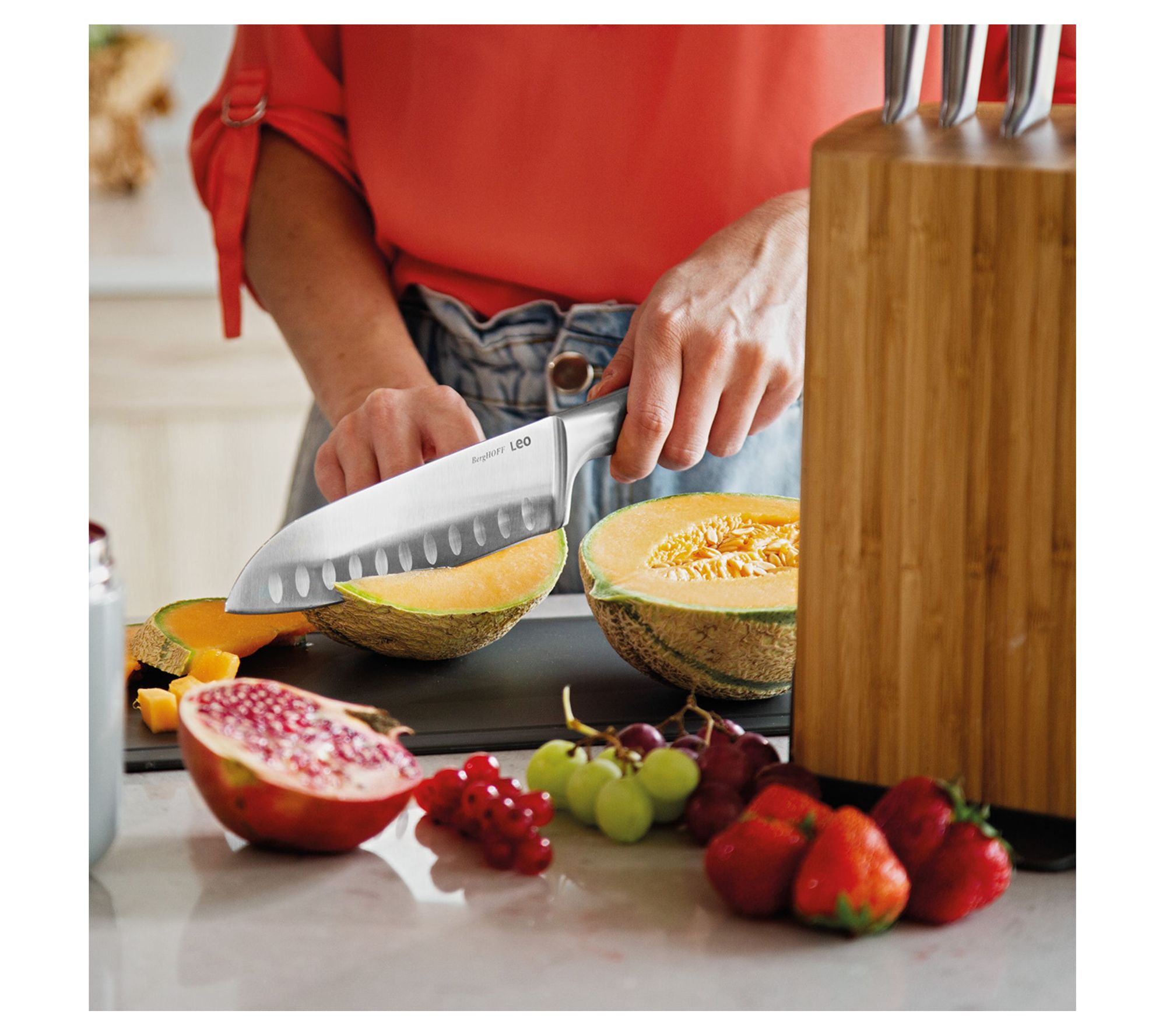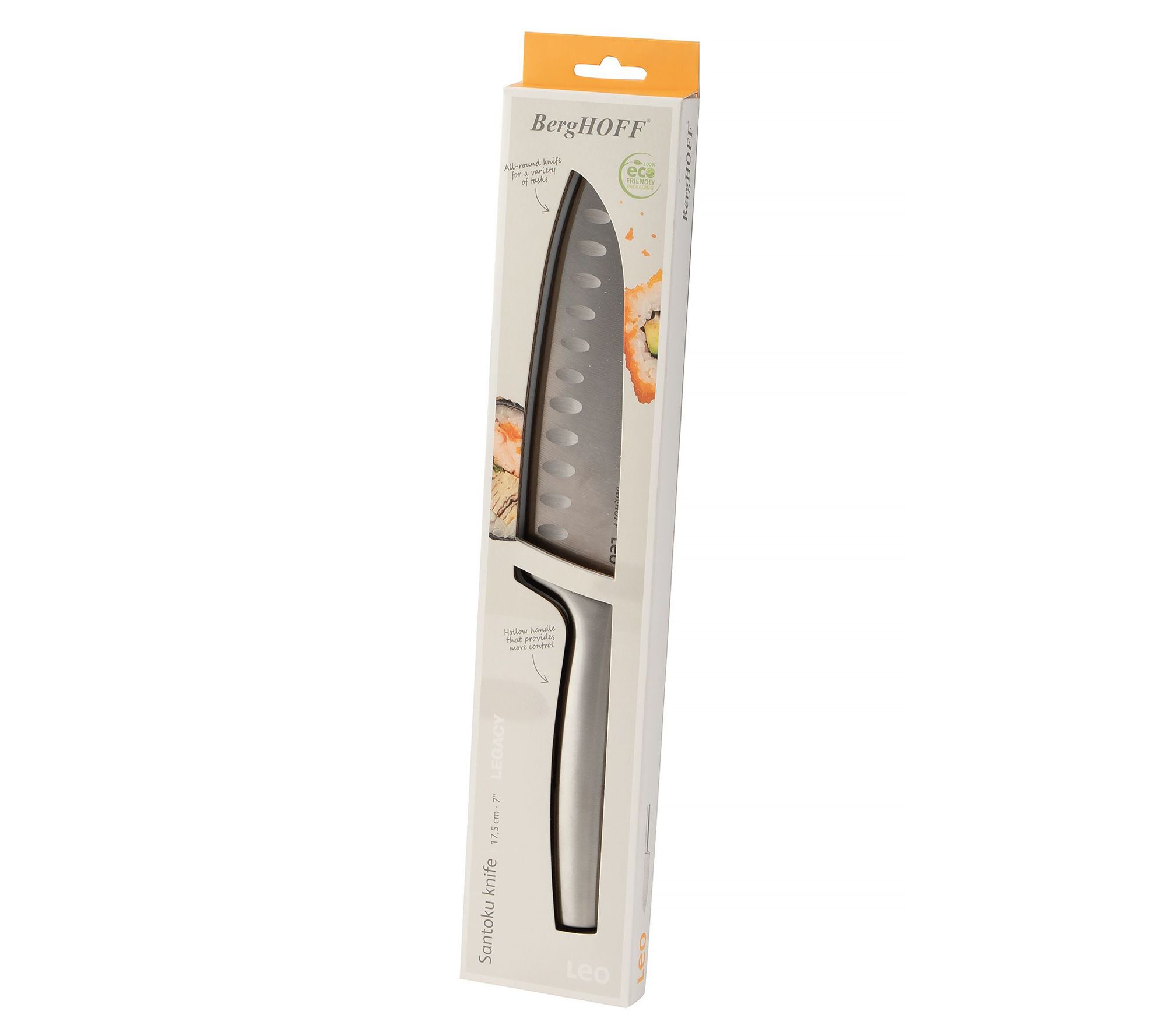 Experience the precision and versatility of this santoku knife, a must-have for any culinary enthusiast. Crafted with a high-quality stainless steel blade that ensures long-lasting sharpness, this knife features a seamless transition to a hollow, ergonomically designed handle for a comfortable and controlled grip. Whether slicing meat or dicing vegetables, its multifunctional design makes it an indispensable tool in your kitchen. From BergHOFF.