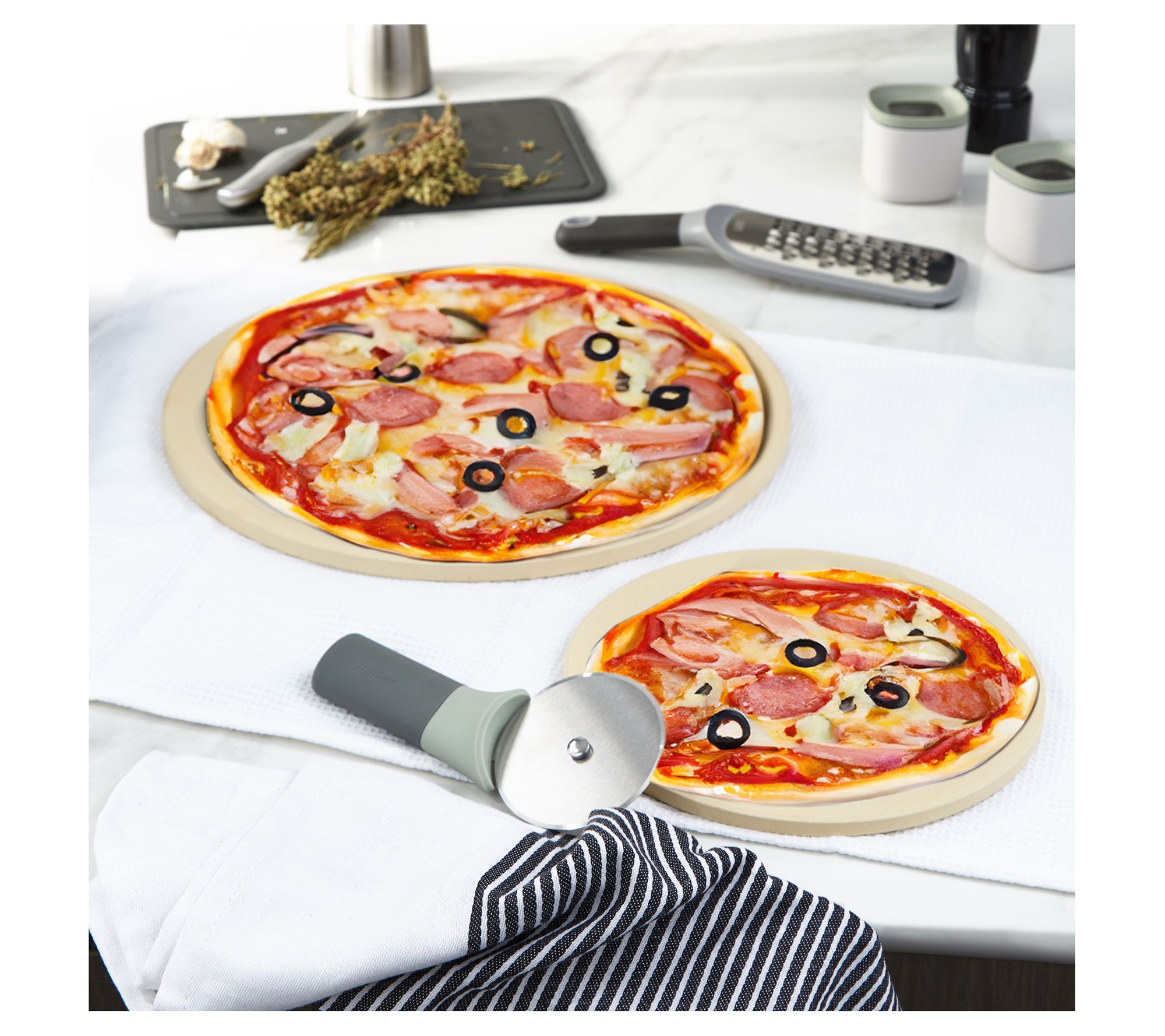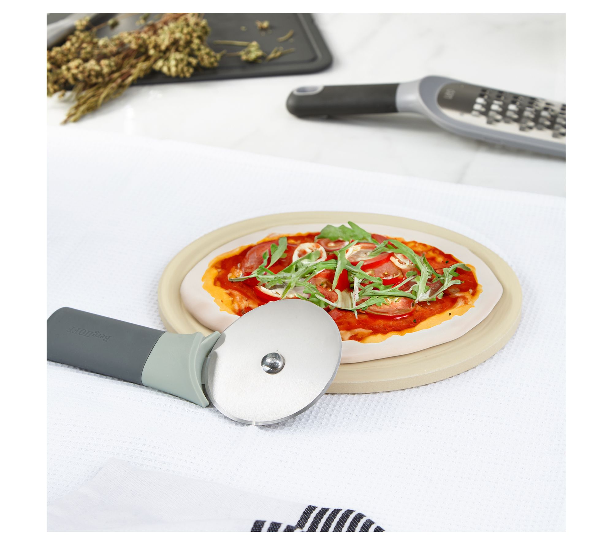 Bring the pizzeria experience to your home with the BergHOFF Leo Balance small pizza stone. Crafted from durable cordierite, this stone promises even heat distribution and a crispy, golden crust for personal pizzas, mini breads, and snacks. It's perfect for smaller ovens and toaster ovens, combining practical size with professional performance. Enjoy baking with that perfect texture and flavor. From BergHOFF.