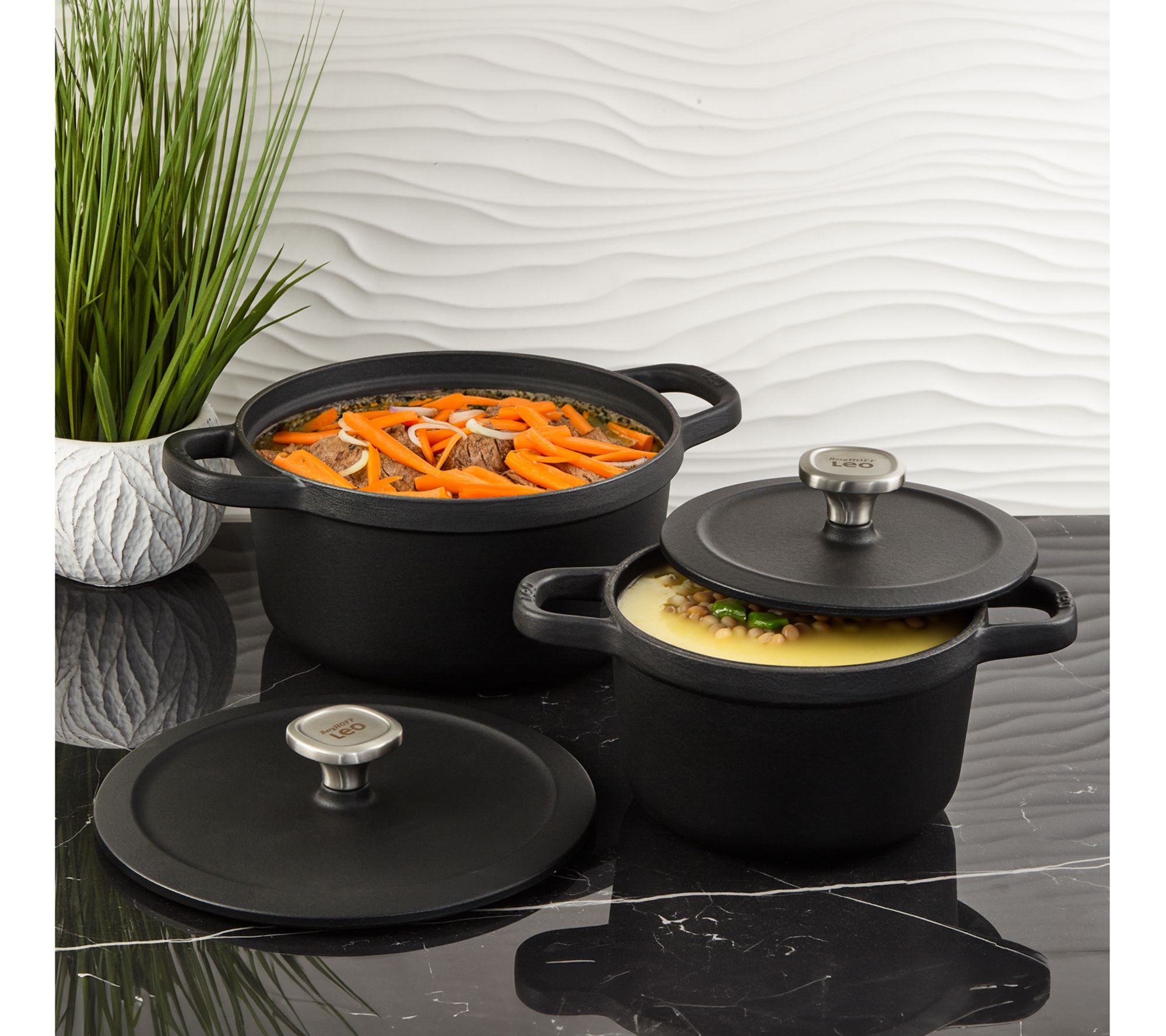 Discover the versatility and durability of the BergHOFF Leo Graphite 4-piece cast iron cookware set. Perfect for any kitchen, this set includes stockpots with ergonomic handles and vapor-seal lids for flavorful, efficient cooking on all stovetop types. From BergHOFF.