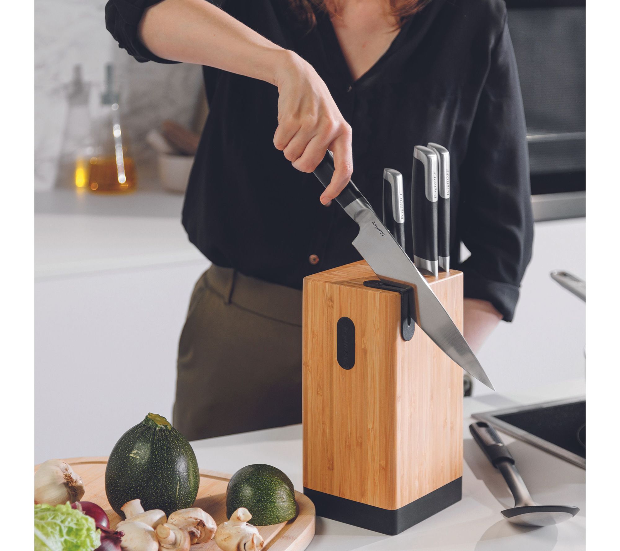 • Knife block with built-in sharpener and magnet