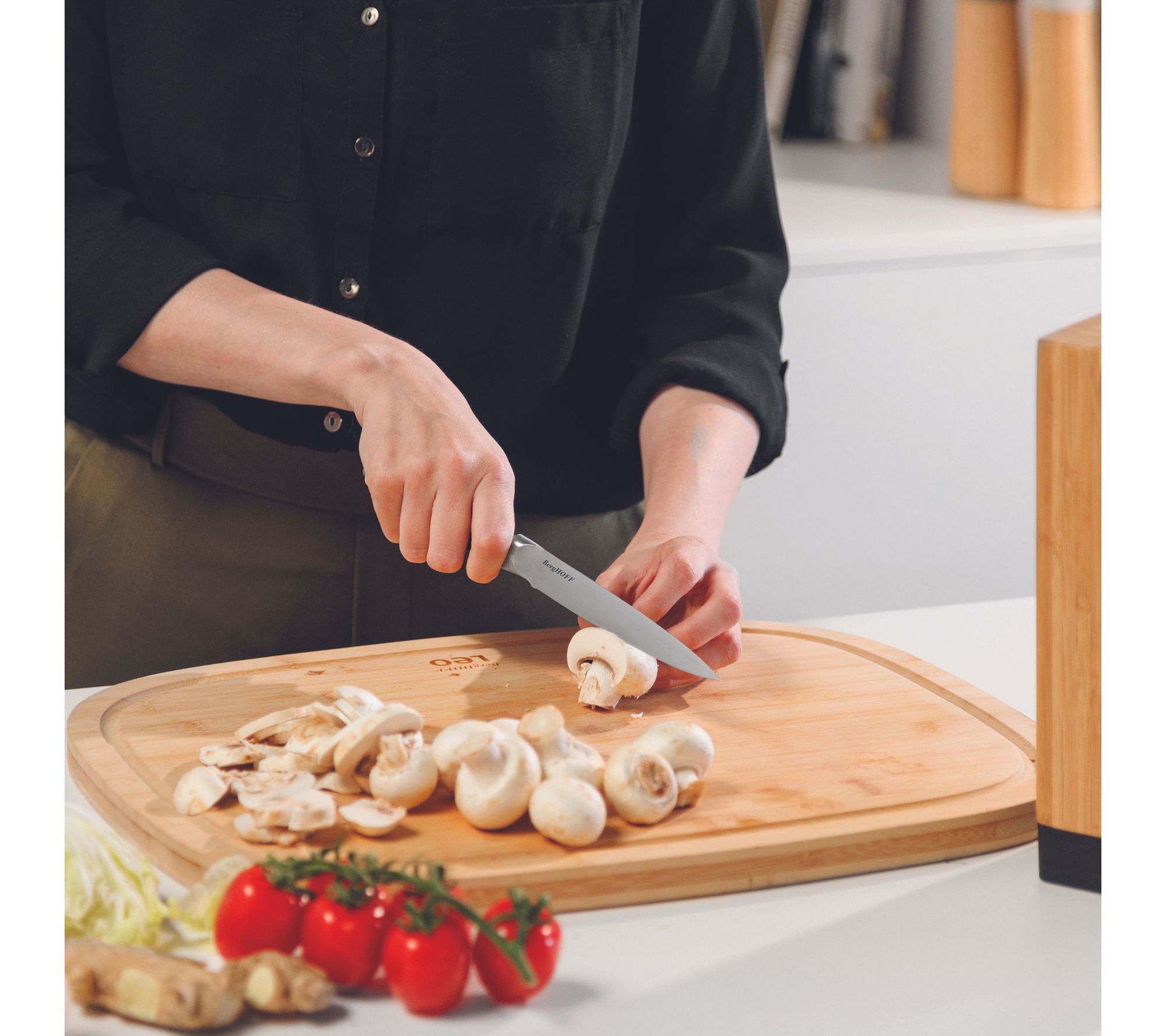 Expand your kitchen arsenal with the BergHOFF Leo Graphite 5-Piece Cutlery Block Set. This sleek set features high-quality stainless steel knives perfect for preparing Asian-inspired dishes. The bamboo knife block includes a built-in sharpener and a strong magnet for added utility, keeping your essential tools organized and within easy reach. From BergHOFF.