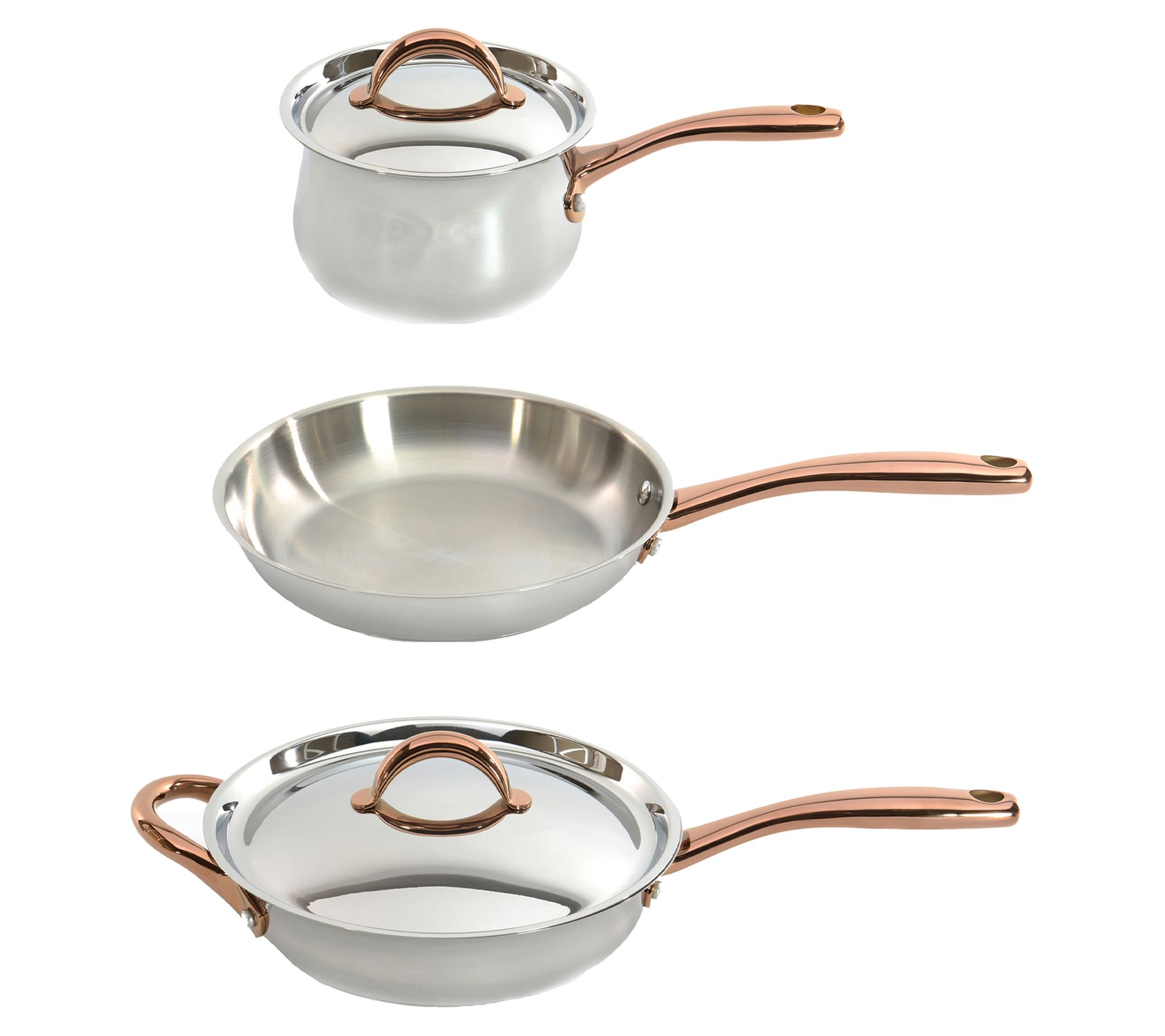 • Includes 6.25-qt saucepan, 9.5" fry pan, 9.5" deep skillet with two handles, and two glass lids