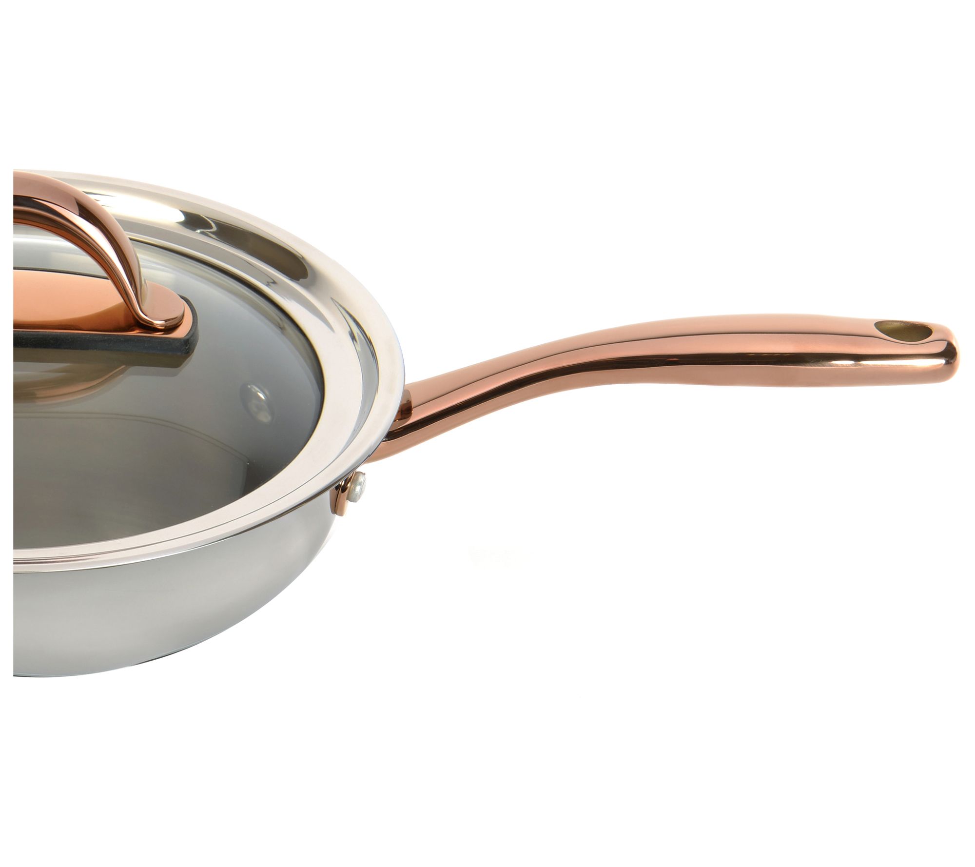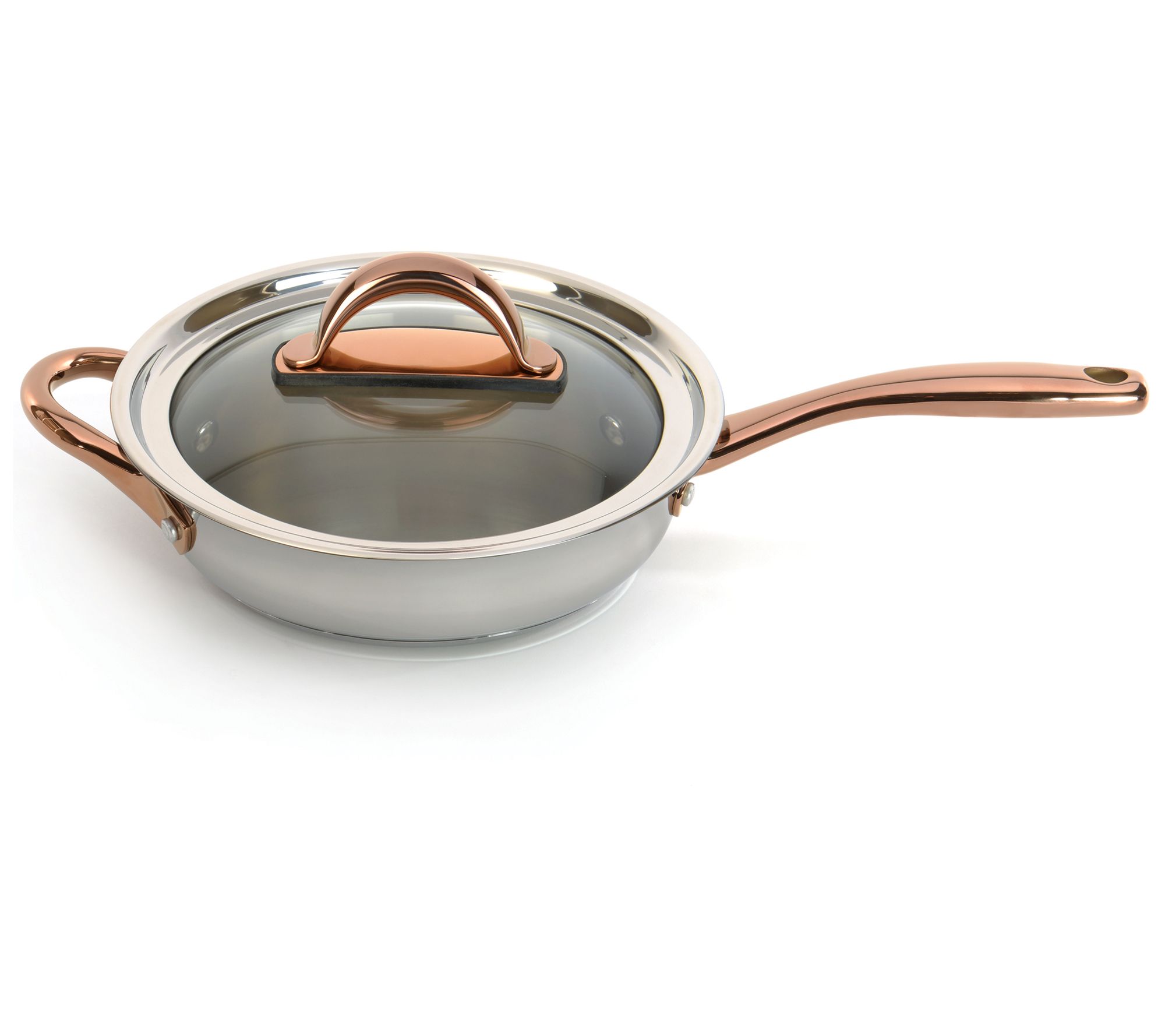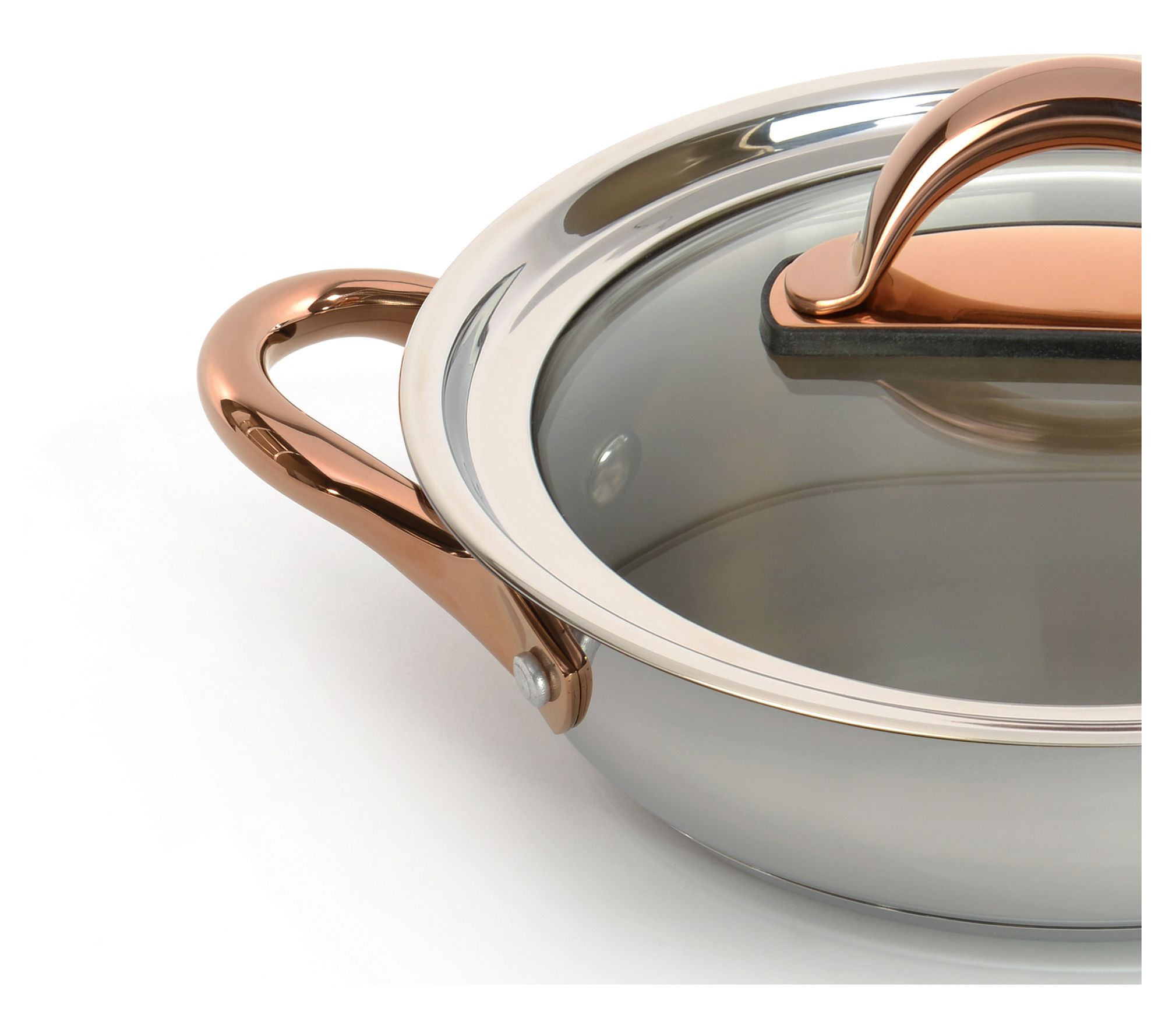 Elevate your cooking experience with this cookware set featuring rose gold handles that add a touch of elegance to your kitchen. This versatile set includes a fry pan, saucepan with lid, and deep skillet with lid, all designed for a variety of cooking tasks from searing steaks to simmering soups. The solid base ensures compatibility with all cooktops, while the vapor seal lids lock in flavors and nutrients, enhancing your culinary creations. From BergHOFF.