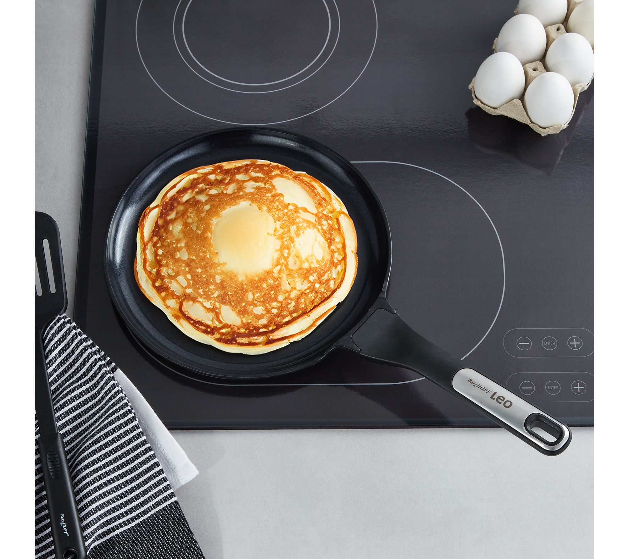 Create delectable pancakes with ease using the BergHOFF Phantom nonstick ceramic 10" pancake pan. Its CeraGreen ceramic coating ensures a nonstick cooking surface, while the ergonomic stay-cool handle provides a comfortable grip. Perfect for various cooktops and featuring even heat distribution, this pan makes cooking a breeze. From BergHOFF.