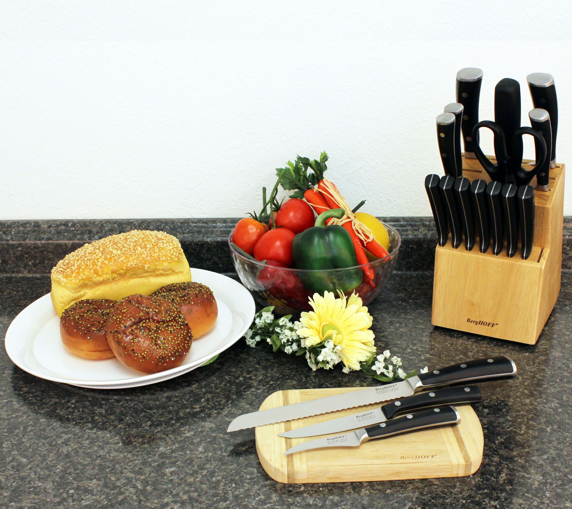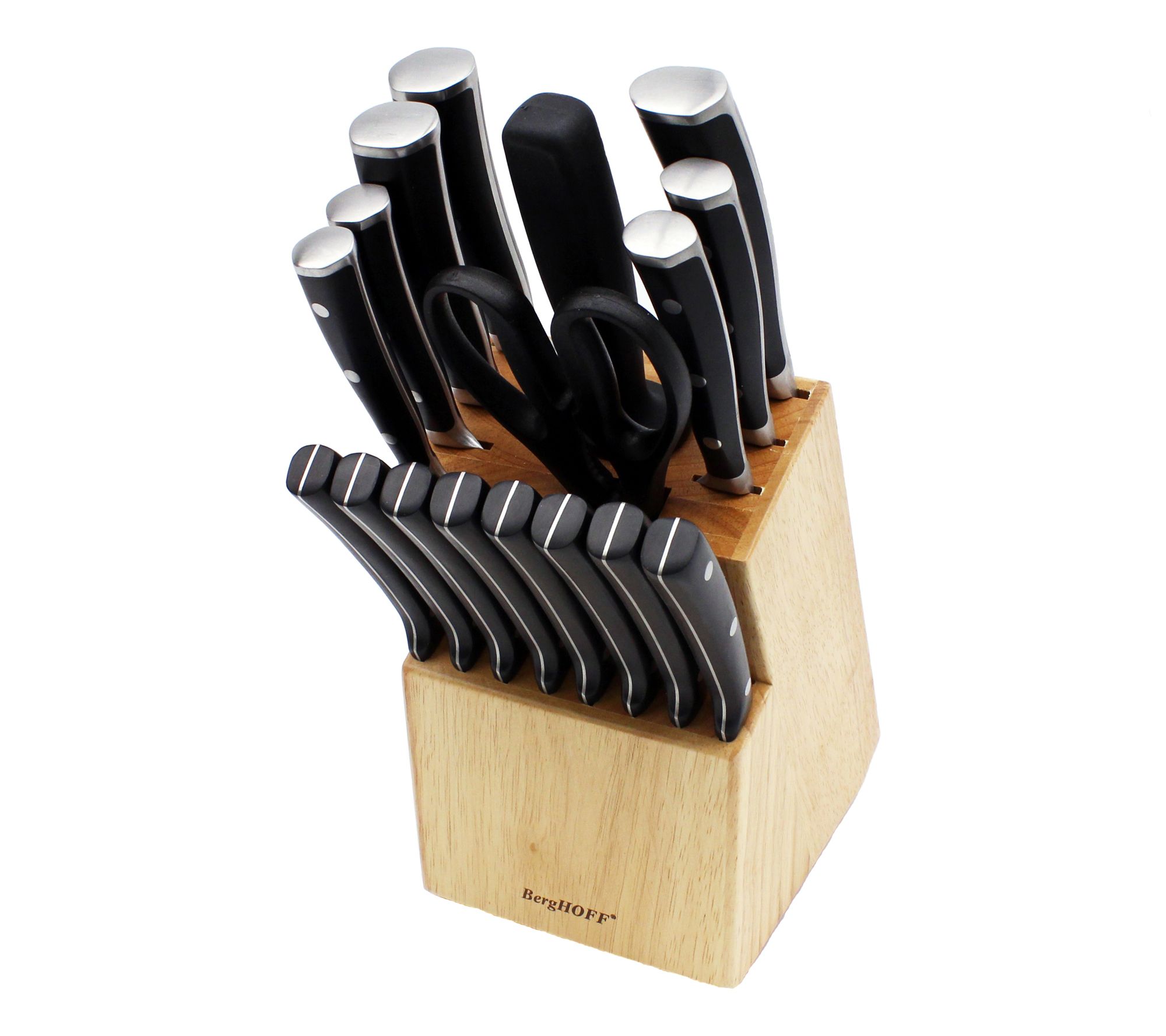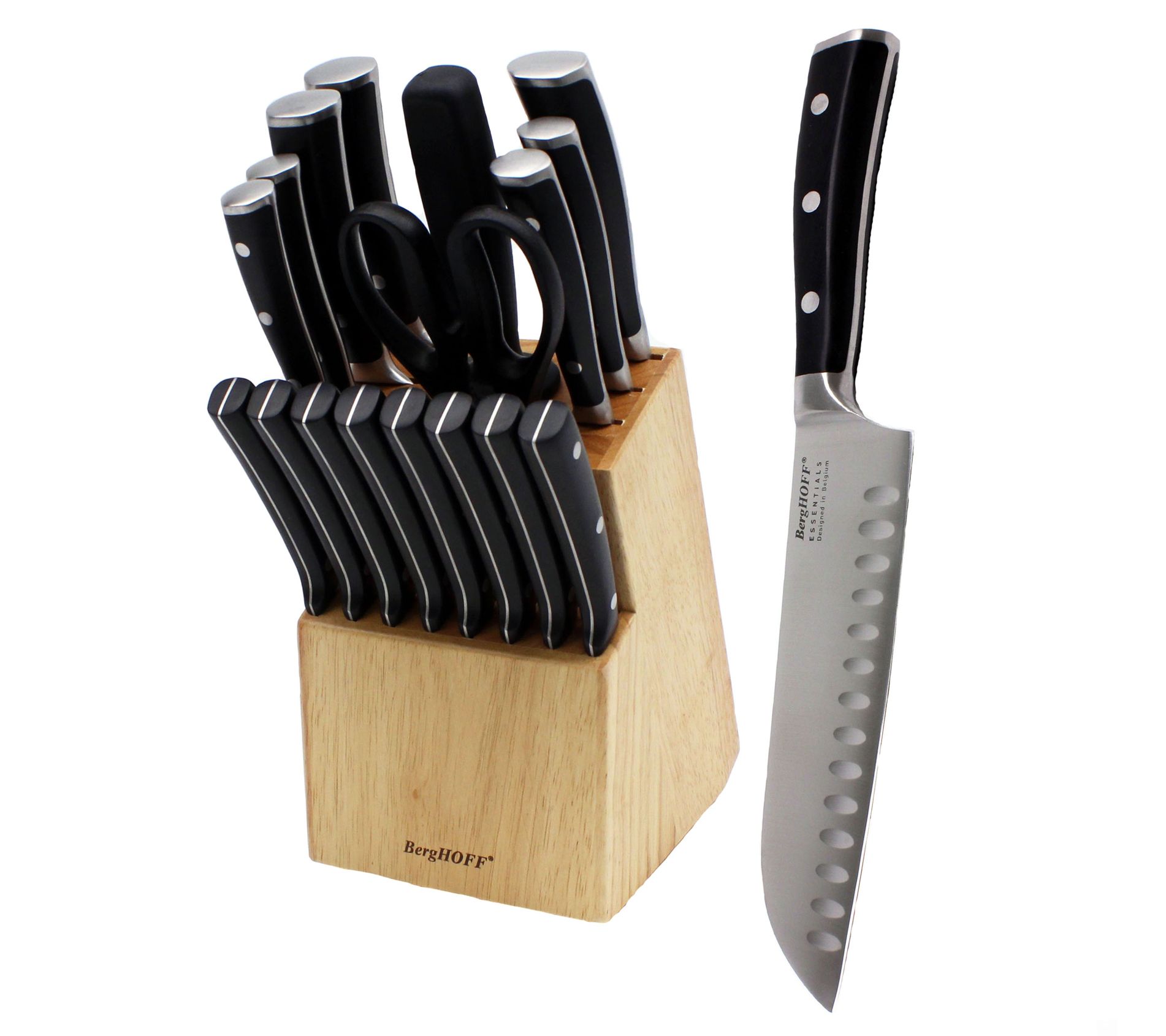 • Includes 8" chef's knife, 7" santoku knife, 8" bread knife, 5" utility knife, 5" serrated utility, 3" peeling knife, 3.5" paring knife, eight 4.5" steak knives, sharpener, scissors, wooden knife block