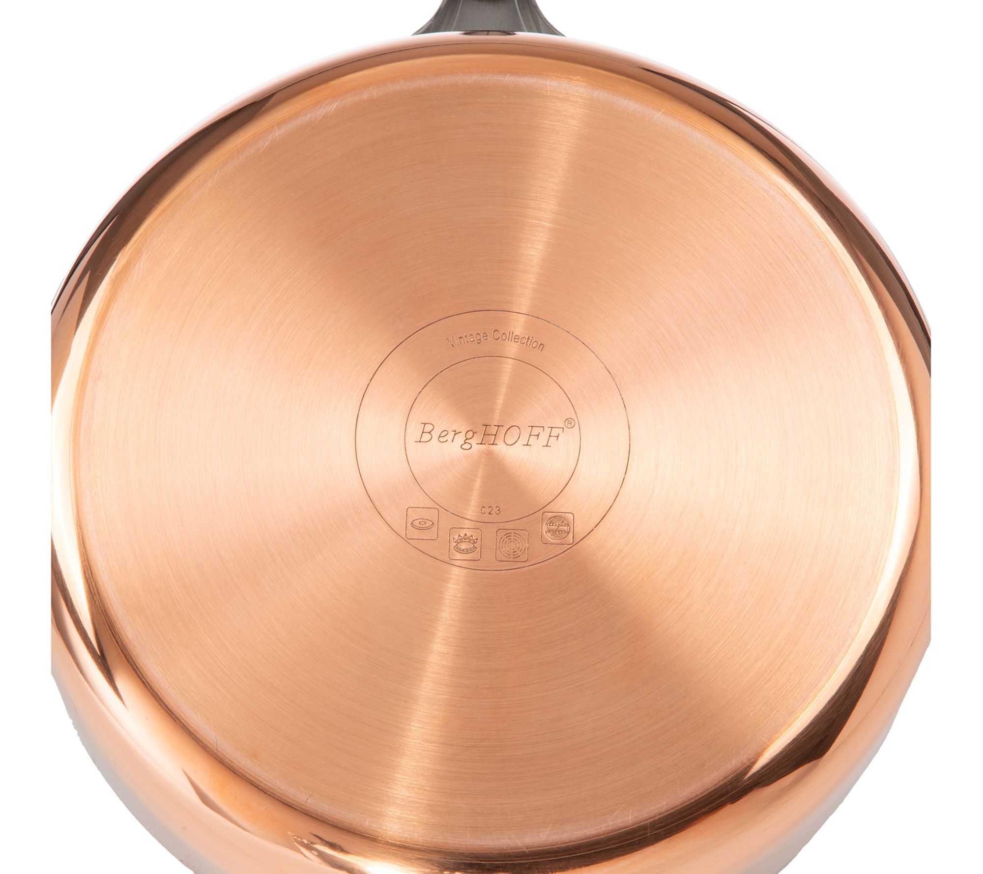 Upgrade your kitchen with the BergHOFF Vintage 4pc Tri-Ply Copper Cookware Set, designed to provide uniform heating and exceptional functionality. Whether you're simmering sauces in the saucepan or sauting in the deep skillet, this beautiful set blends timeless elegance with superior performance. Ideal for a wide variety of culinary tasks, each piece is crafted with a polished finish for easy maintenance and a professional look. From BergHOFF.