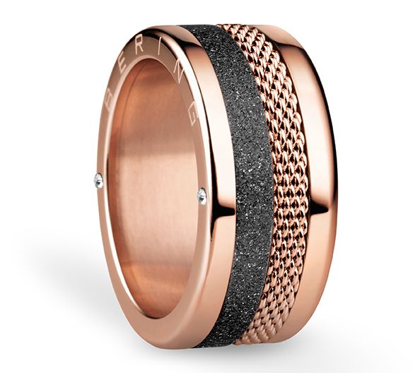 • Polished rosetone stainless steel band base; black polished stainless steel band ring insert; black stainless steel sparkling stardust band ring insert; rosetone stainless steel Milanese mesh band ring insert; two inserts can fit on base at a time