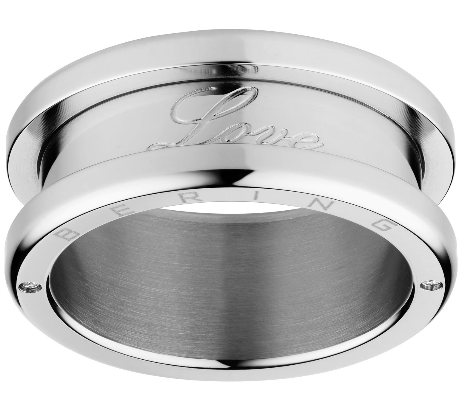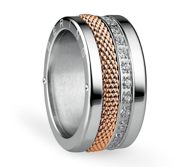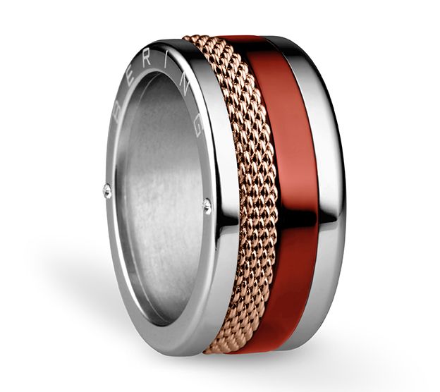Create your own ring design with this stainless steel set. Simply unscrew the base ring to insert two of the three interchangeable rings, and mix and match to complement many looks. From Bering.