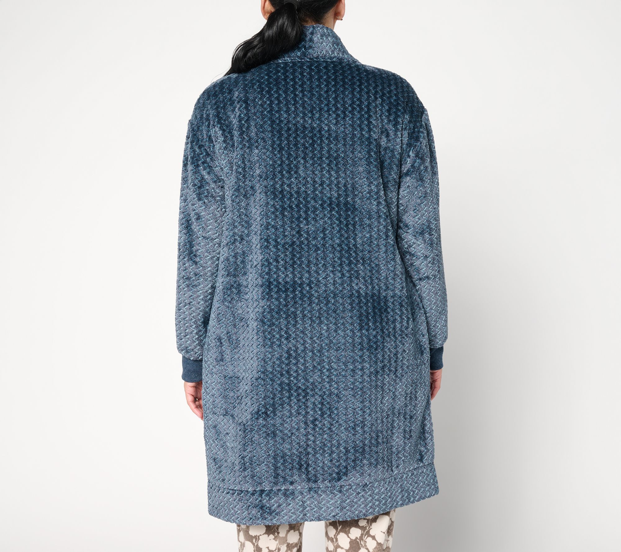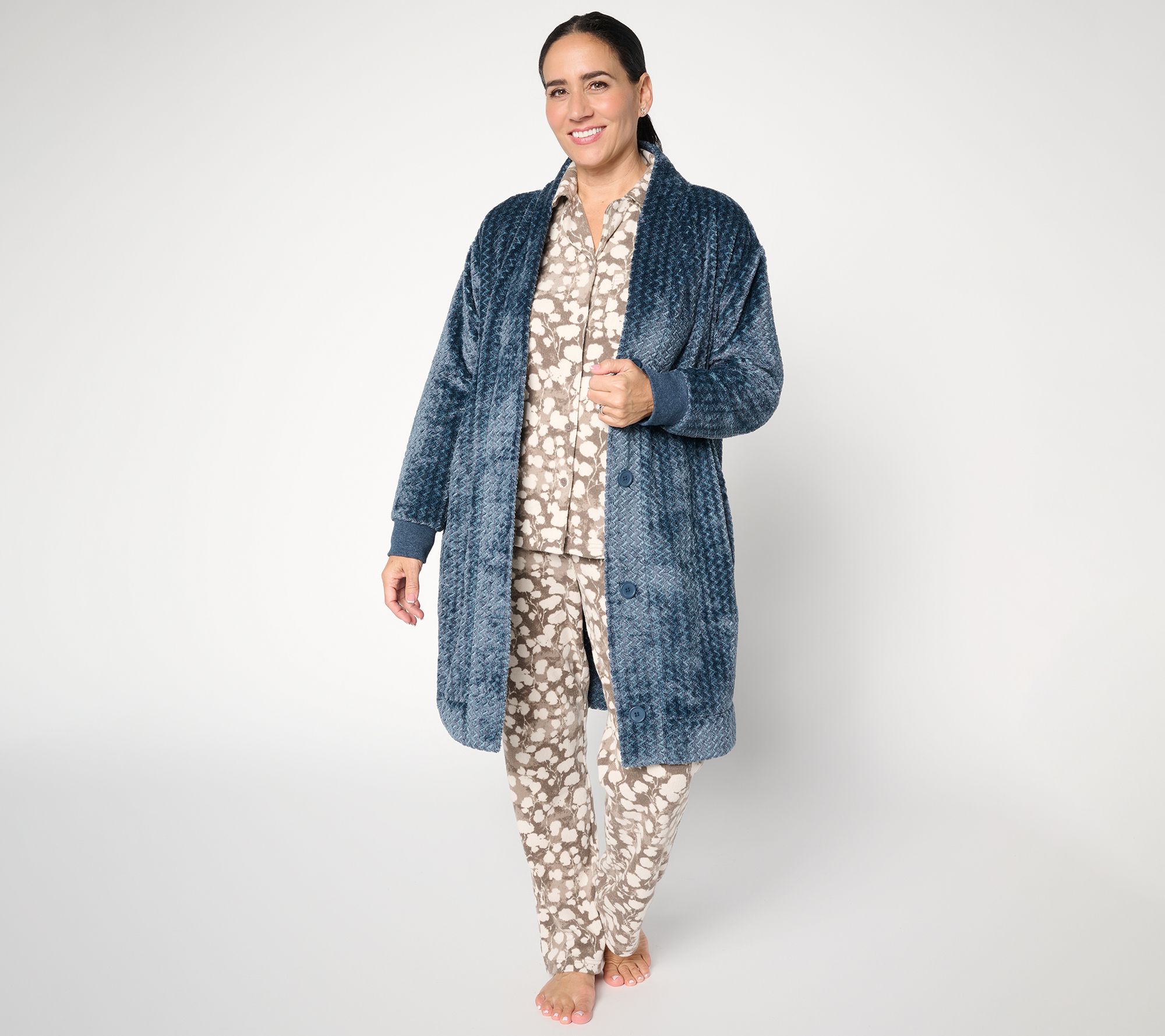 Chilly coffee-fueled mornings and cozy fireplace-lit evenings feel even more inviting with this jacquard Velvetloft knit cardigan, designed for bounding out of bed or well-deserved downtime with the ultimate in laid-back comfort. The relaxed fit and super-soft fabric make it ideal for layering over pajamas or even as a light coverup over casual outfits. From Berkshire Homewear.