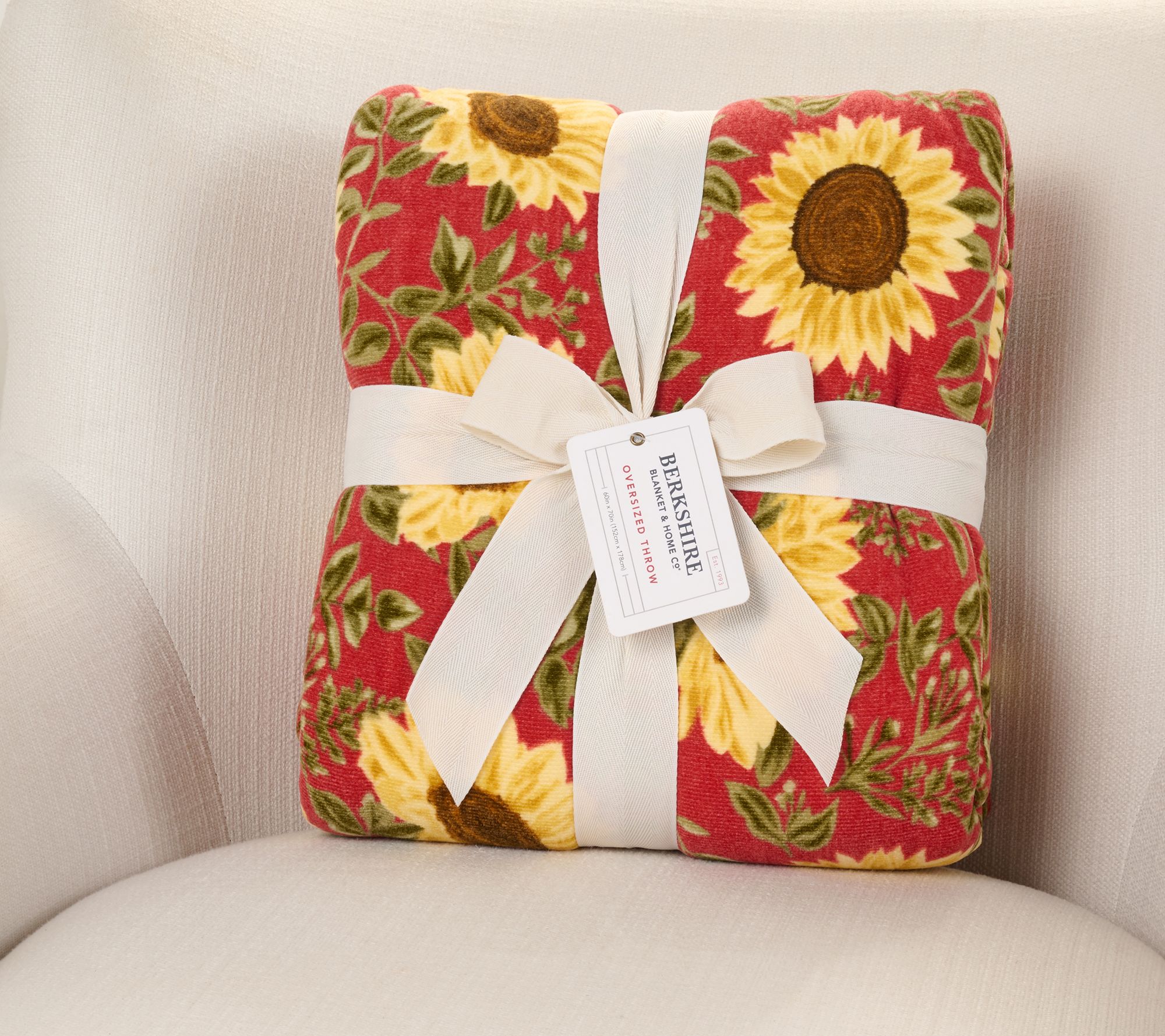 Feelin' the flower power? Wrap yourself in the delightful softness of sunflower-inspired plush that adds a cheerful accent to your favorite retreat. This snuggly throw gives any sofa, chair, or bed a seasonal lift and arrives tied with a ribbon, making it a thoughtful gift option for loved ones or yourself. From Berkshire Blanket.