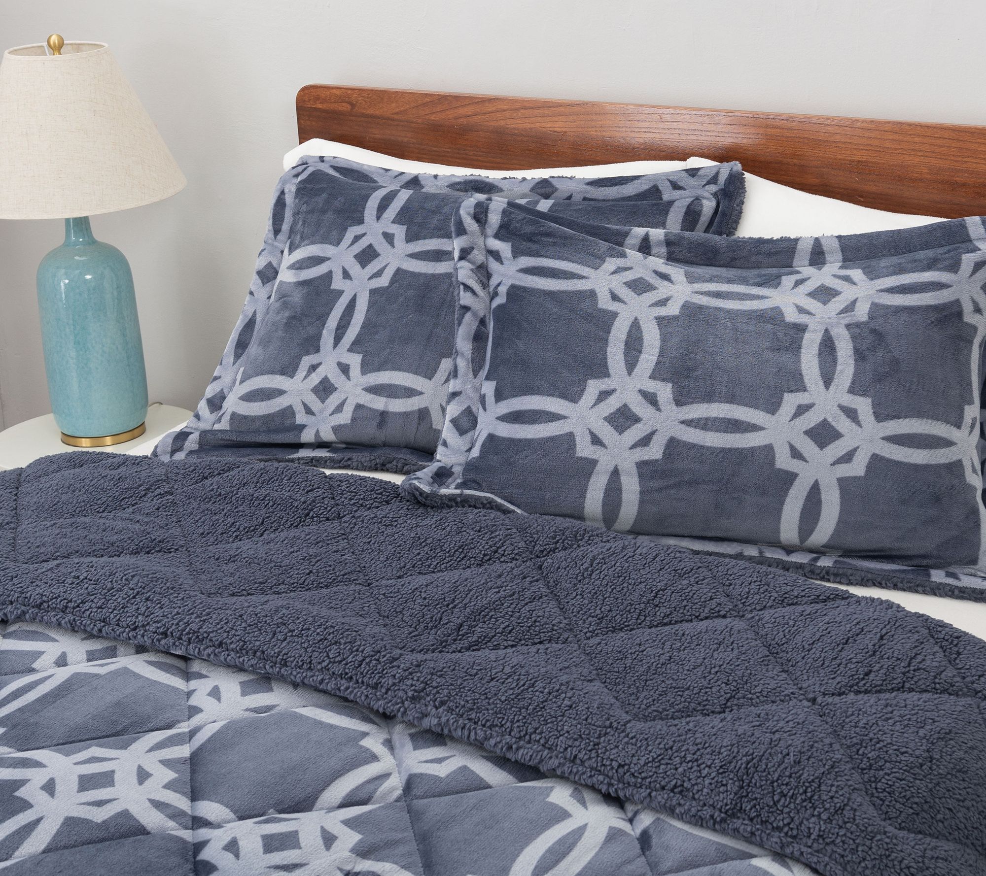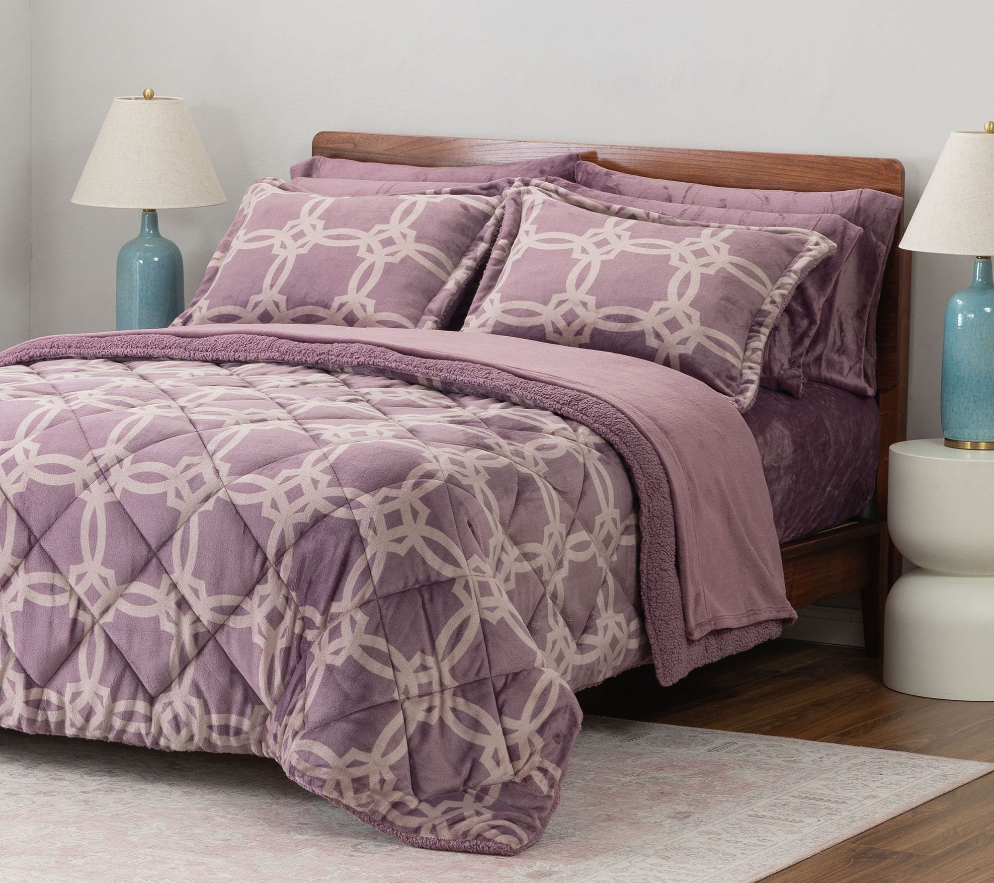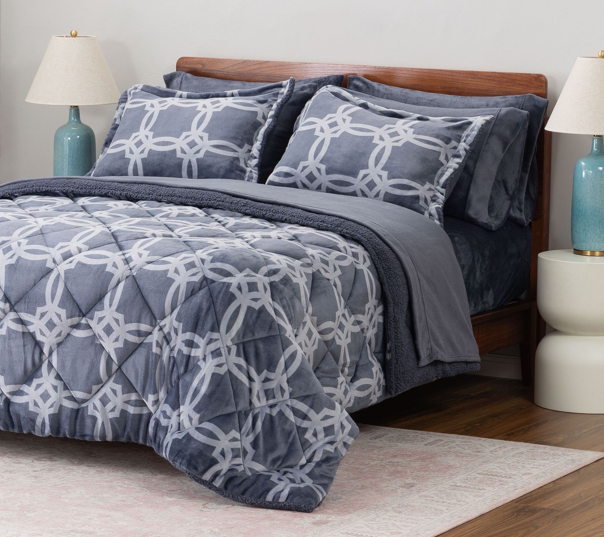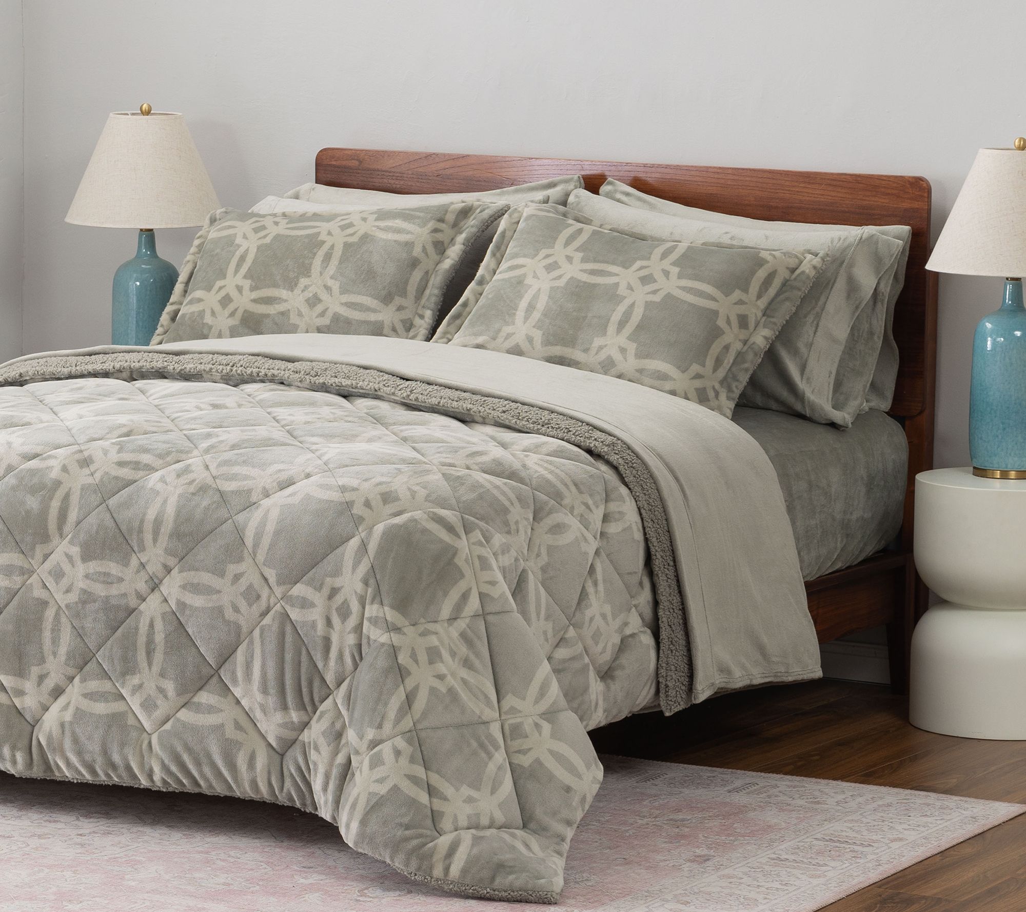 Chilly season sleep hack! Turn your bedroom into a dreamy fall and winter retreat with the simple addition of this cozy Velvetsoft comforter and sham set that reverses to snuggly sherpa. The trellis-inspired pattern reimagines your room or a guest room with timeless yet trend-right styling, but it's the irresistible softness and comforting warmth that beckon everyone to bed every time (even the younger set on a holiday eve). And making the bed in the morning (or after a long winter's nap) couldn't be easier with the silky-smooth, generously sized creation -- just fold over the top to reveal the coordinating reverse, and ta-da! Total designer vibes.
