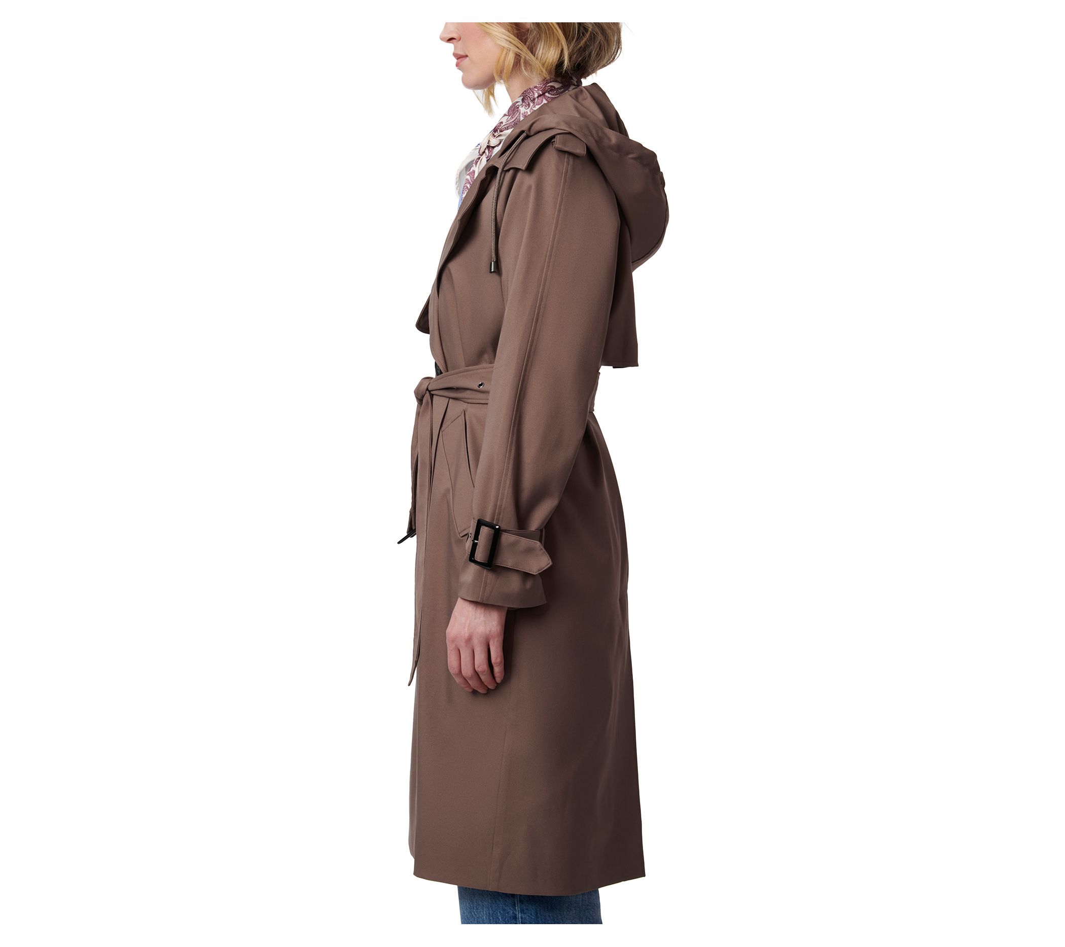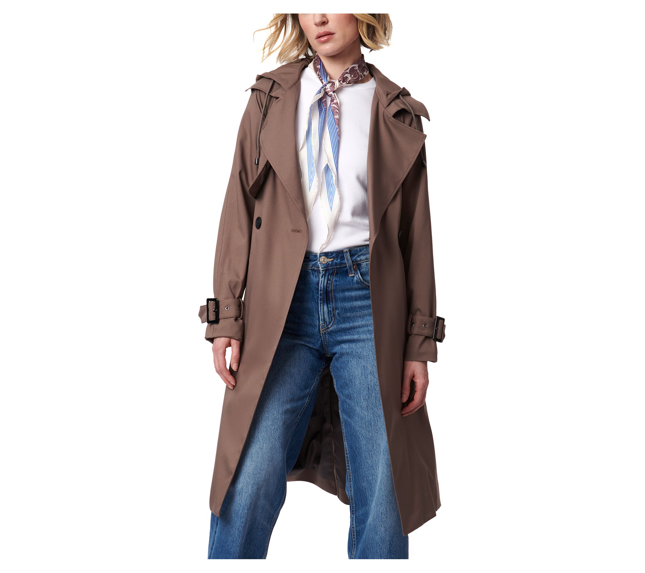 This knee-length trench coat features a drawcord hood, loose storm shield, and epaulettes on the shoulders, making it a perfect blend of fashion and function for the fall and winter season ahead. From Bernardo.