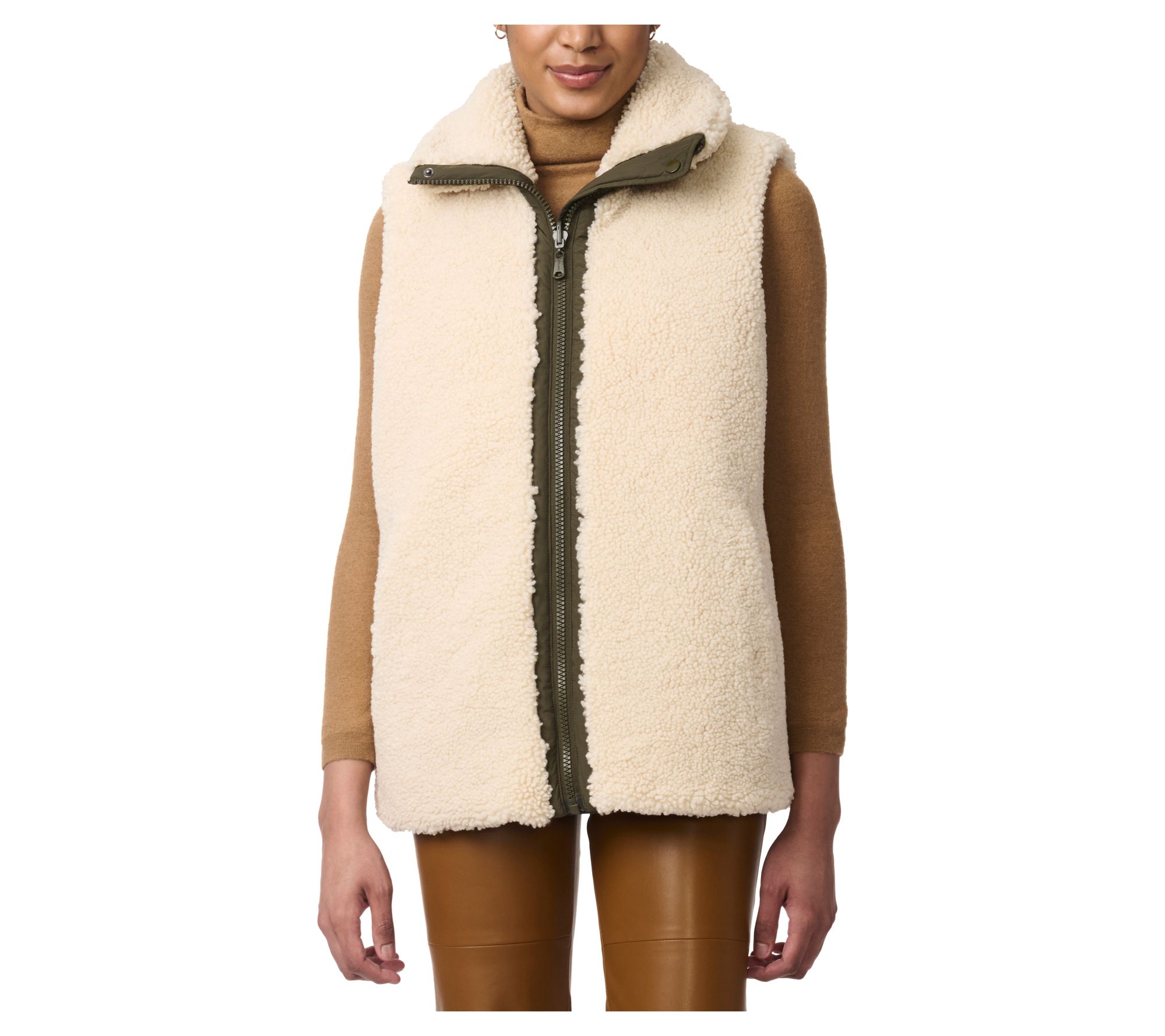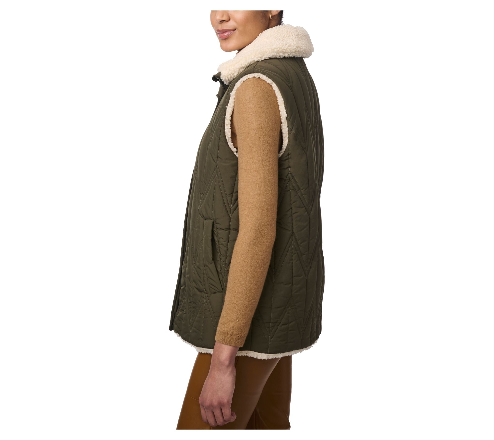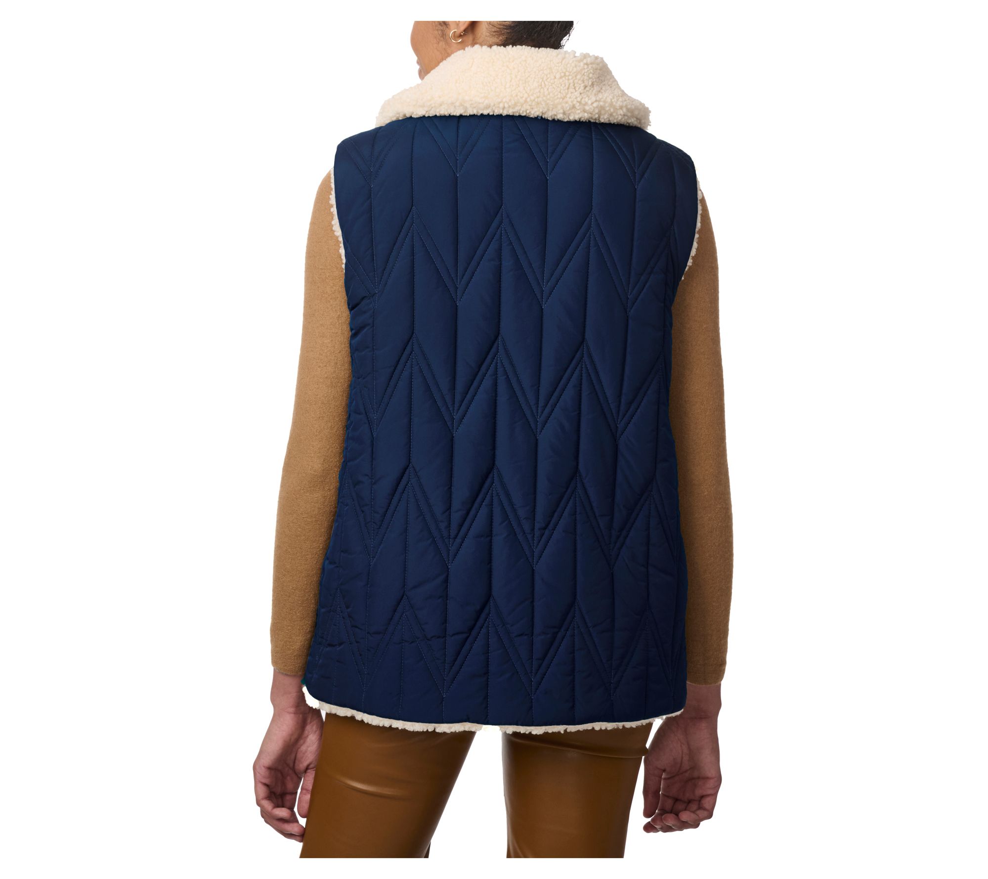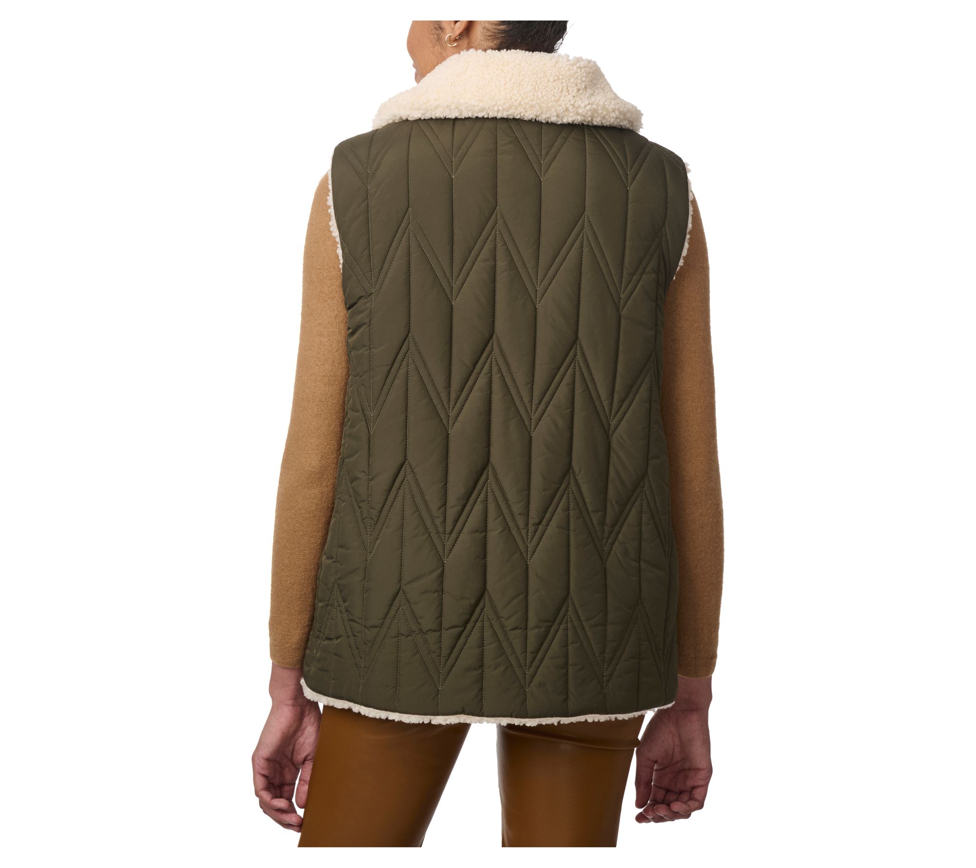 Maximize your fall and winter layering options with the versatile Bernardo Dual Charm reversible vest. With chevron stitching on one side and plush sherpa on the other, this practical piece offers two sleek styles in one. Perfect for everything from casual outings to cozy nights, it provides comfort and a classic silhouette. From Bernardo.