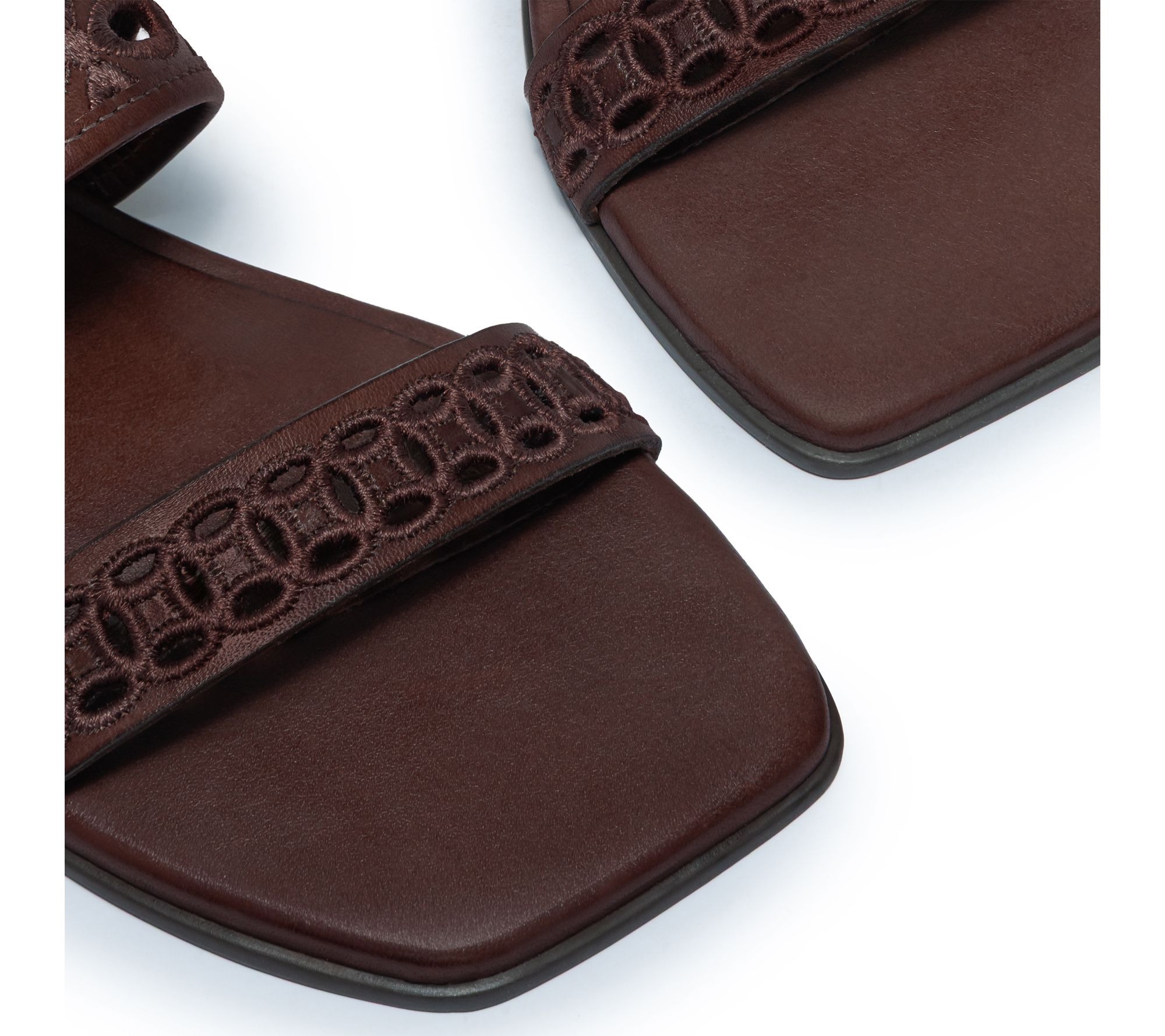 • Eyelet cutout and embroidered detailing on double straps, adjustable slingback strap with buckle closure, square toe