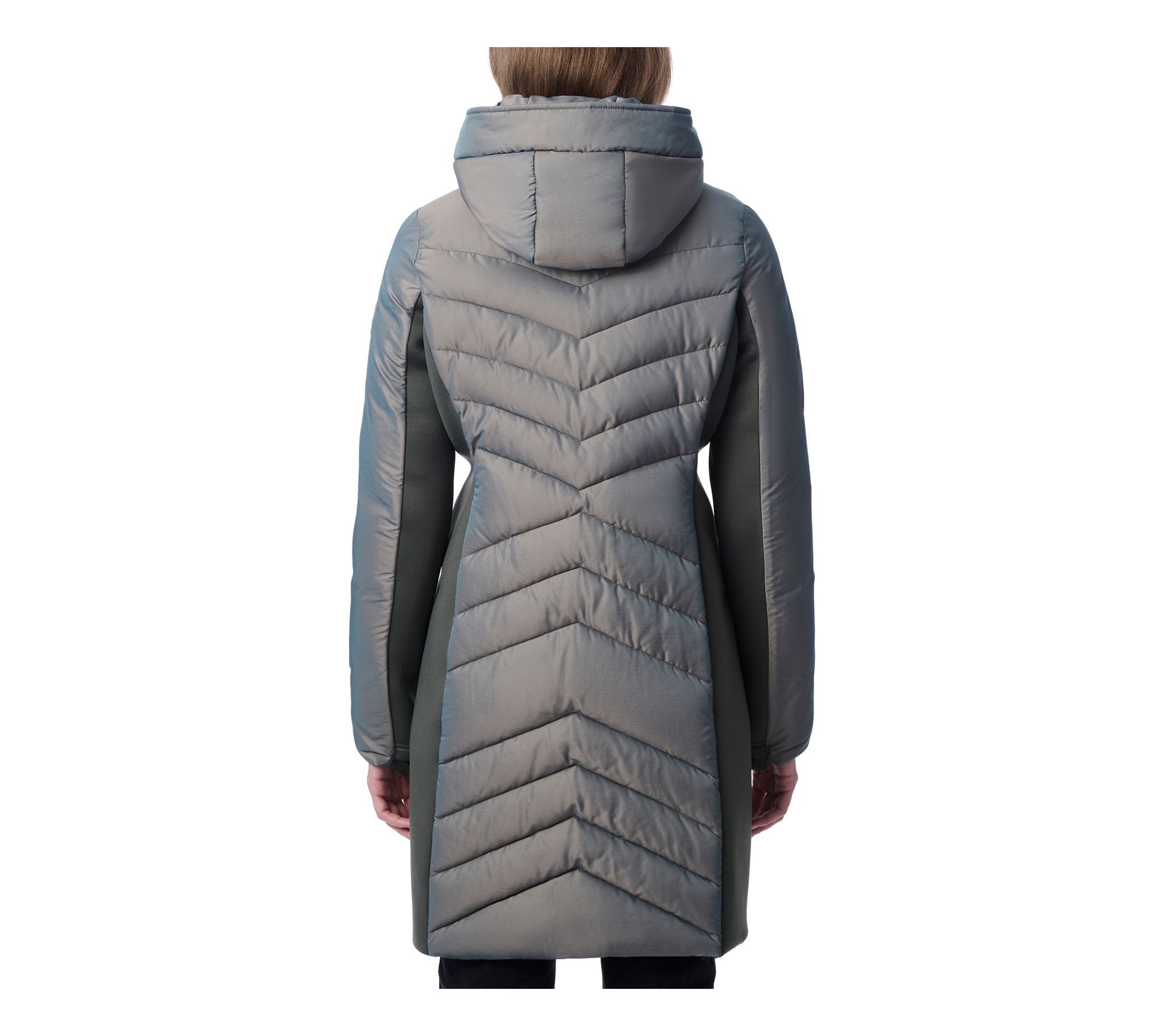Shine on! This iridescent walker hooded coat helps keep you warm and stylish with a zip-off hood, thumbhole cuffs, and allover quilting. From Bernardo.