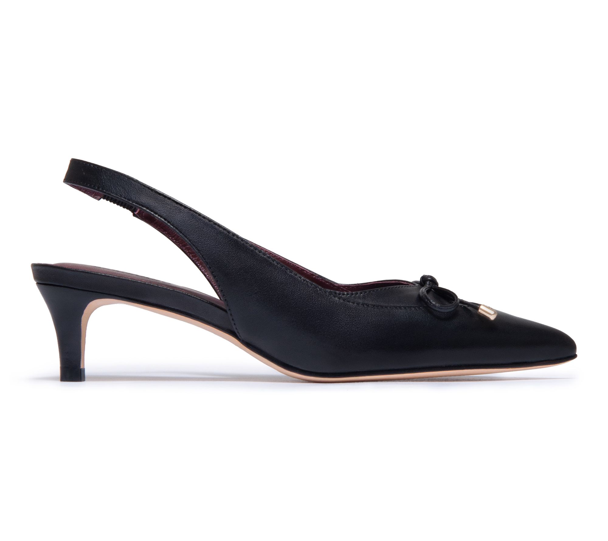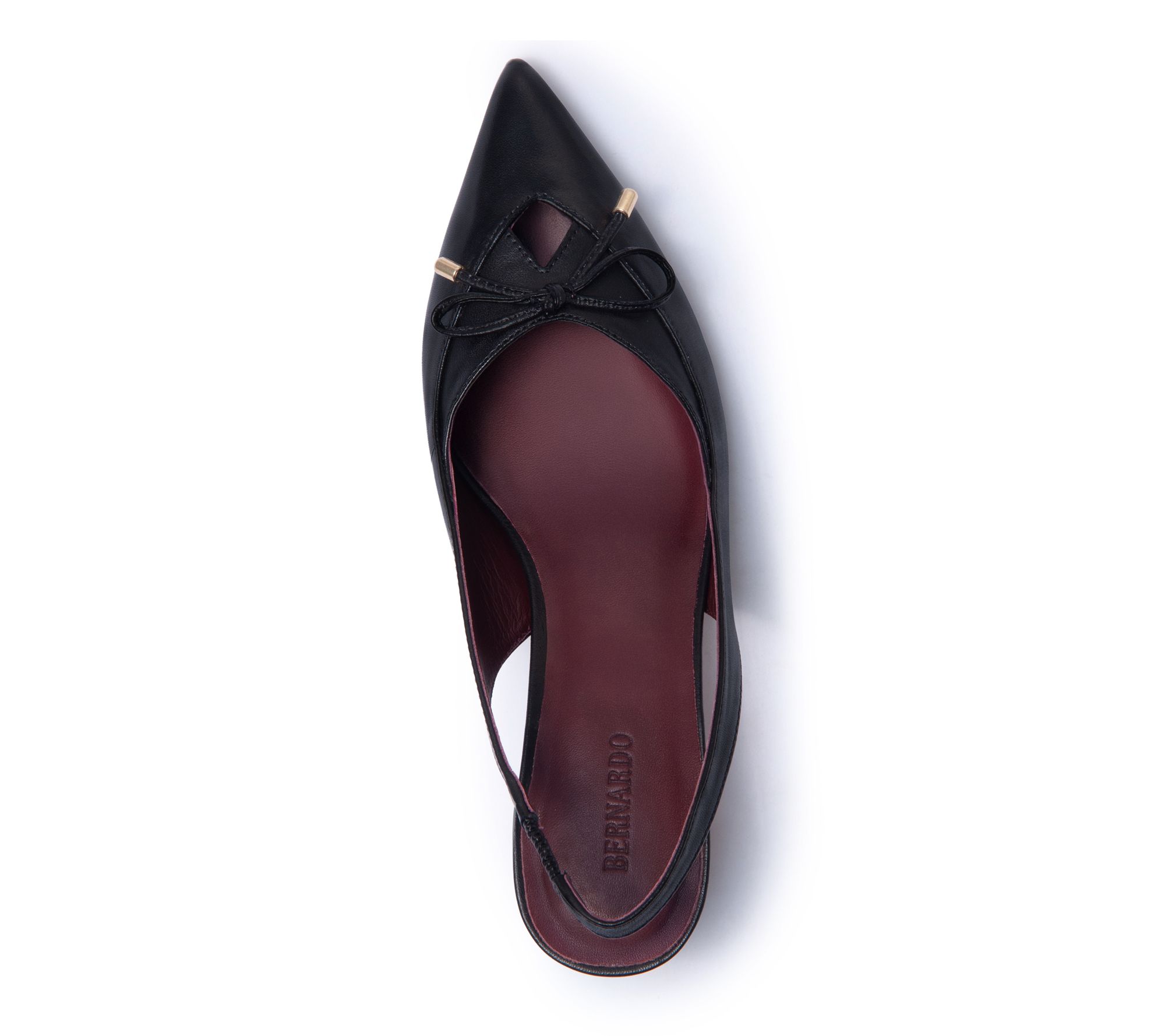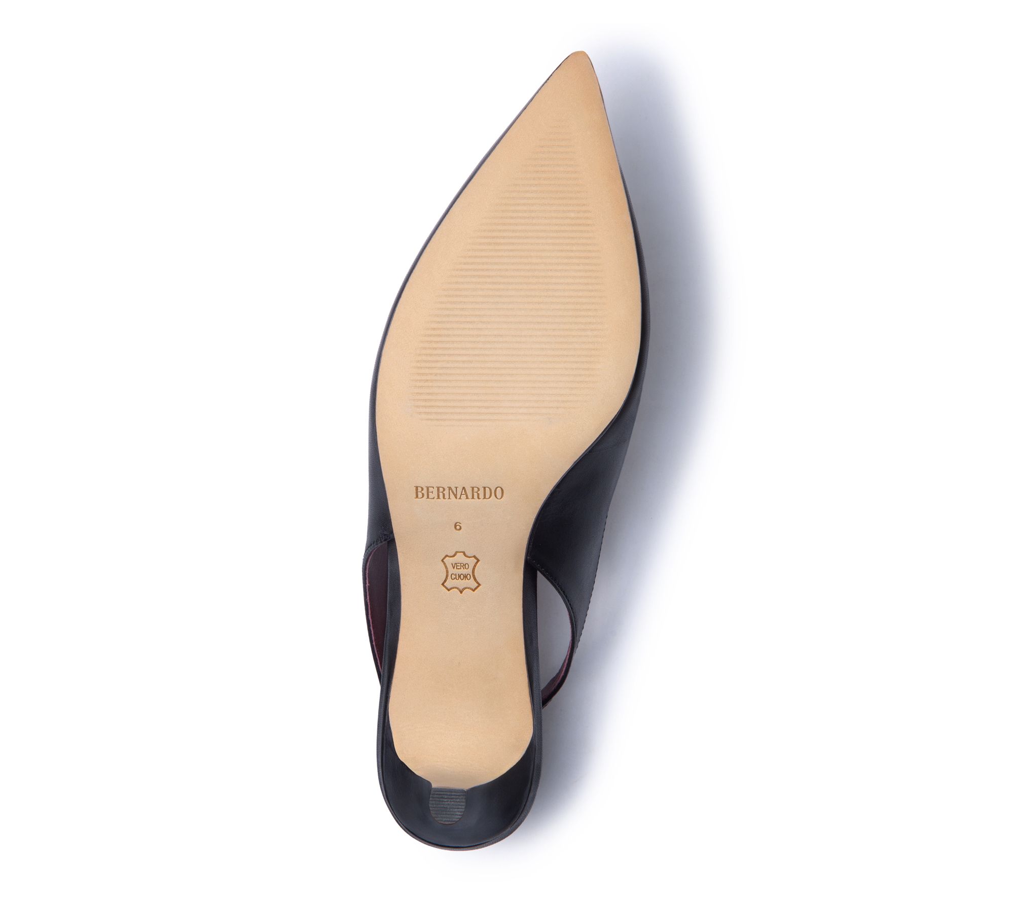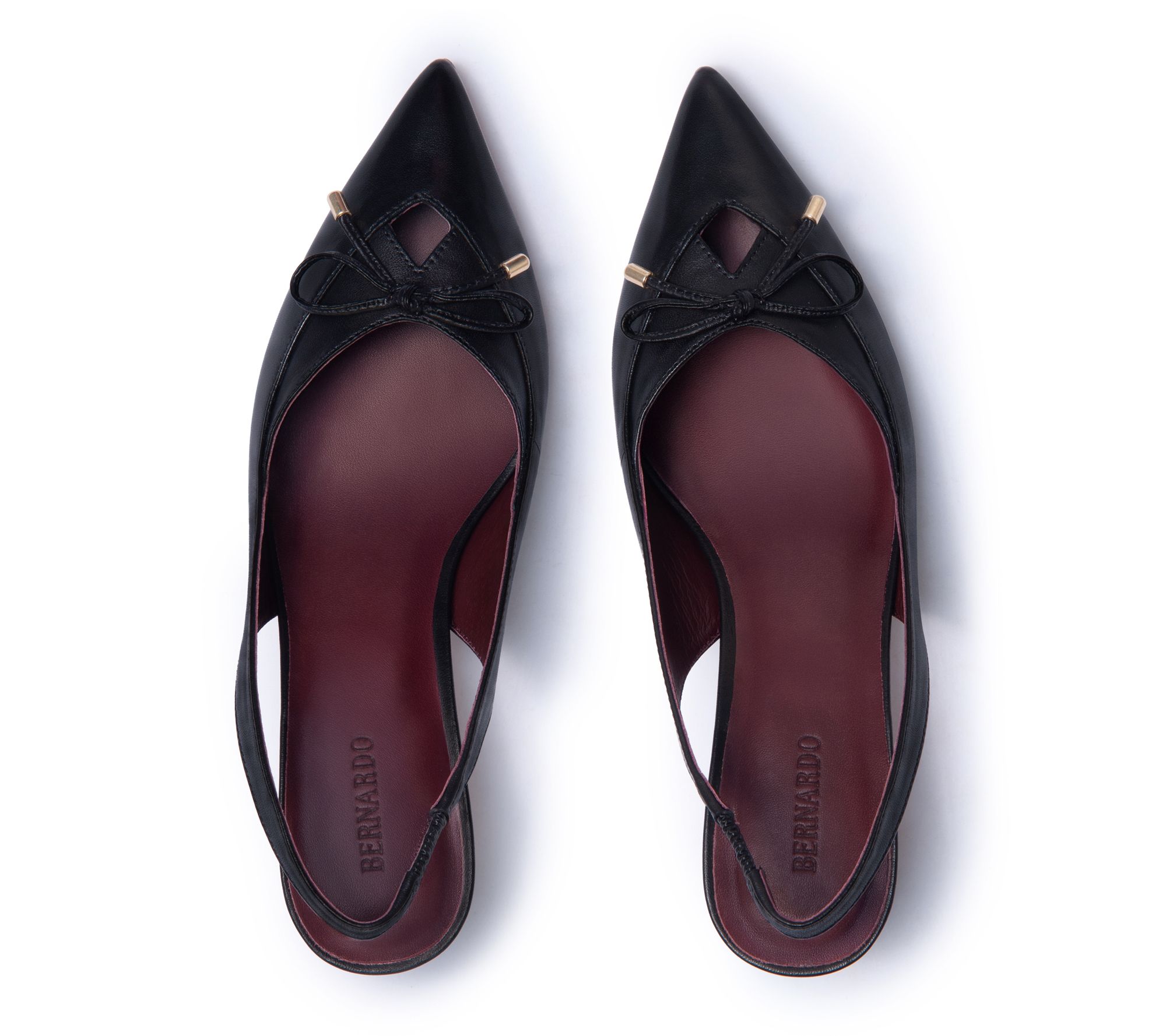 Classic elegance meets modern flair in this women’s slingback pump, designed for both busy workdays and evenings out. The pointed toe and delicate leather bow detail add a polished touch, while the stacked kitten heel offers comfort and sophistication with every step. From Bernardo.
