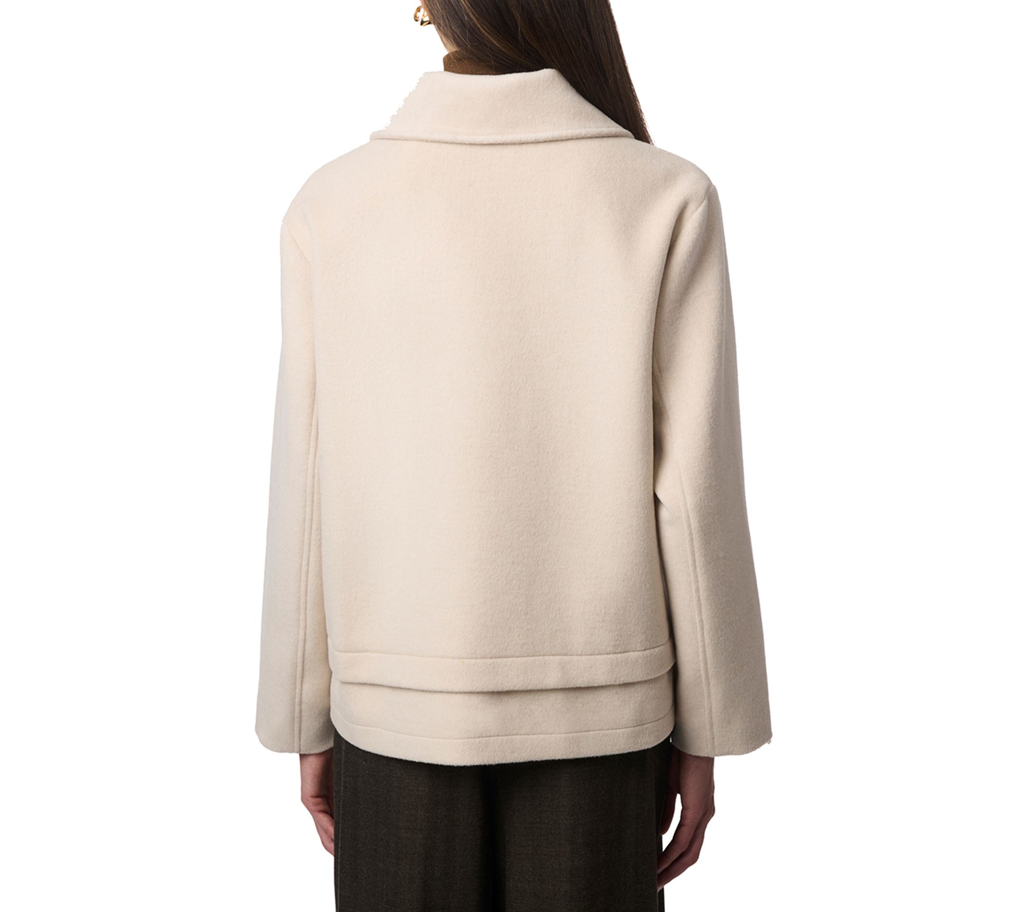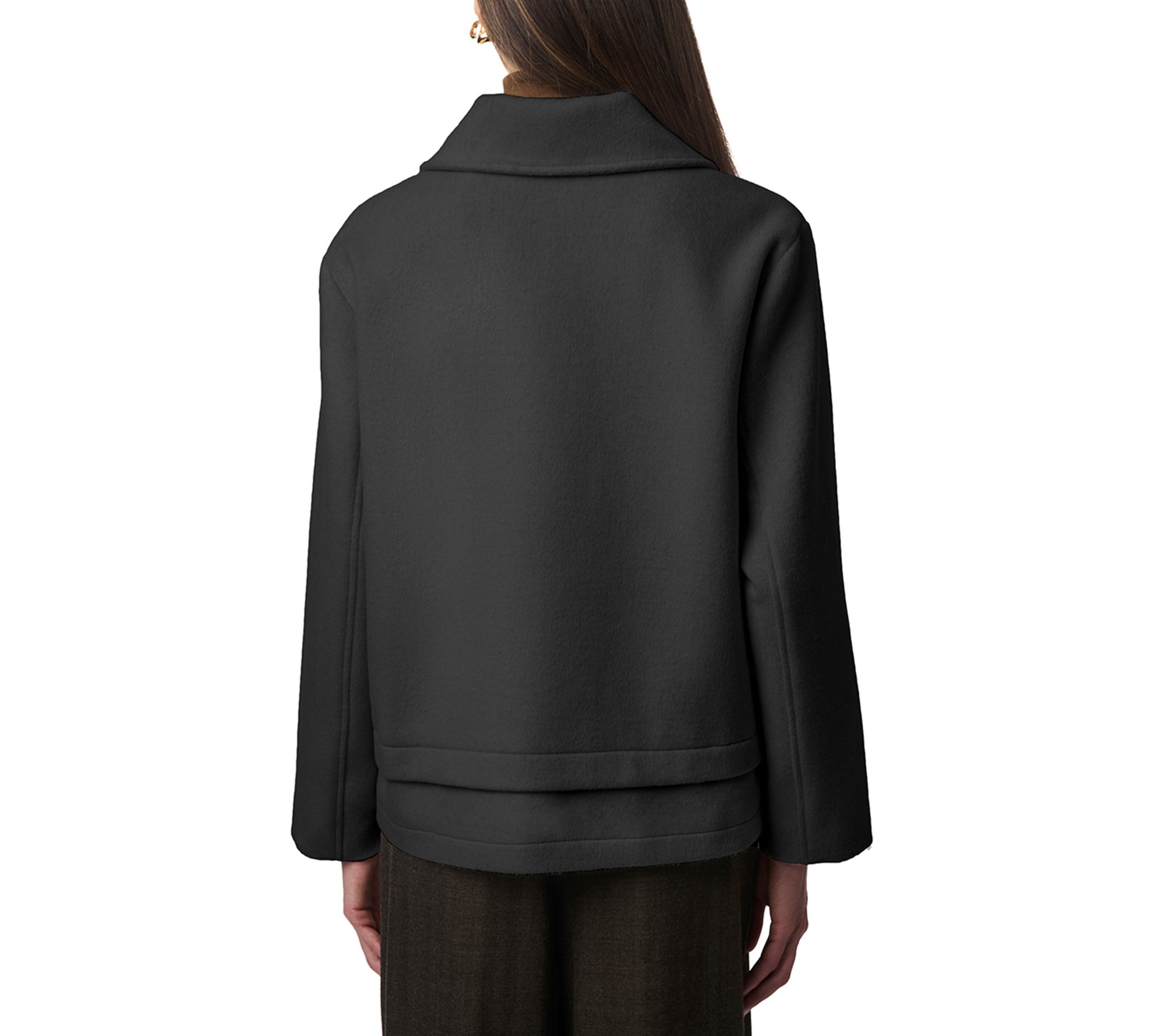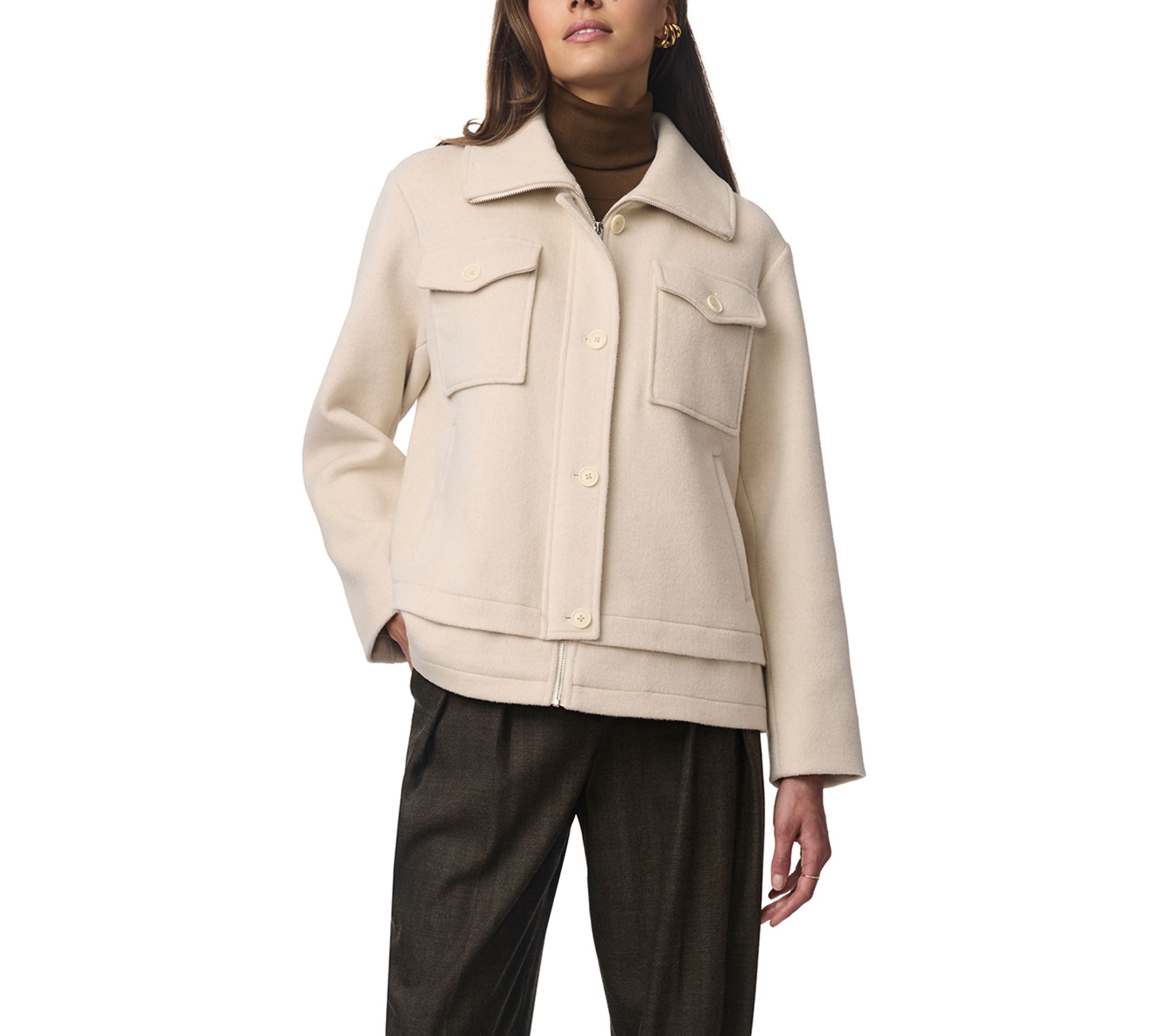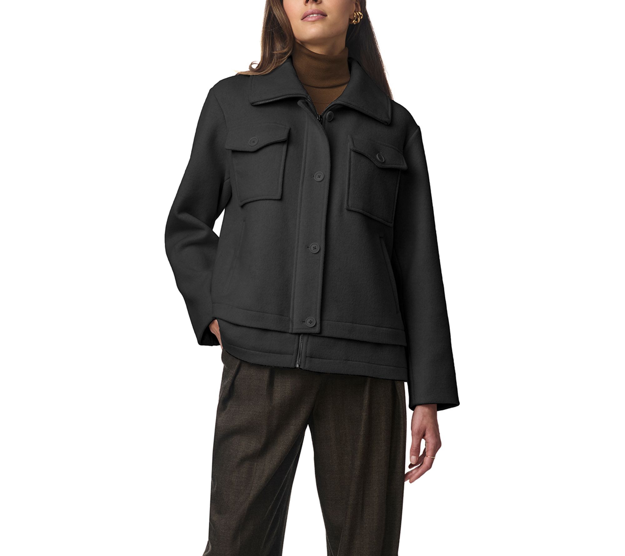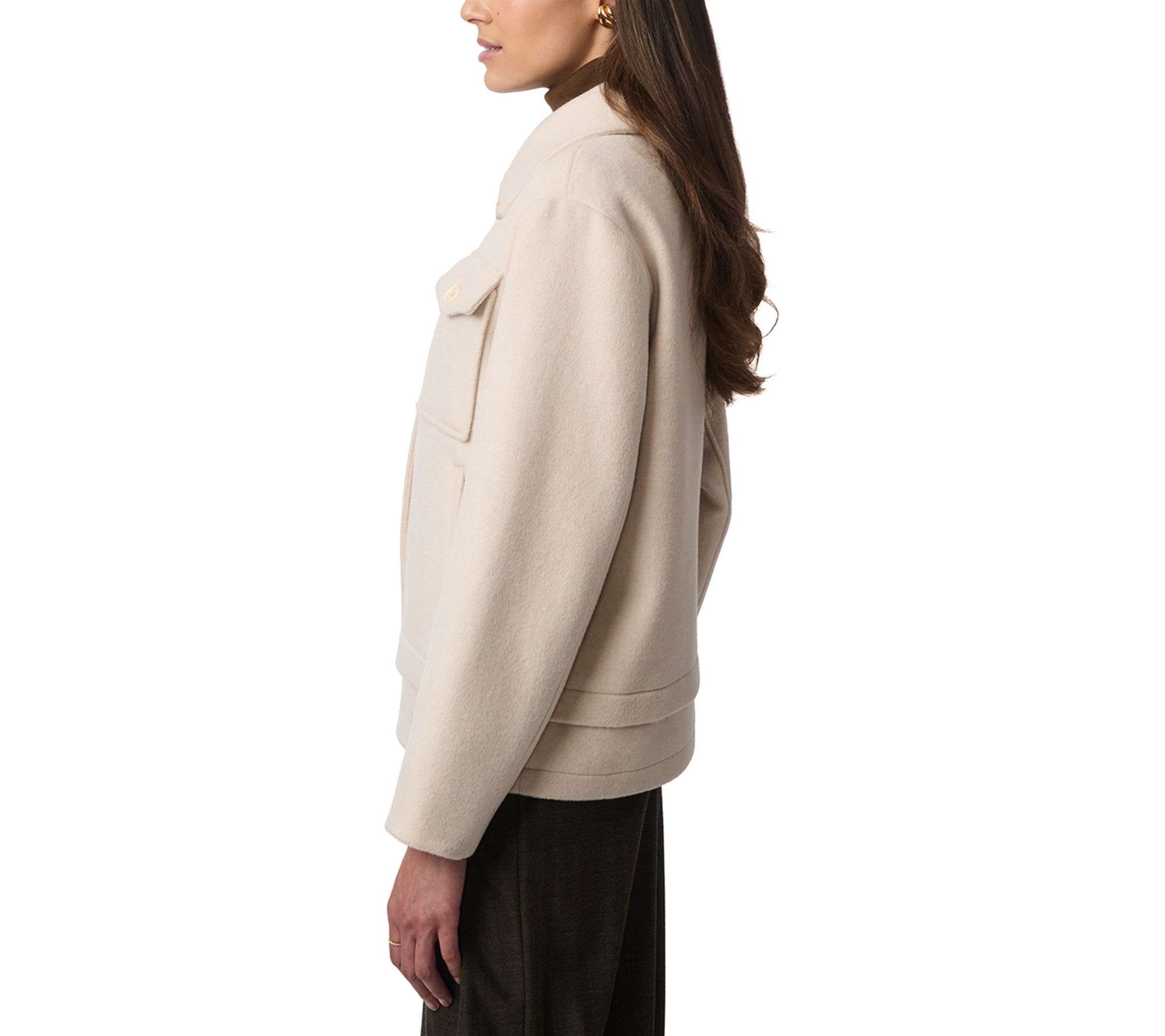 Elevate your fall/winter wardrobe with this chic Bernardo Metro Haven wool jacket. Perfect for layering, this hip-length coat offers an oversized fit, keeping you both comfy and stylish. Its practical patch pockets, concealed zipper, and button closures provide enhanced protection against the elements. Ideal for everything from morning commutes to weekend strolls. From Bernardo.
