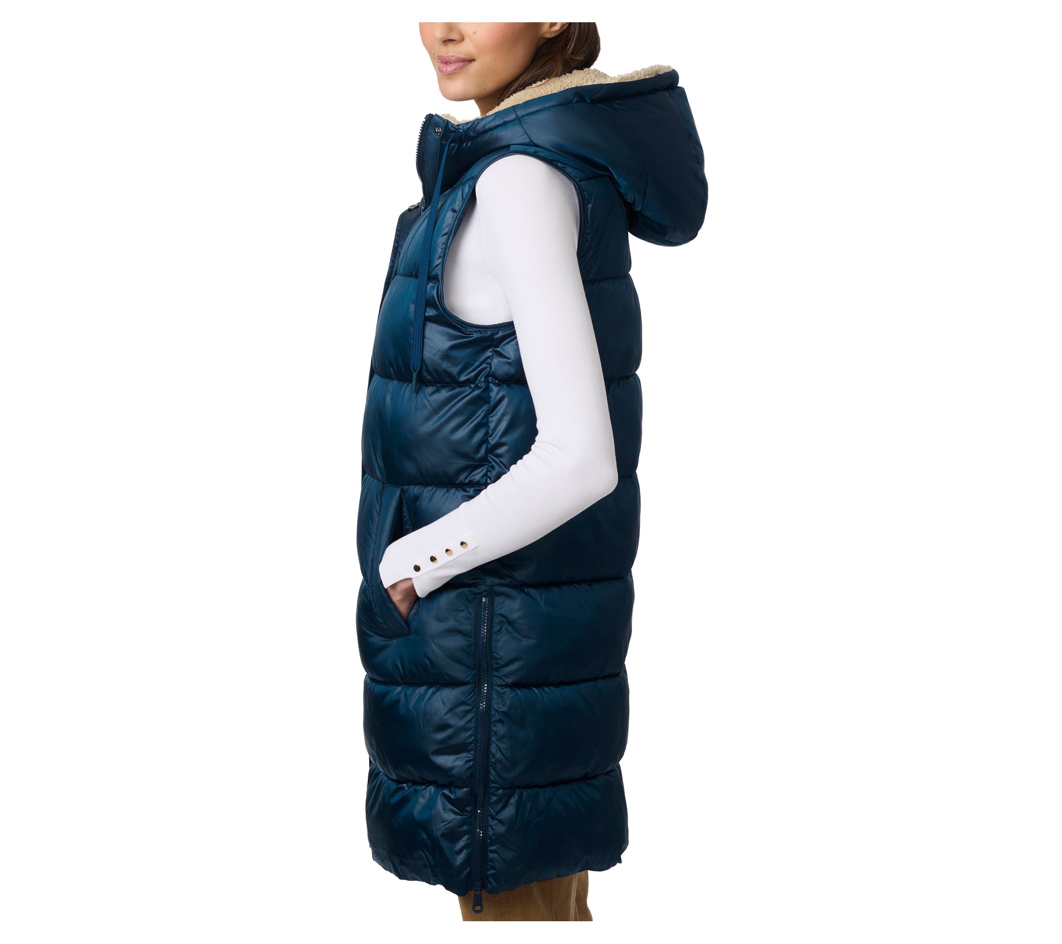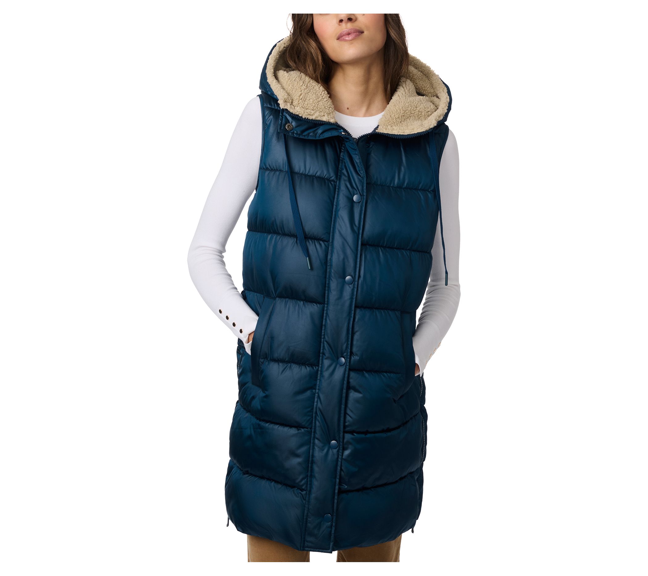 Cozy and stylish, this Bernardo mid-length puffer vest features a faux sherpa-lined hood for extra warmth. Perfect for chilly fall and winter days, this vest offers side zipper vents, a drawstring hood, and two front pockets for convenience. From Bernardo.