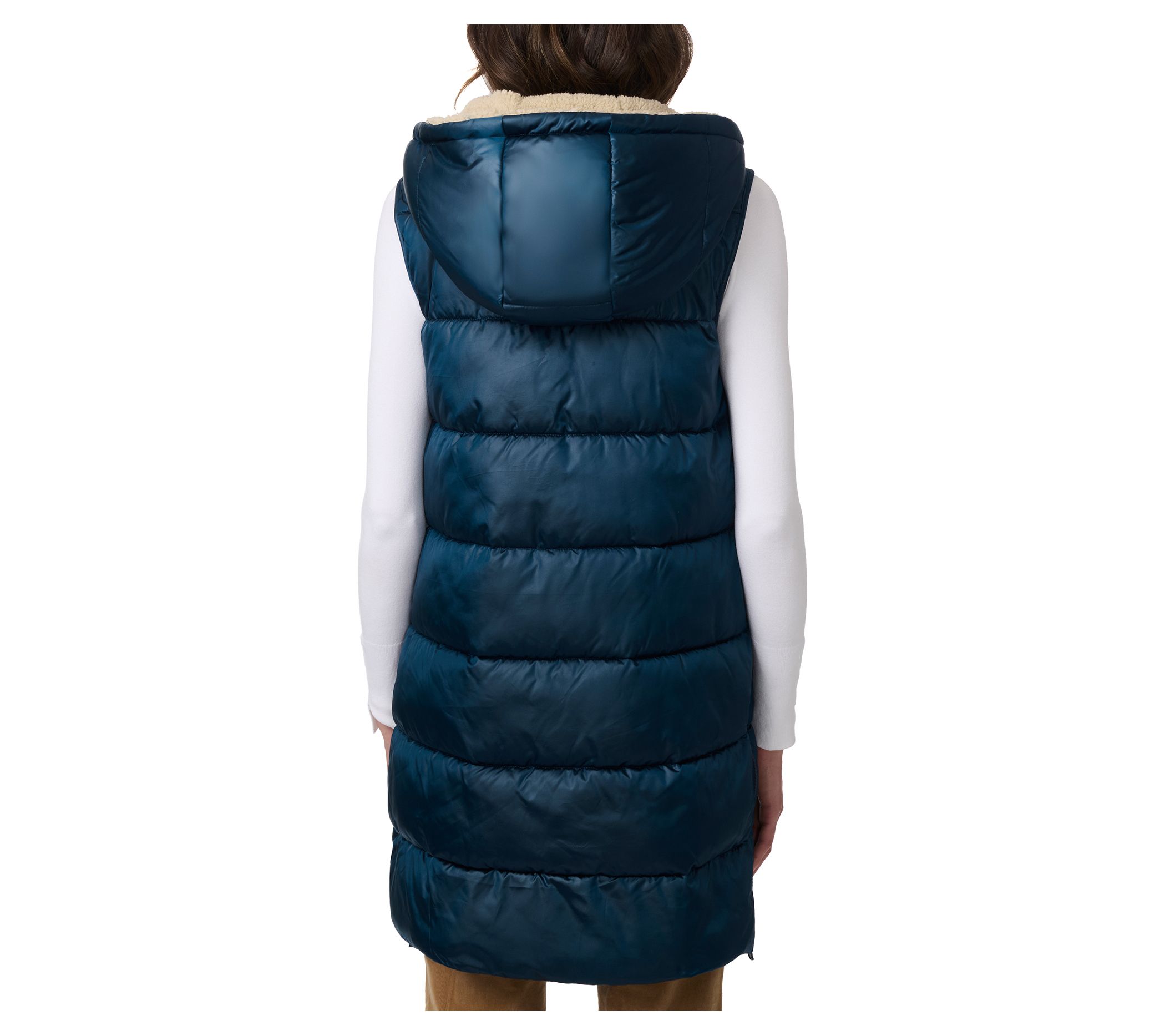 Features: faux sherpa-lined hood, side zipper vents, horizontal quilt lines, drawstring hood, two front pockets