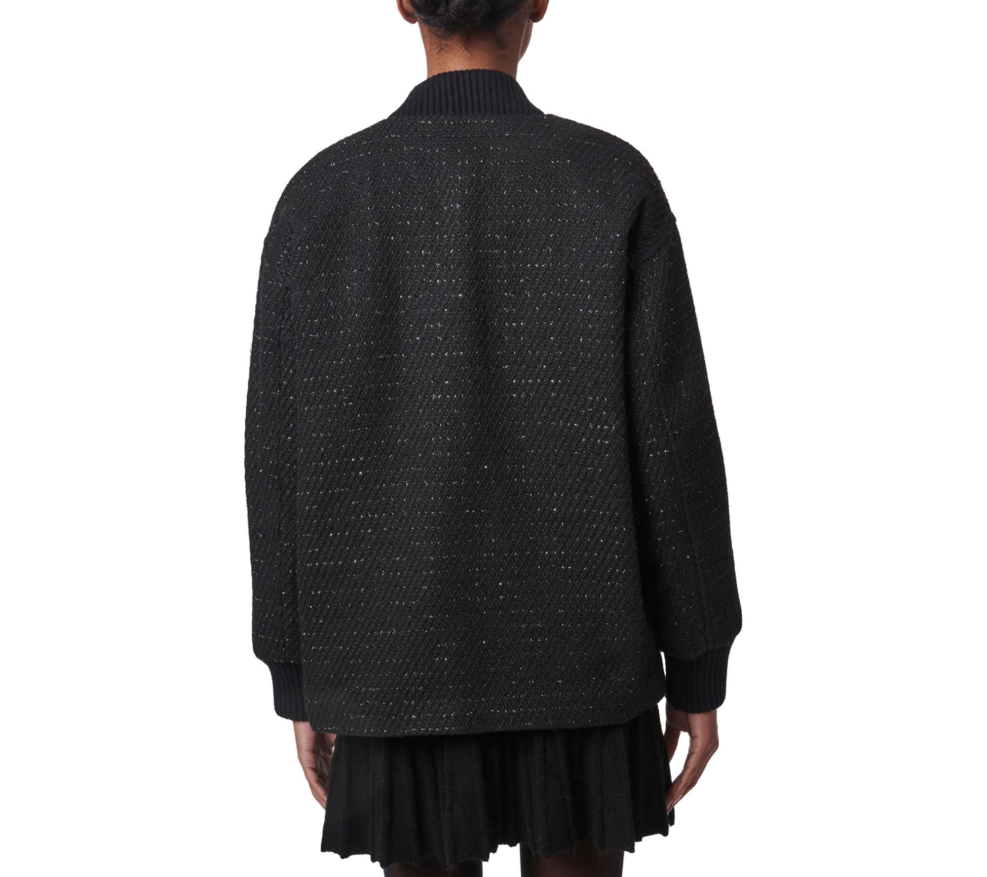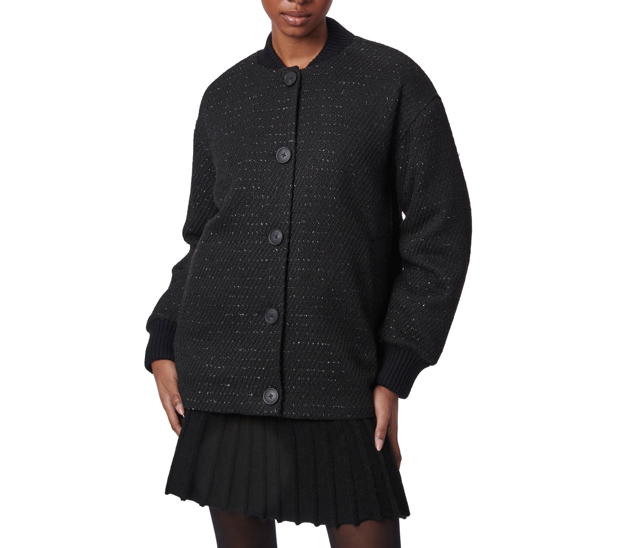 Turn heads wherever you go with the Midnight Shadow Bomber Jacket. The oversized design and diagonal lurex tweed pattern create a standout look that's perfect for adding a chic layer on cool fall or winter days. With a cozy ribbed collar and cuffs, plus a convenient button-up closure, this piece promises both style and comfort. From Bernardo.