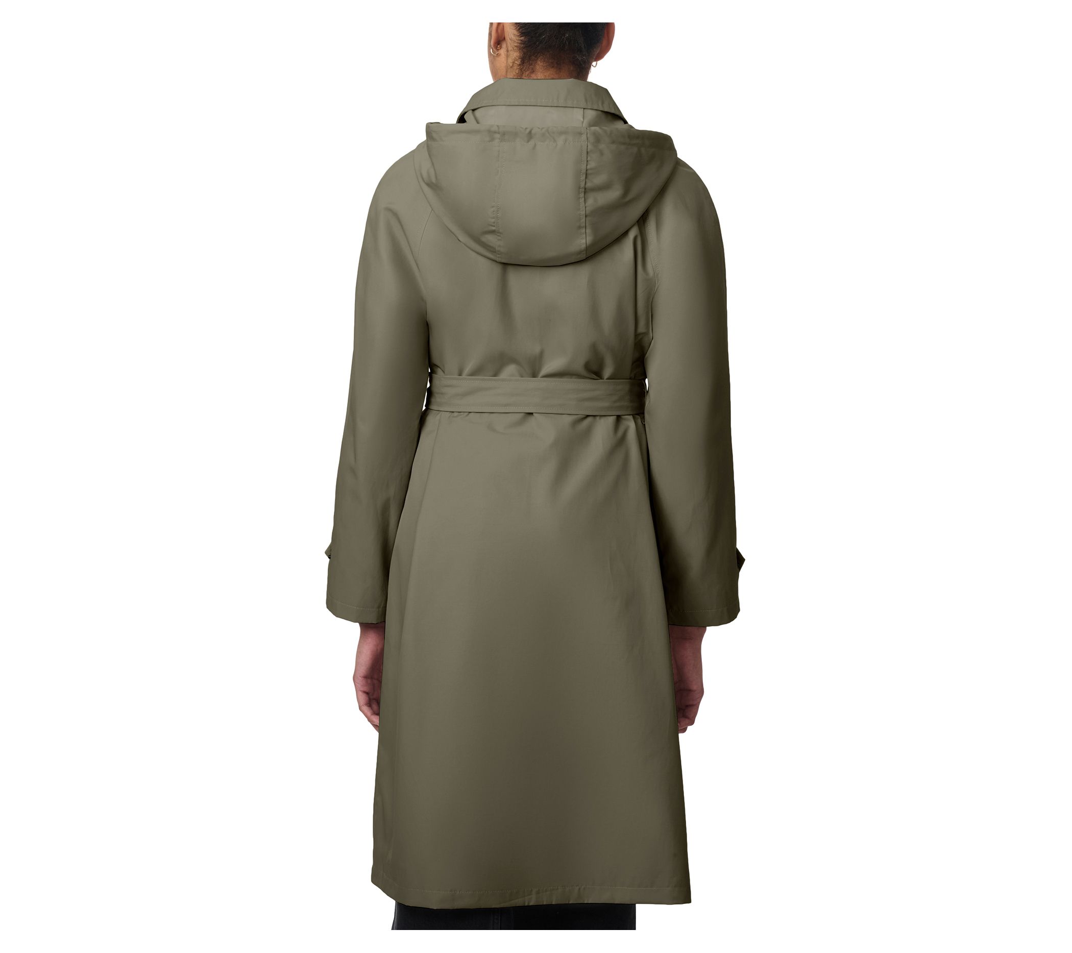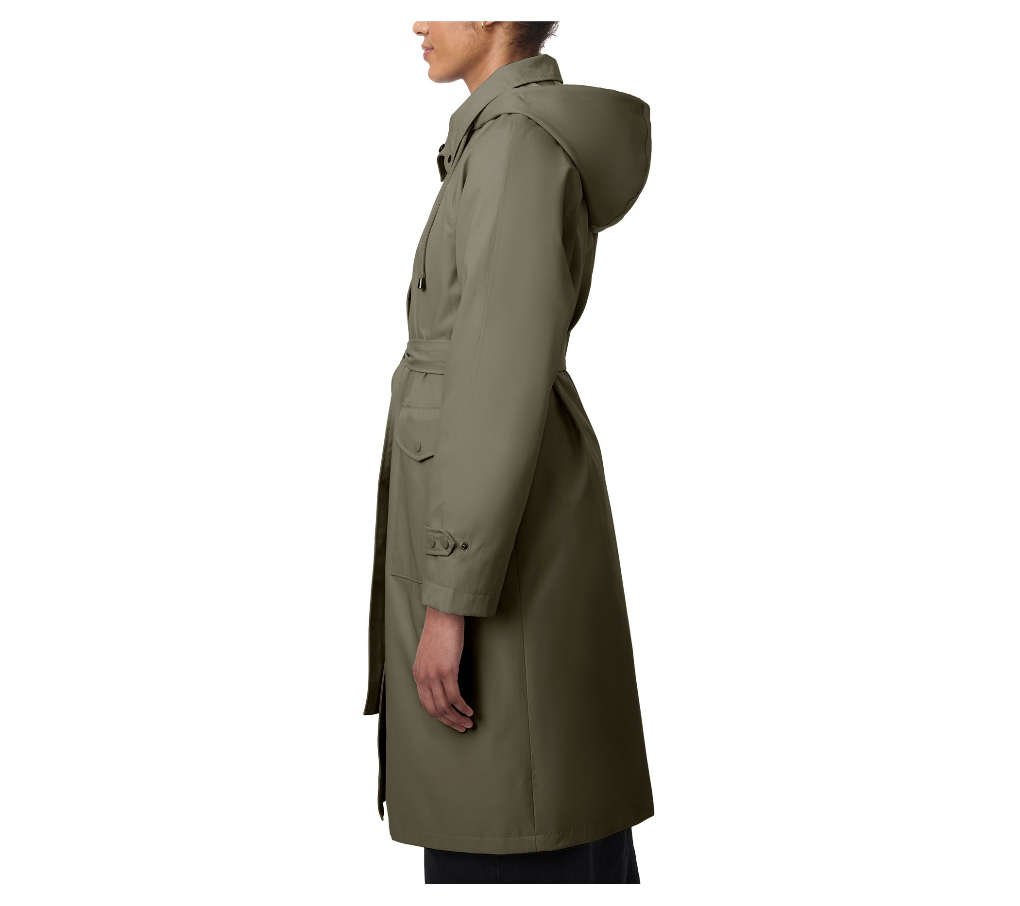 Features: stand collar, drawcord hood, patch pockets with side entry, tie waist belt, snap tabs at sleeve cuffs