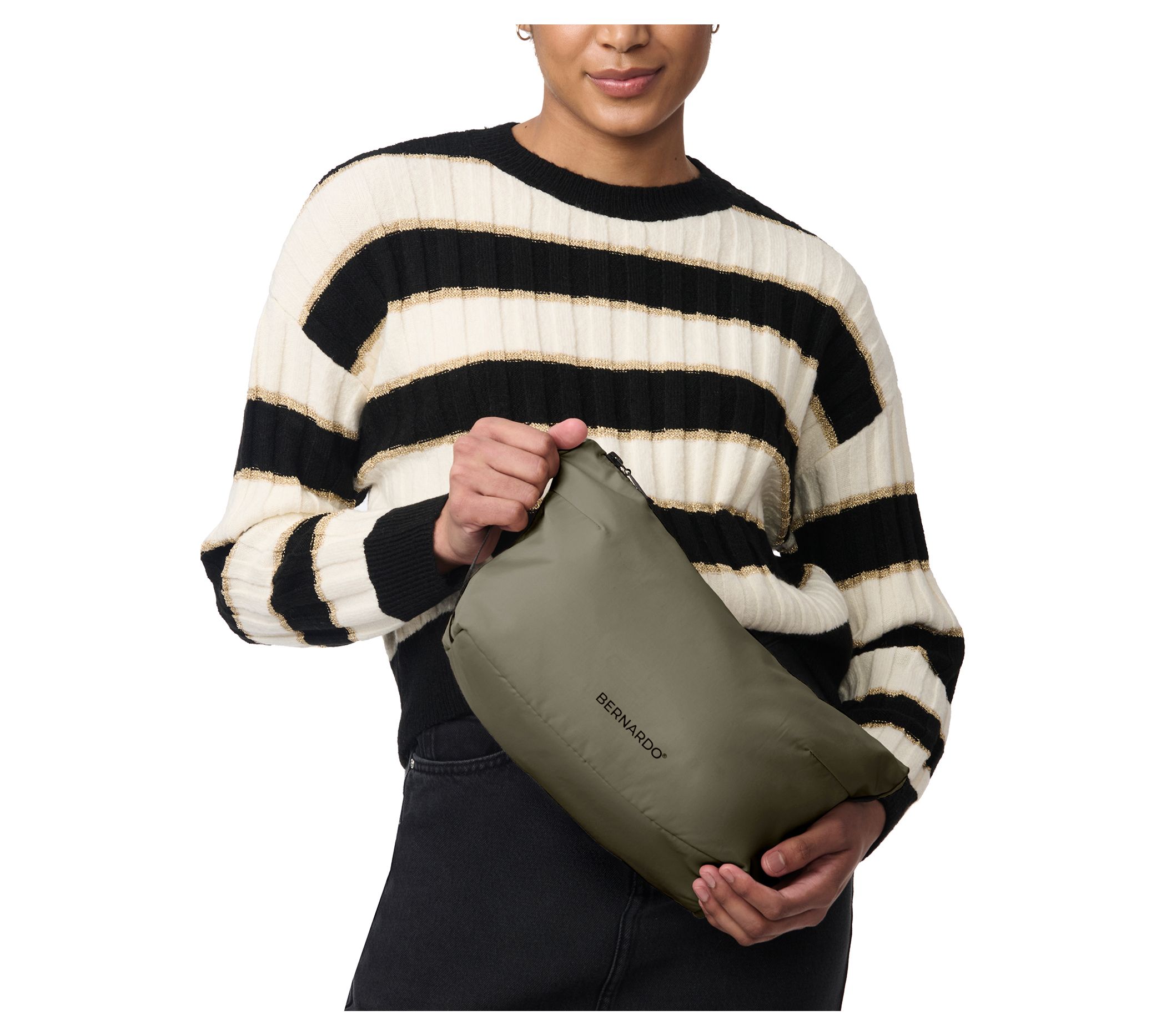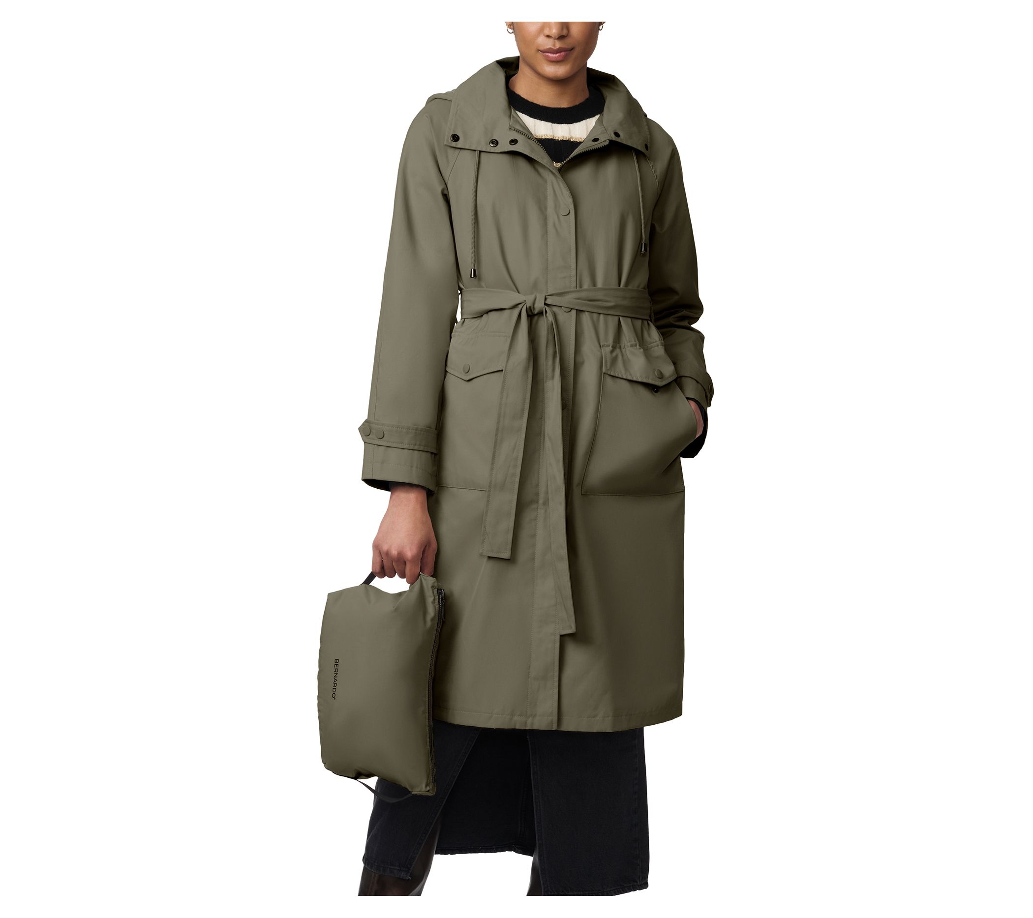 Designed to be travel-friendly, this Bernardo packable belted trench coat boasts a stand collar, drawcord hood, and patch pockets with side entry. Plus, the knee-length style comes with its own bag for easy packing. From Bernardo.