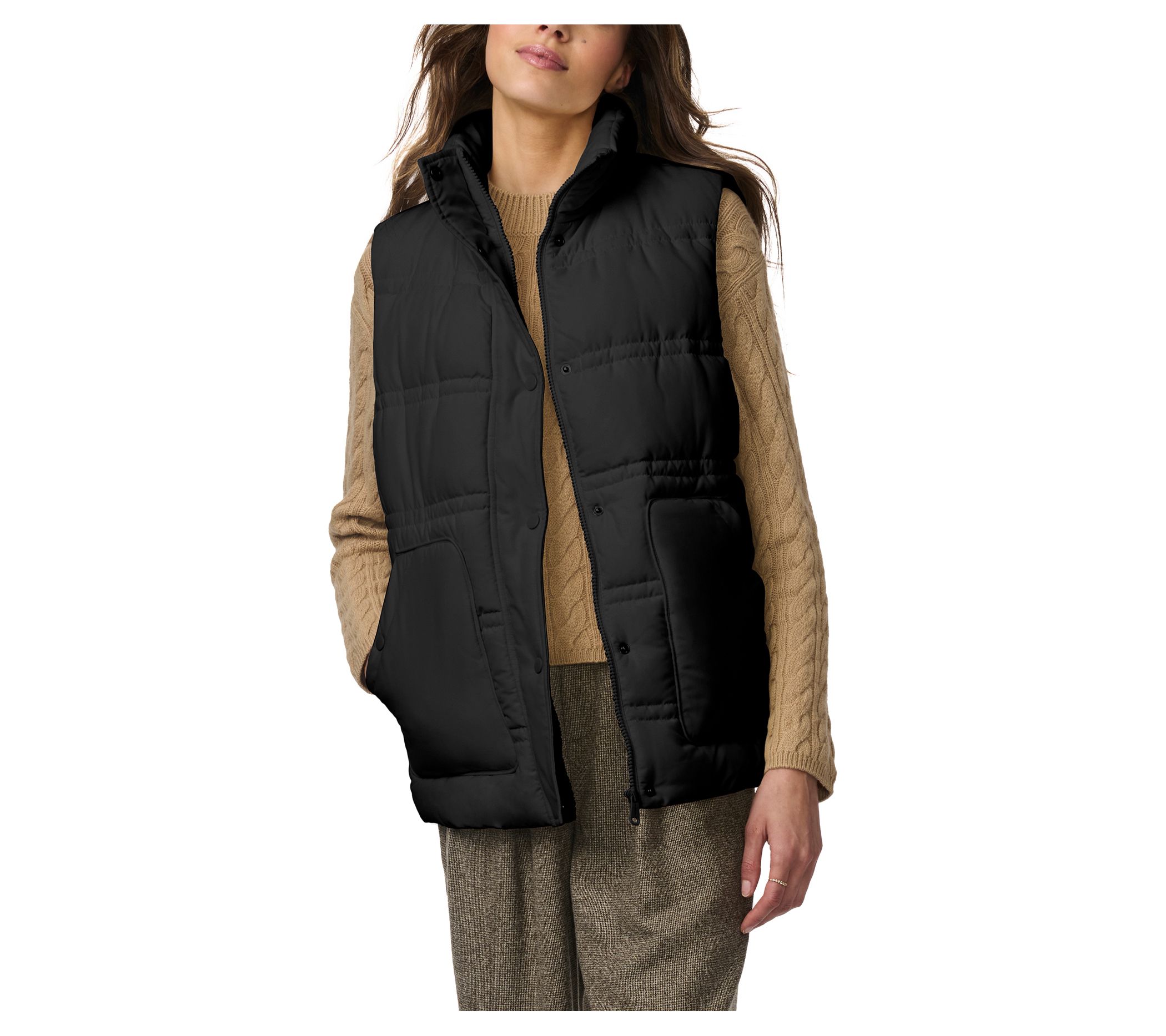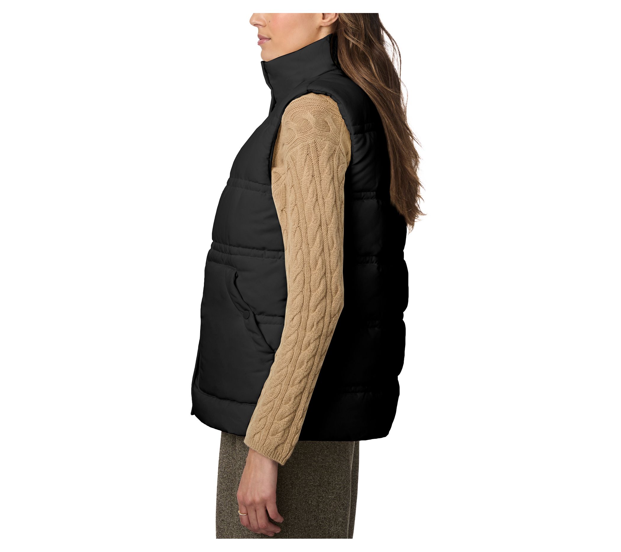 • Features: boxy puffer vest, double-stitched horizontal quilt lines, side-entry patch pockets, stand collar