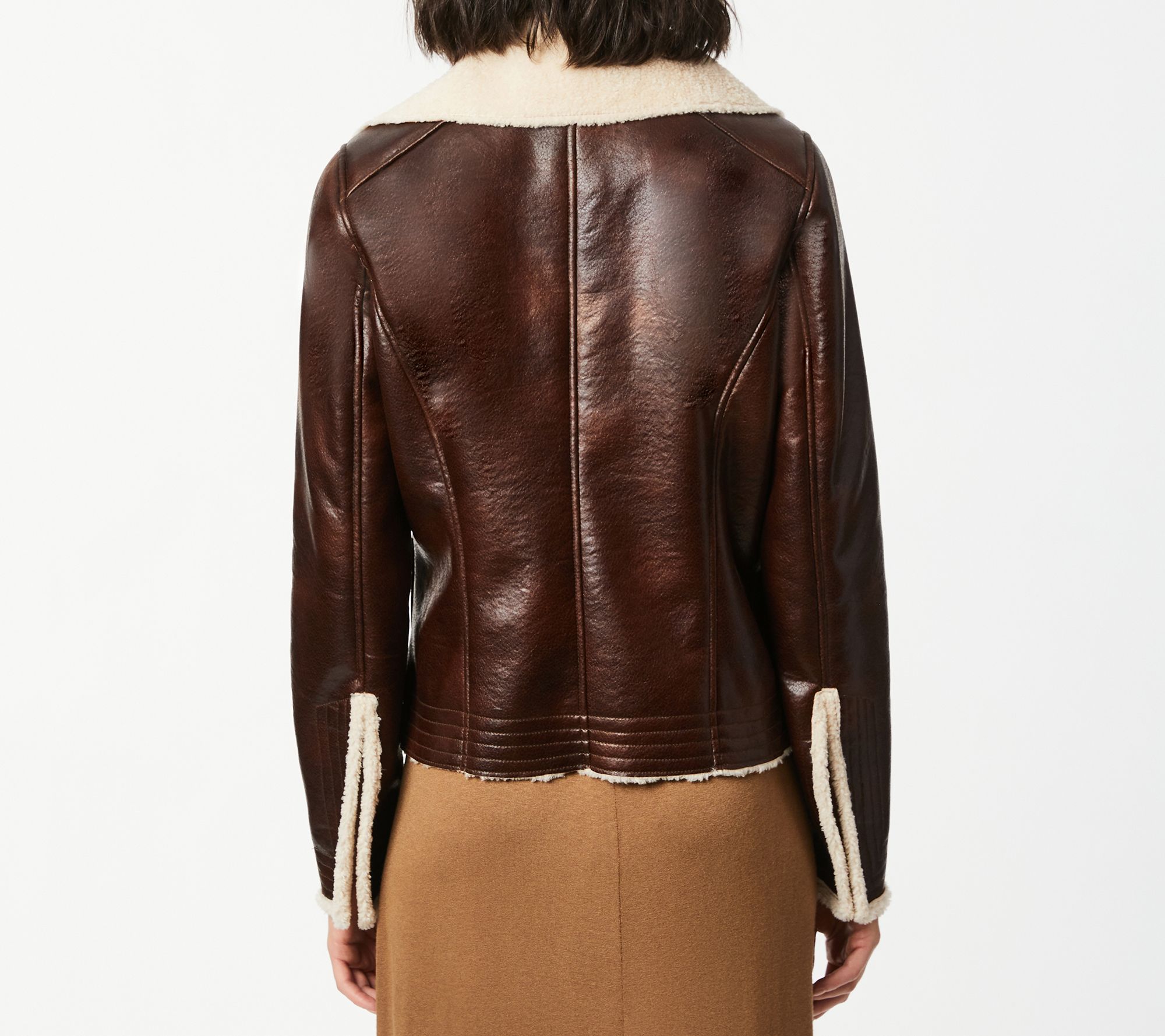 • Features: asymmetrical moto style, snap welt pockets, fur trims, slits at cutf