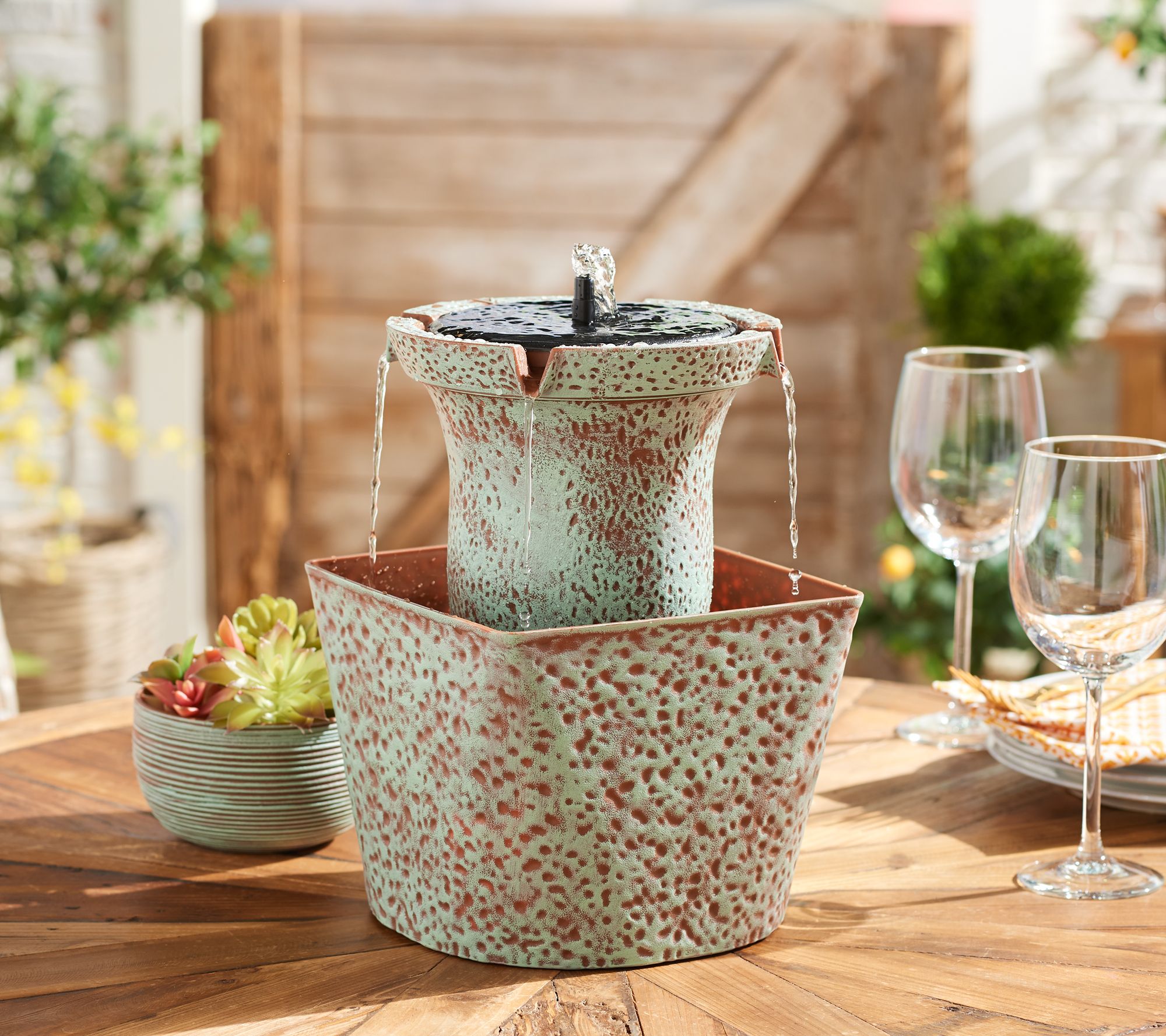 It's designed to appeal to all tastes and can be configured for a modern vibe or for a more traditional look. Four dancing spray tips get the tranquility trickling in varying patterns. An optional section can be used as a bird feeder or a self-watering planter to top the battery-operated fountain.