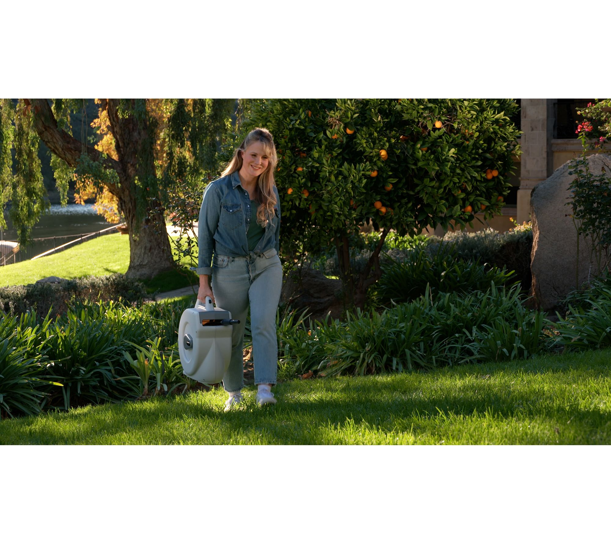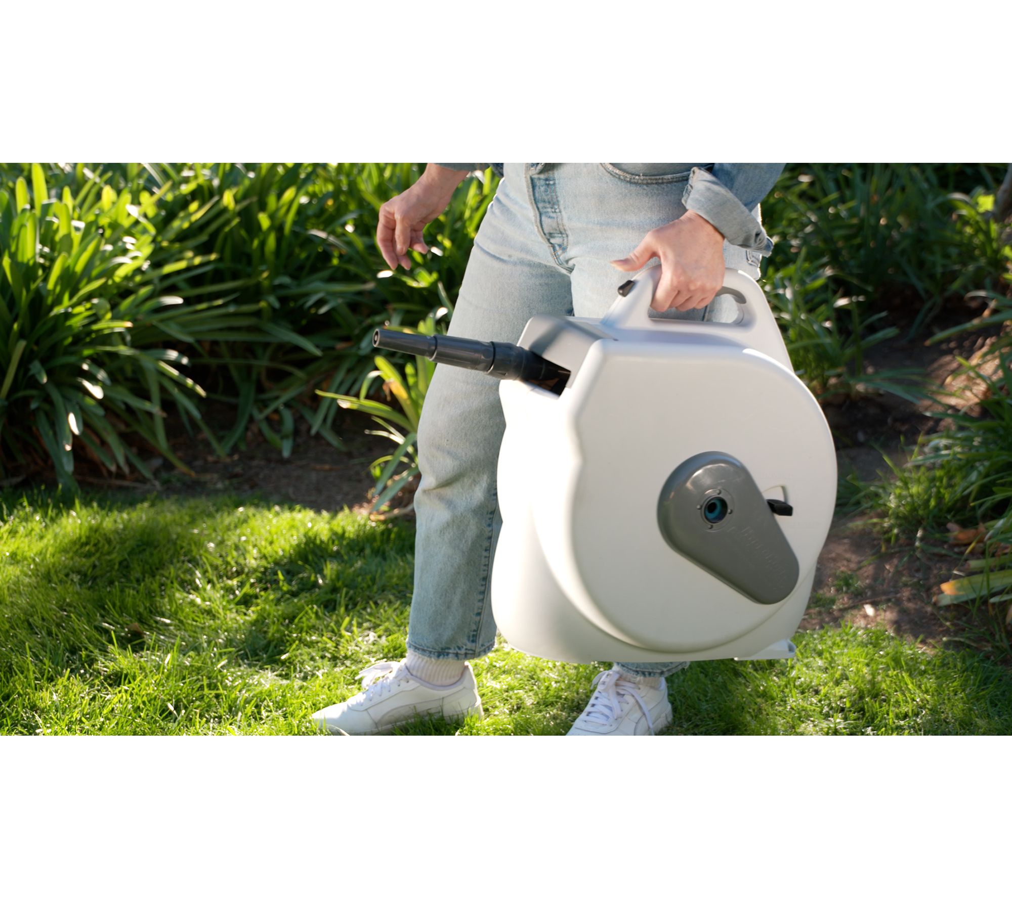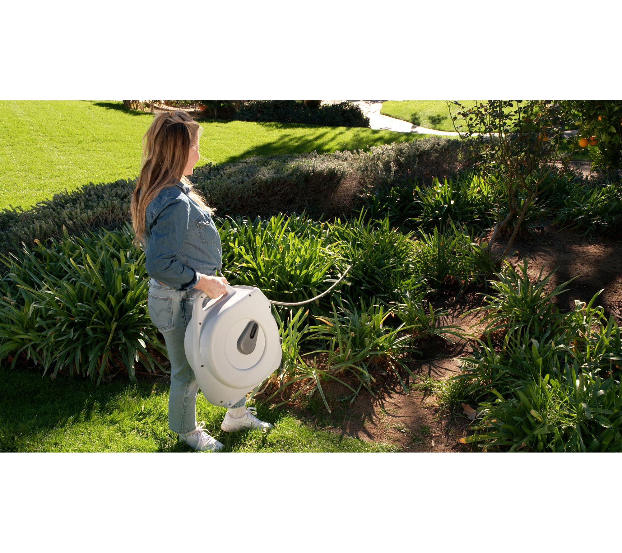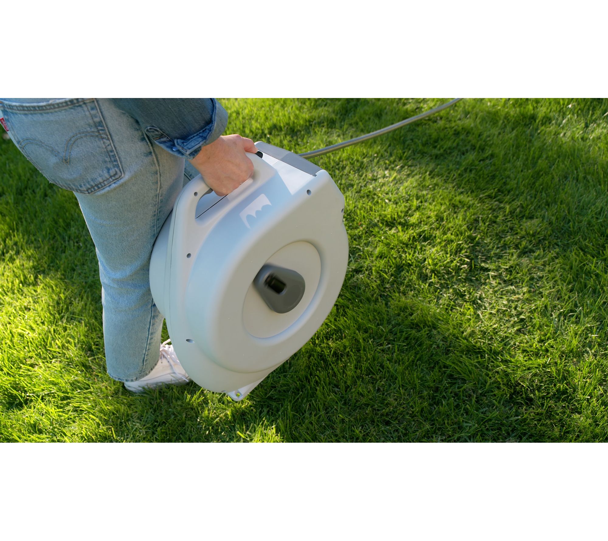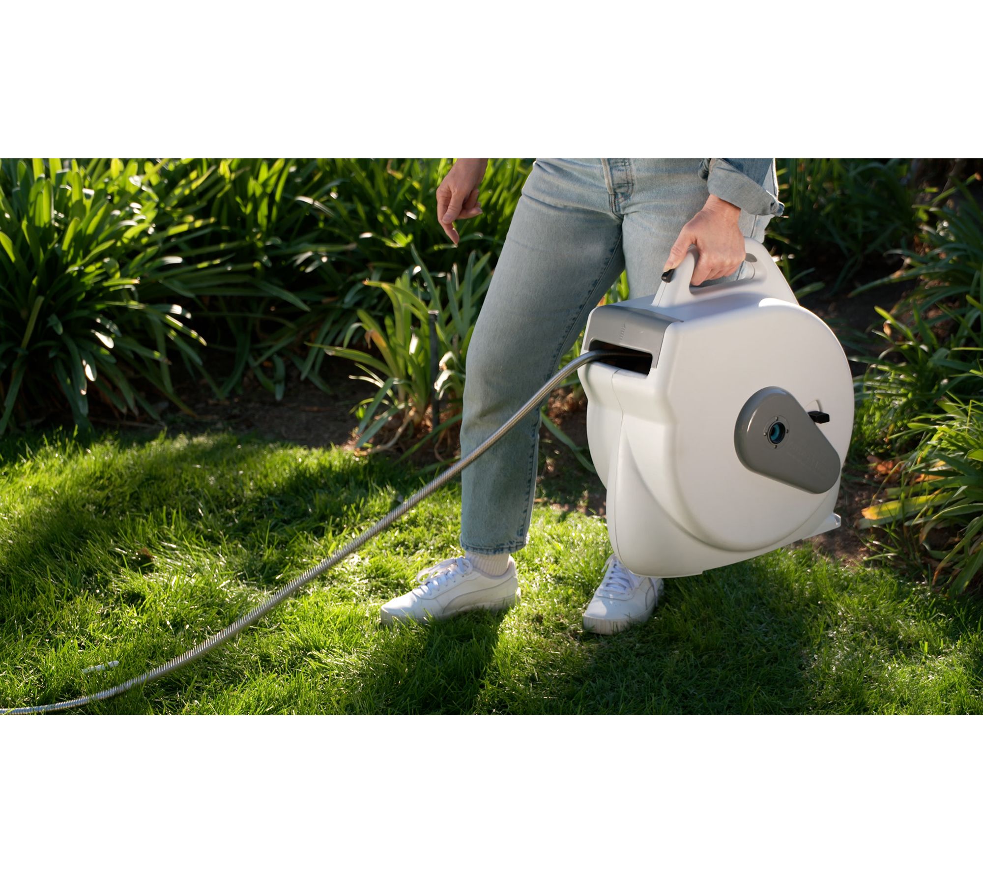 Take it all back. Keep your outdoor space neat and tidy with this automatic garden hose rewinder set that takes the hassle out of winding up after a long day in the yard. The rechargeable, lightweight design means you can easily store and unwind the included no-kink Bernini Garden Hose -- plus, the set comes with a fireman hose nozzle for a quick switch between watering and cleaning. From Bernini.